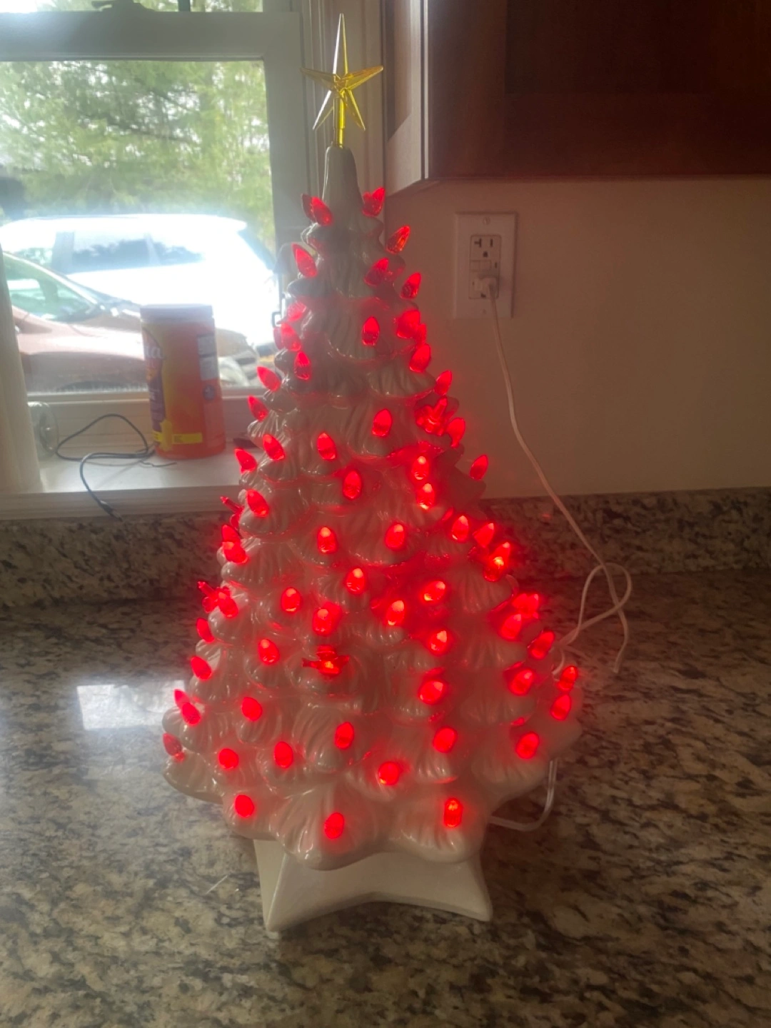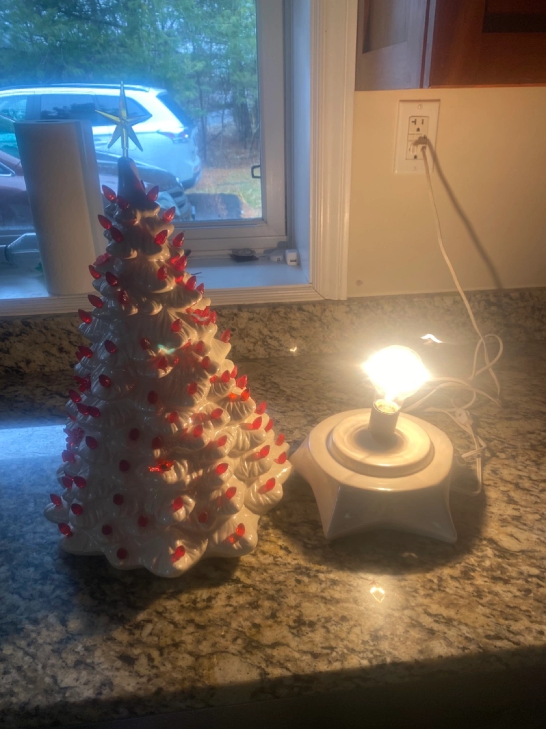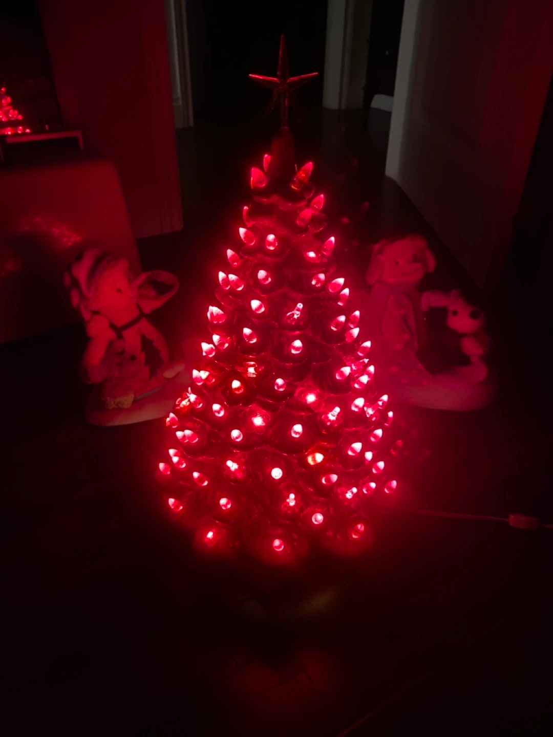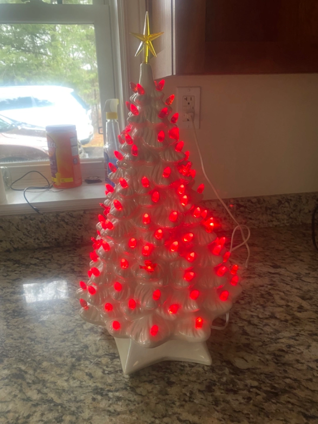 Beautiful vintage ceramic Christmas tree. Features red lightbulbs. Includes separate base. Perfect holiday decor. Has butterflies birds and bulbs . Pick up Port Elmsley