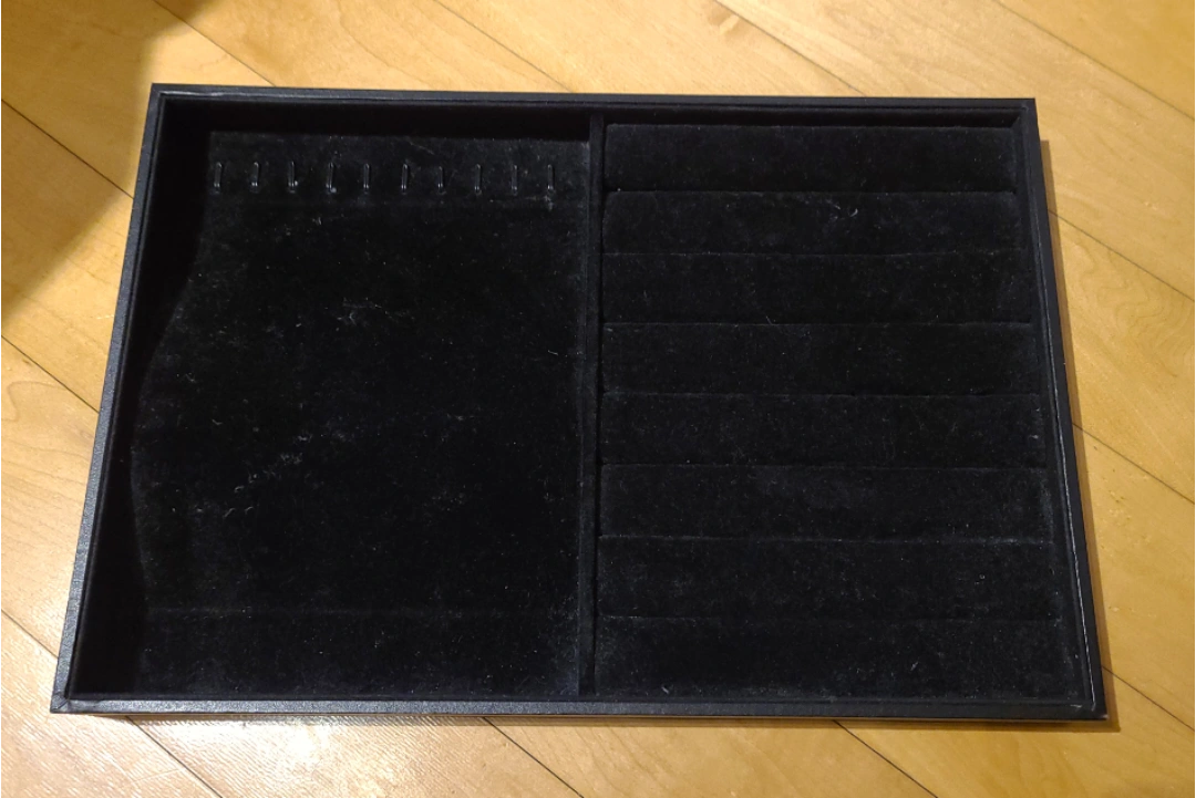 Black rectangular tray with a soft, velvet lining. Sections for rings and necklaces. Great for organizing jewellery. Organizer contains 7 rows of rings and 10 necklaces. Only available for pick-up in North York.