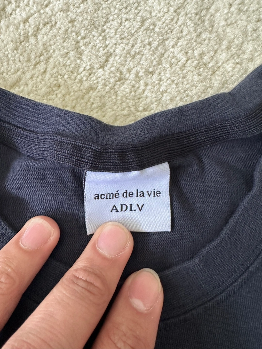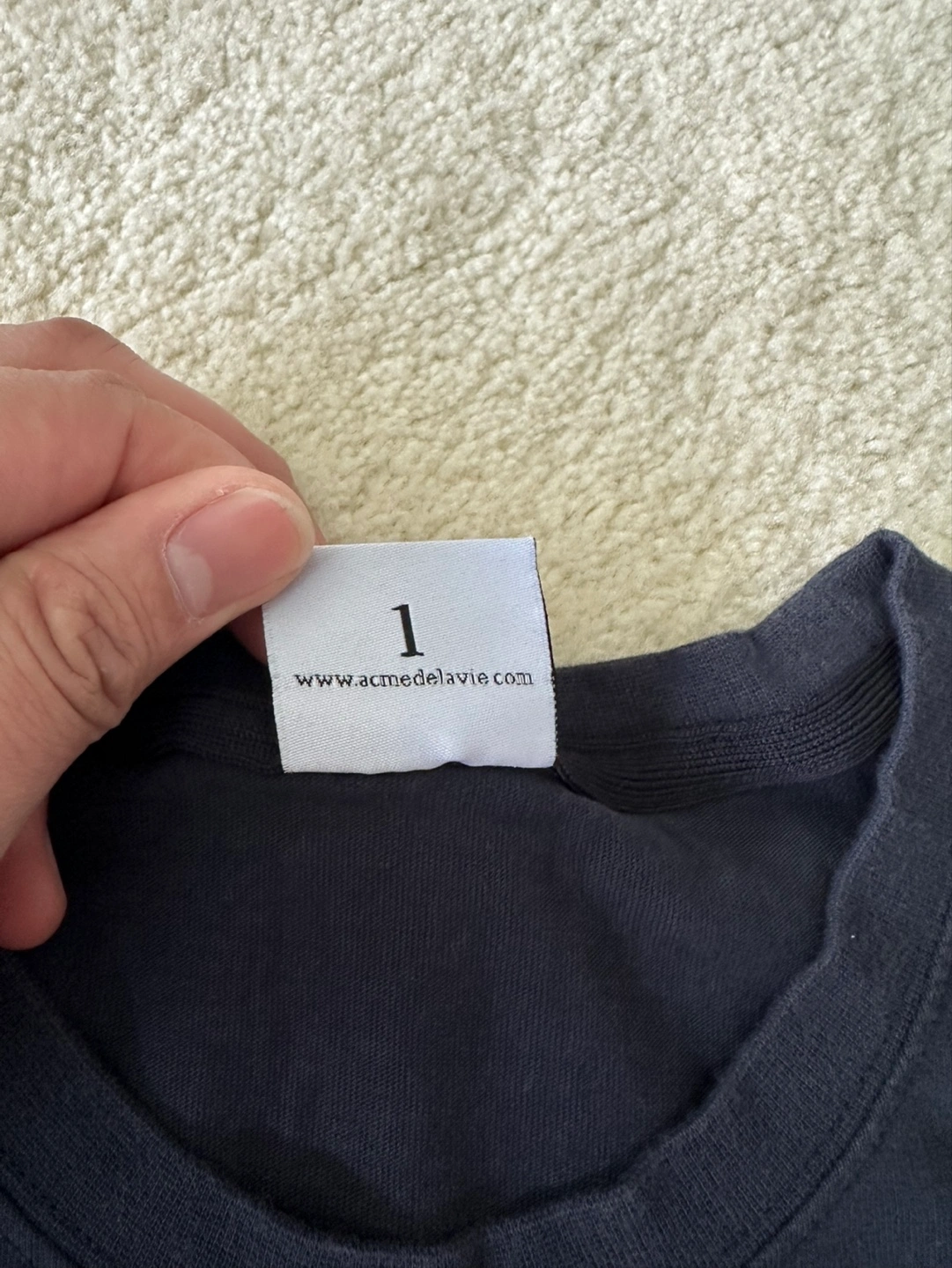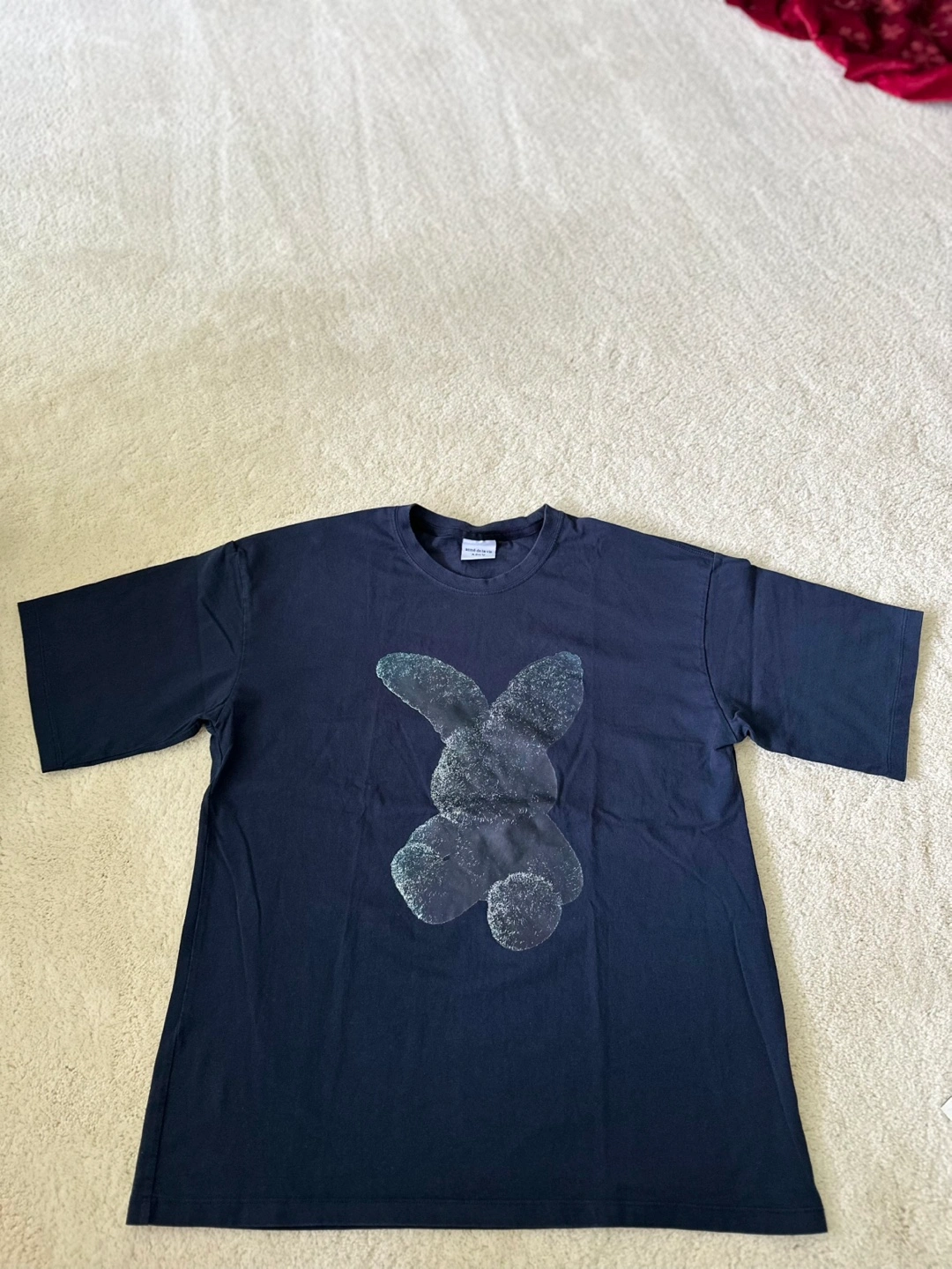 Dark navy blue short sleeve t-shirt. Features a dark grey fuzzy bunny graphic. Size 1. Excellent condition.