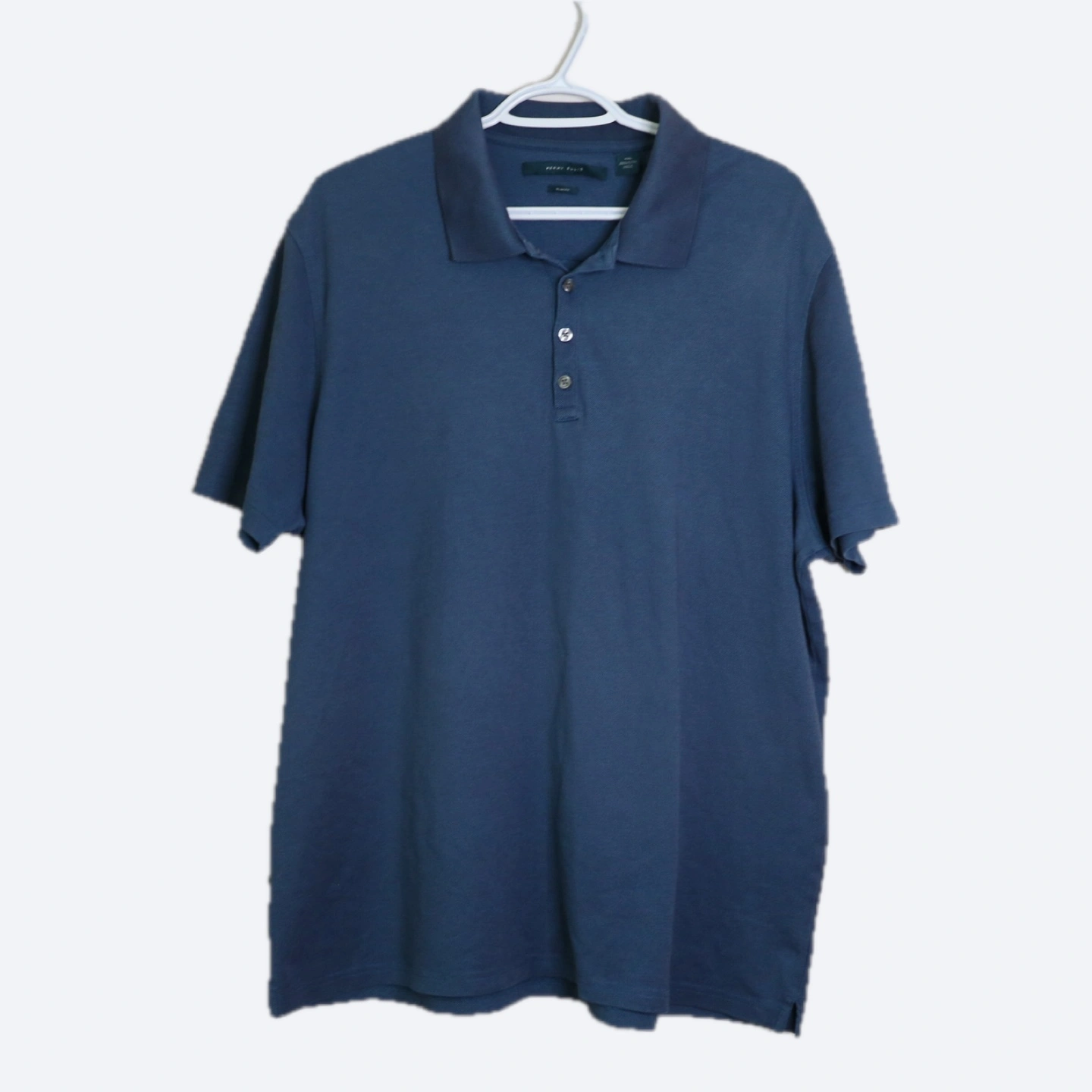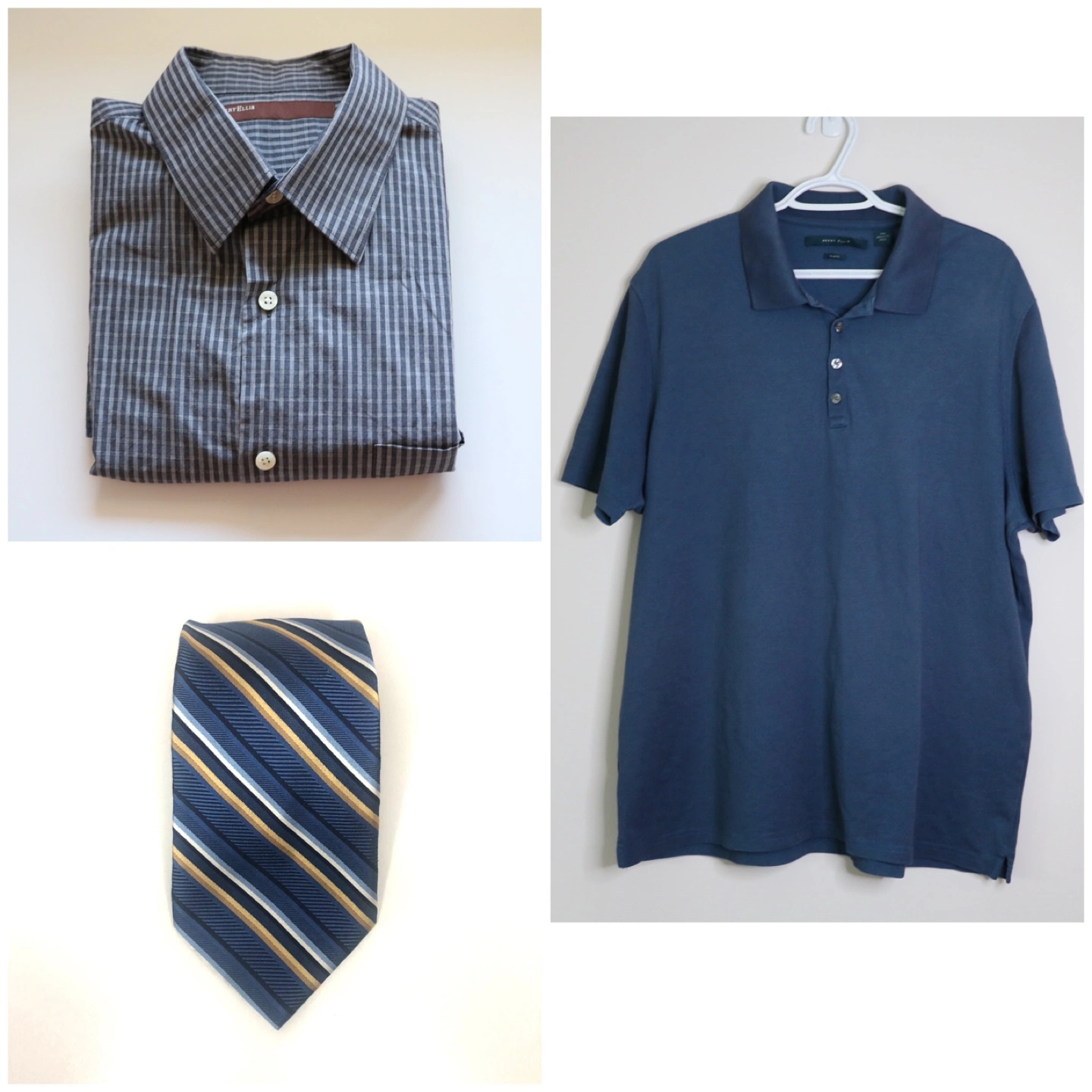 Bundle includes a men's medium dress shirt, a XXL polo shirt, and a striped tie. Blue colour scheme. Great for work or casual wear.