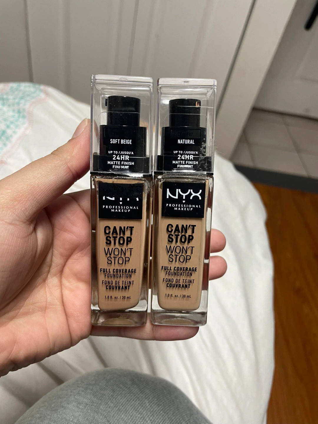 Two bottles of NYX Professional Makeup Can't Stop Won't Stop foundation. Shades: Soft Beige and Natural. Full coverage, matte finish. 30 mL each. $20 both