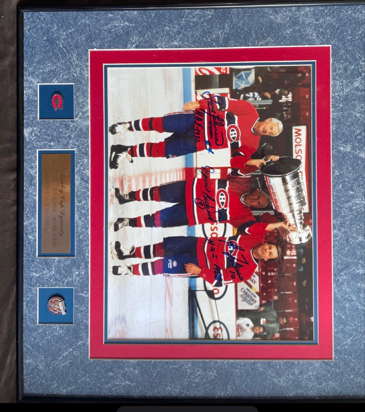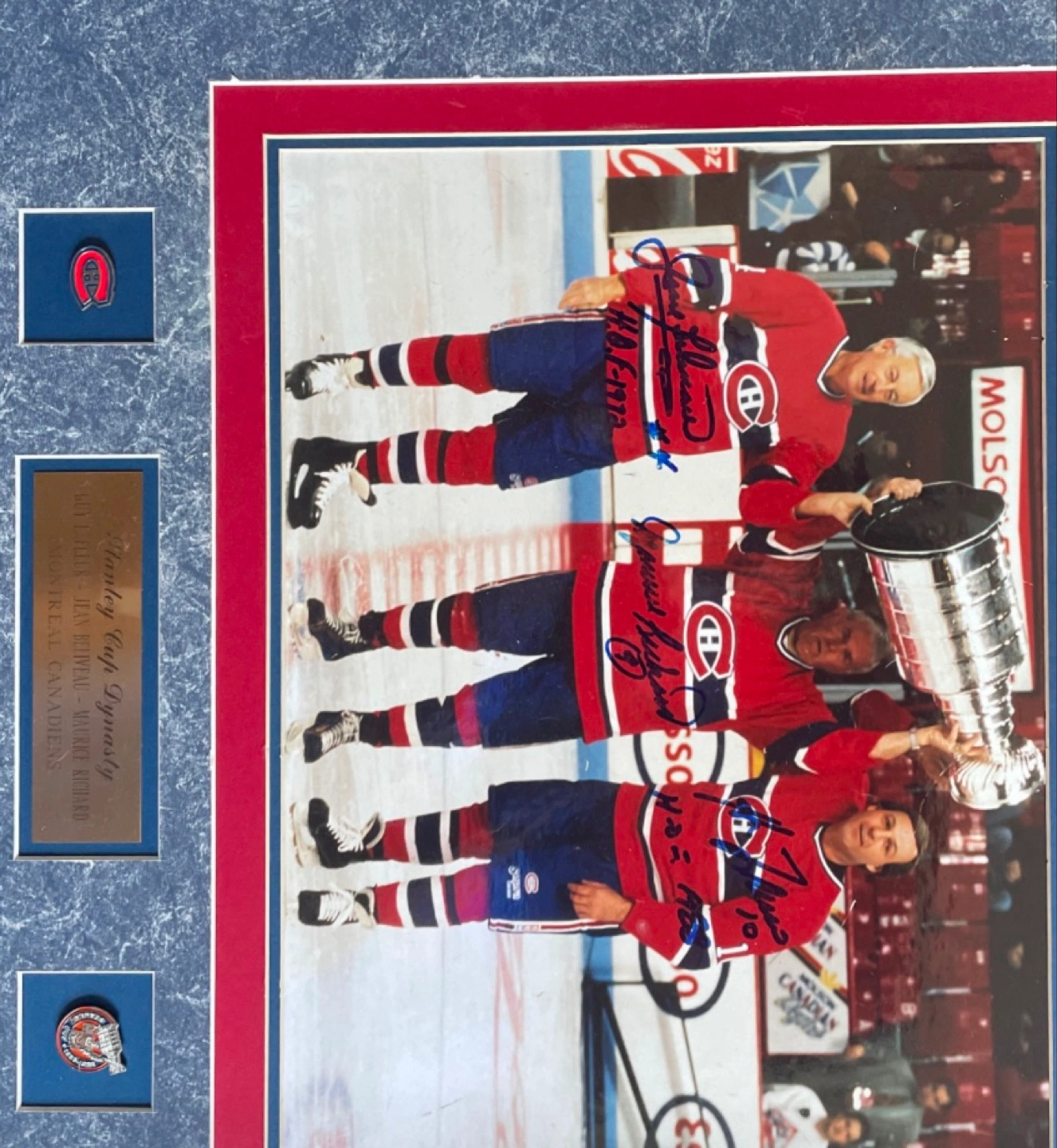 Framed photo of three Montreal Canadiens players with the Stanley Cup. Includes signatures and small Canadiens logos. Celebrating a championship victory. Guy Lafleur, Jean Béliveau, Maurice Richard