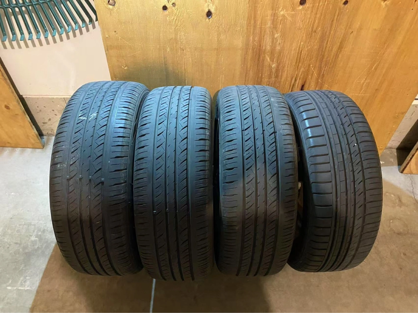 Set of four 16-inch alloy wheels with tires. 195/55/16. Only used for half a season. Certified all season tires 95% thread Mounted and balanced on aluminum alloy wheels Canadian tire certified, brand is called Alltrek No patches or plugs Previously off Hyundai Elantra Previously purchased tires from Canadian tire for over $800 couple months ago. OEM aluminum wheels from Hyundai worth atleast $400. Suitable for Hyundai Elantra GT. Includes winter and all-season tires.