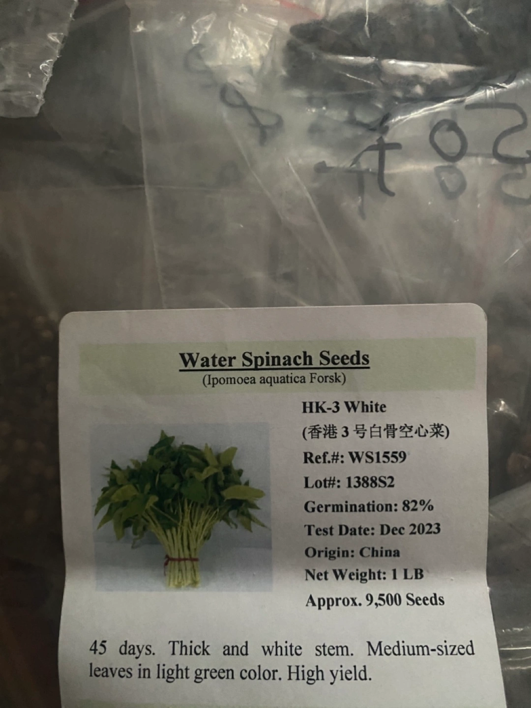 Bag of water spinach seeds. Approximately 50+ seeds.