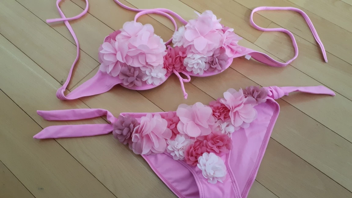 New Adorable pink two-piece swimsuit. Features 3D floral embellishments. Adjustable straps. Great for summer.