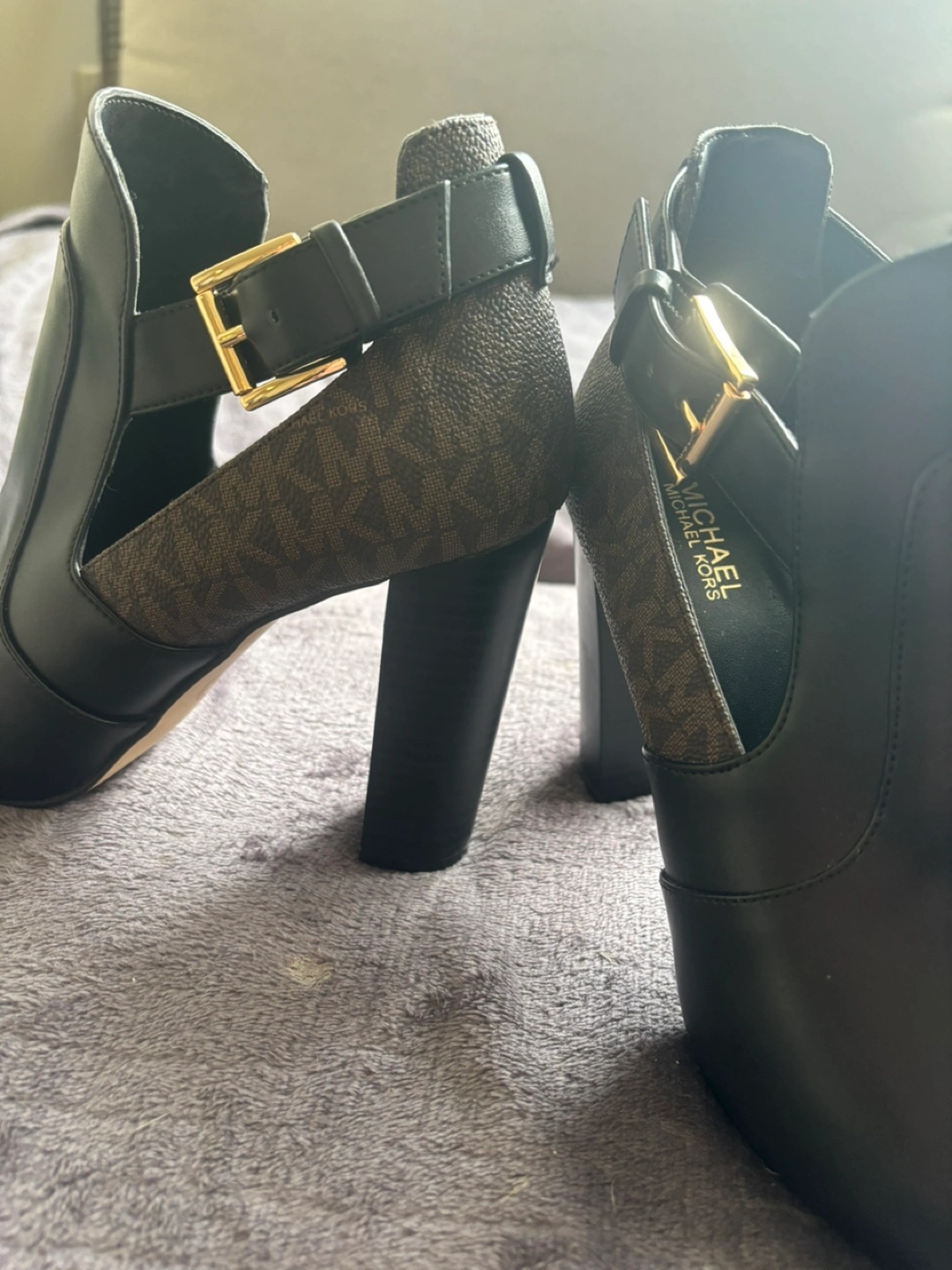 Stylish black booties. Cut-out design. High block heel. Brown MK logo detail. Size 8M.