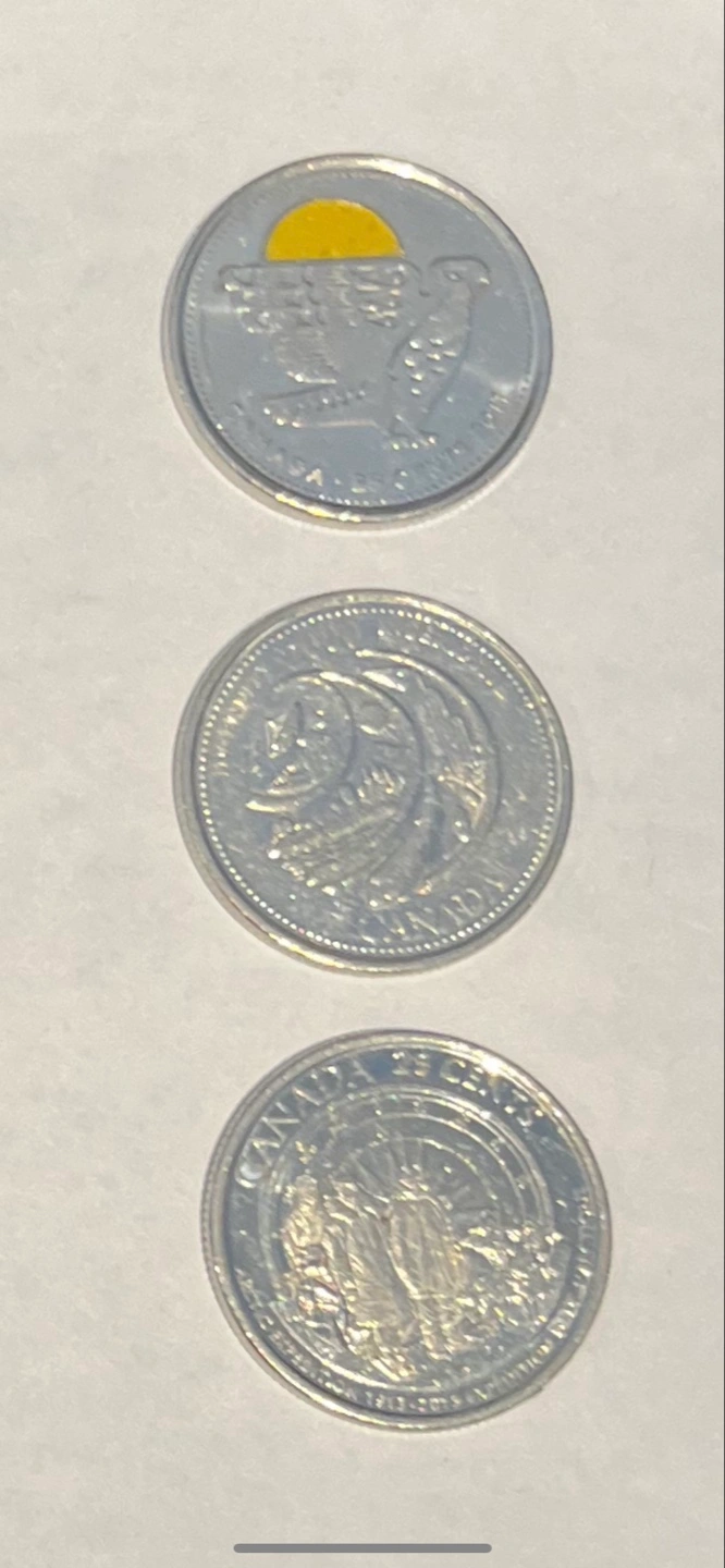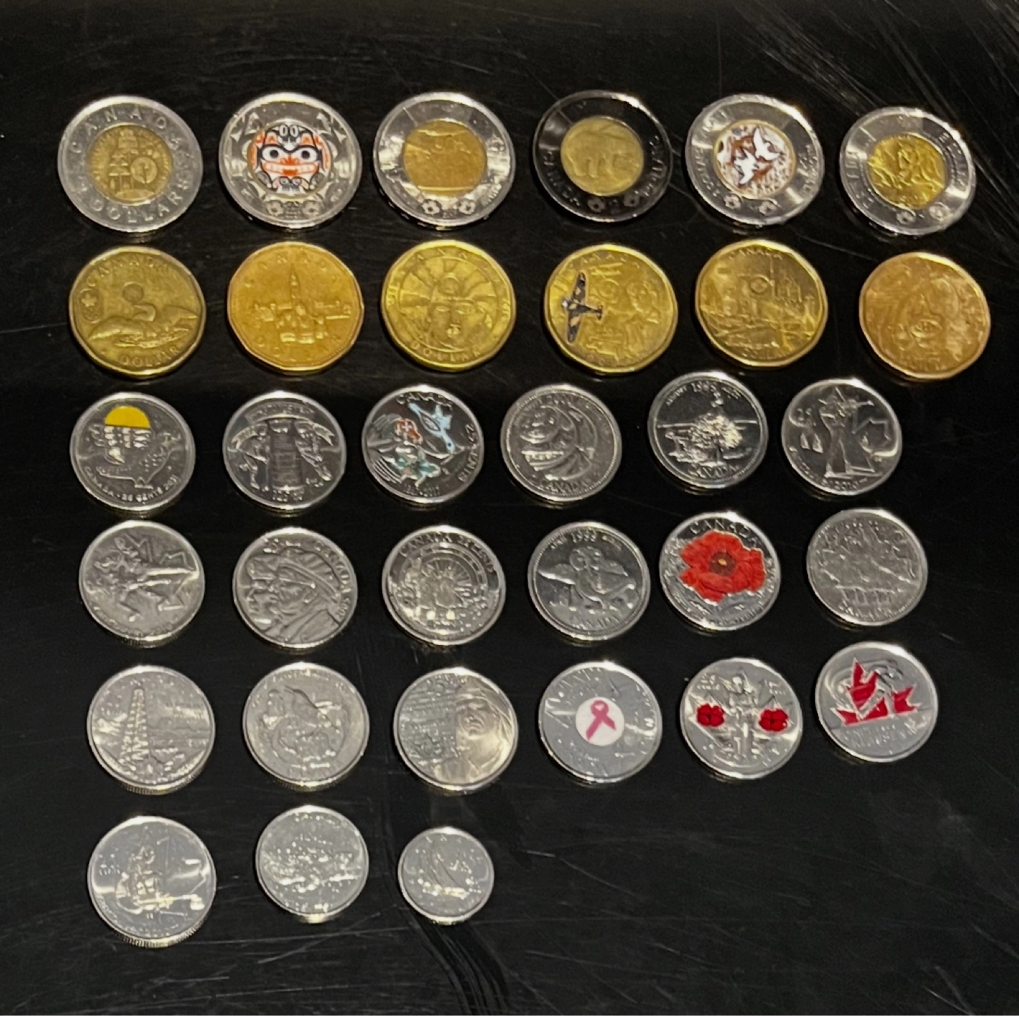 Large collection of Canadian $2, $1, $0.25, $0.10, and $0.05 coins. Various designs and years. Great for collectors.