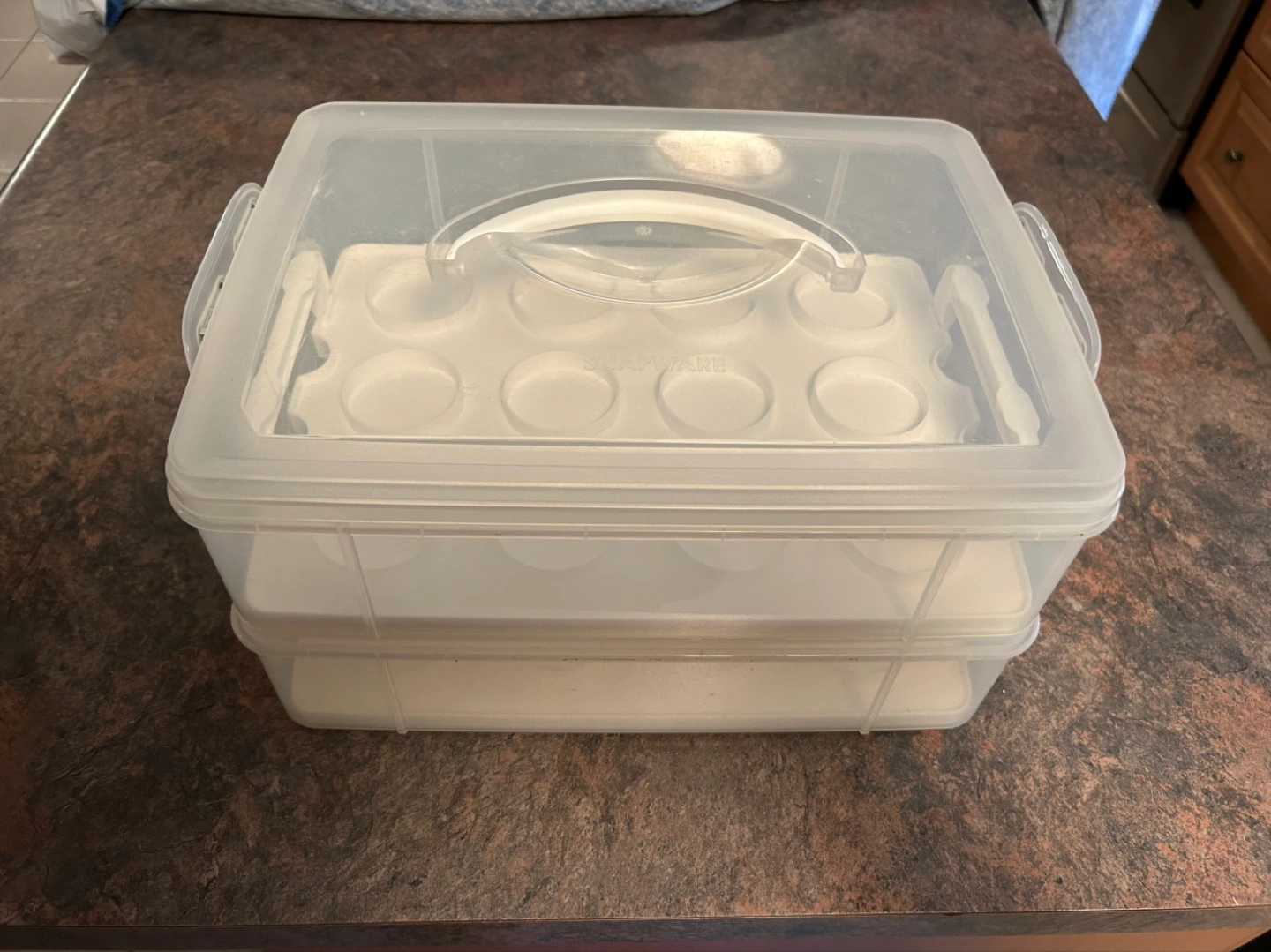 Stackable cupcake carrier. Two levels, twelve cups each. Clear plastic with white inserts. Convenient handles for carrying.