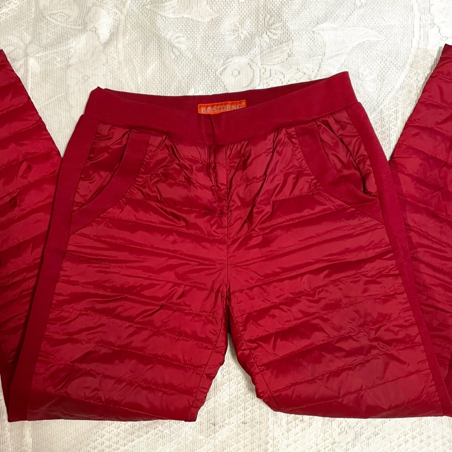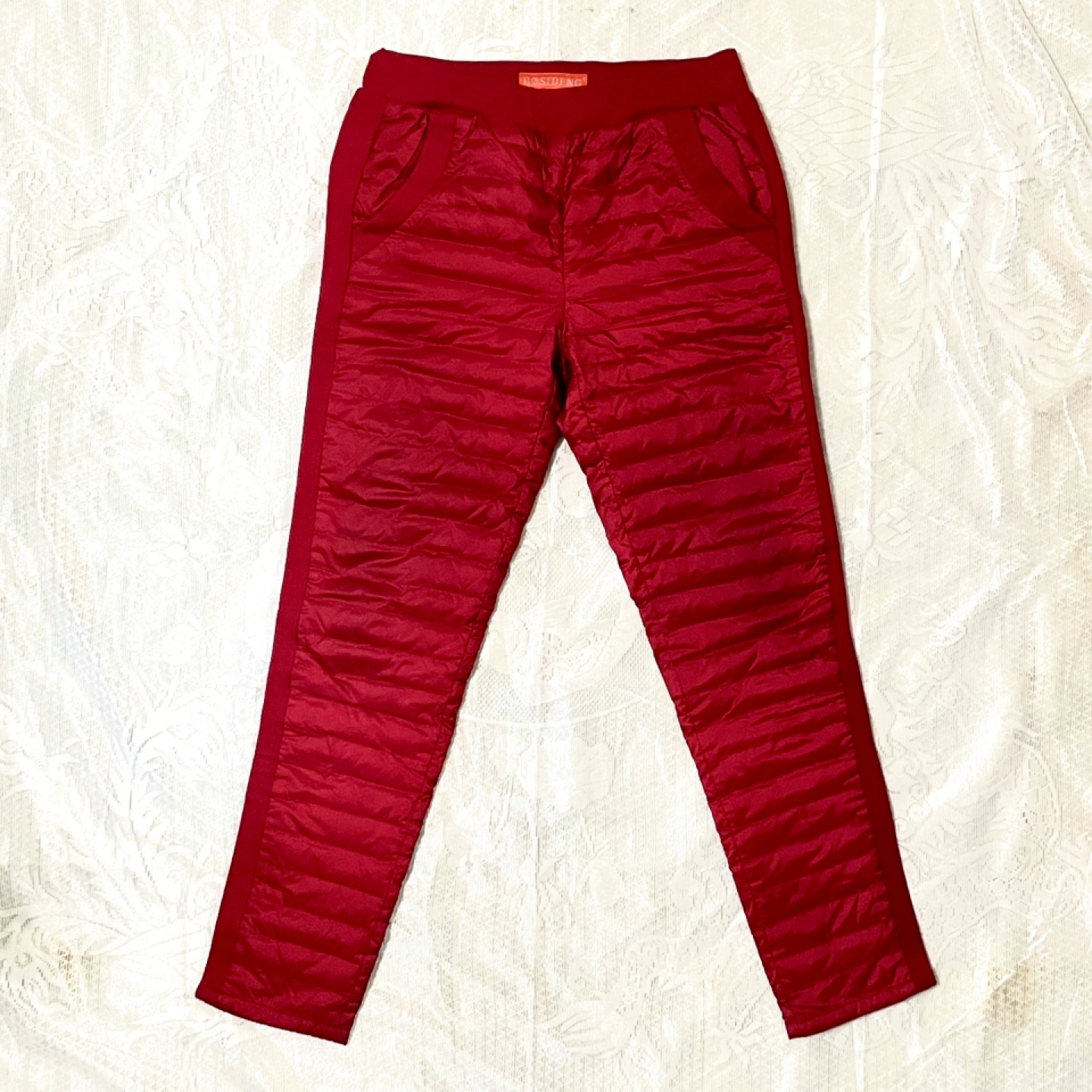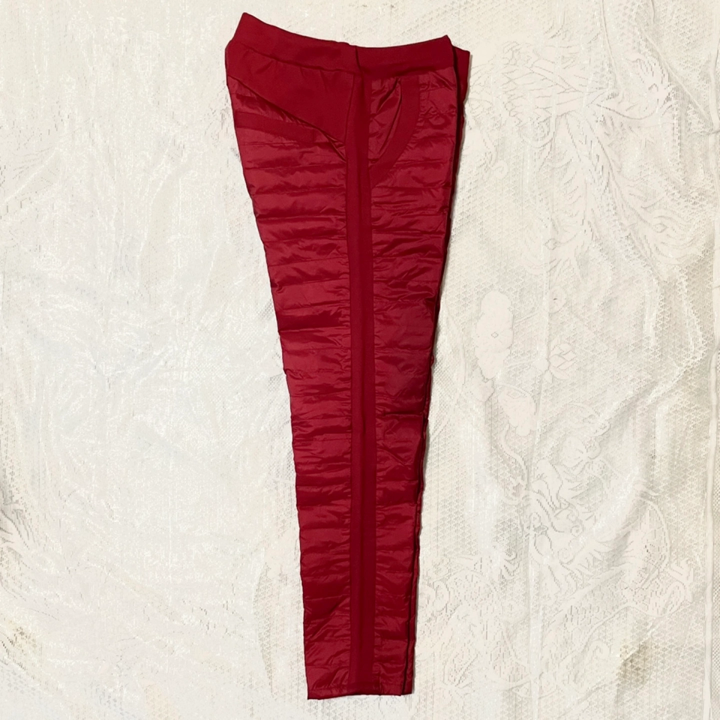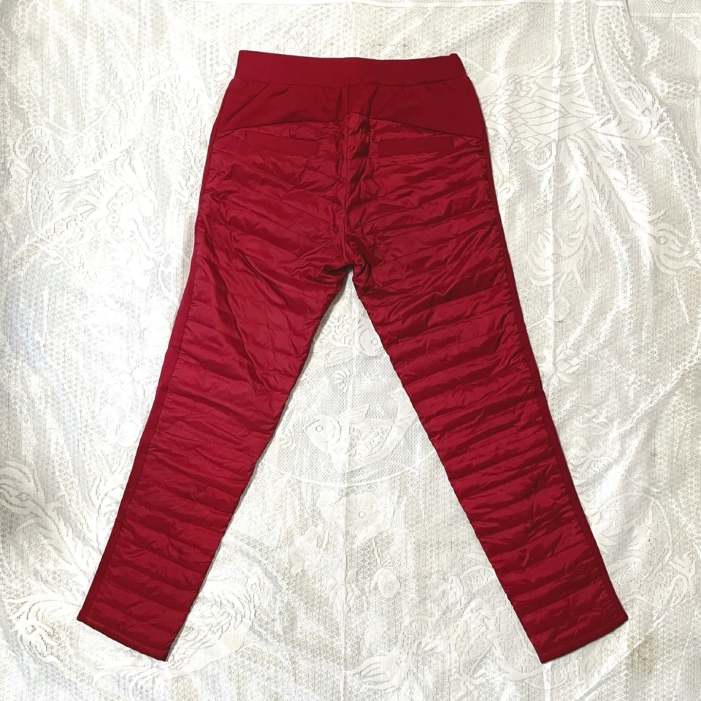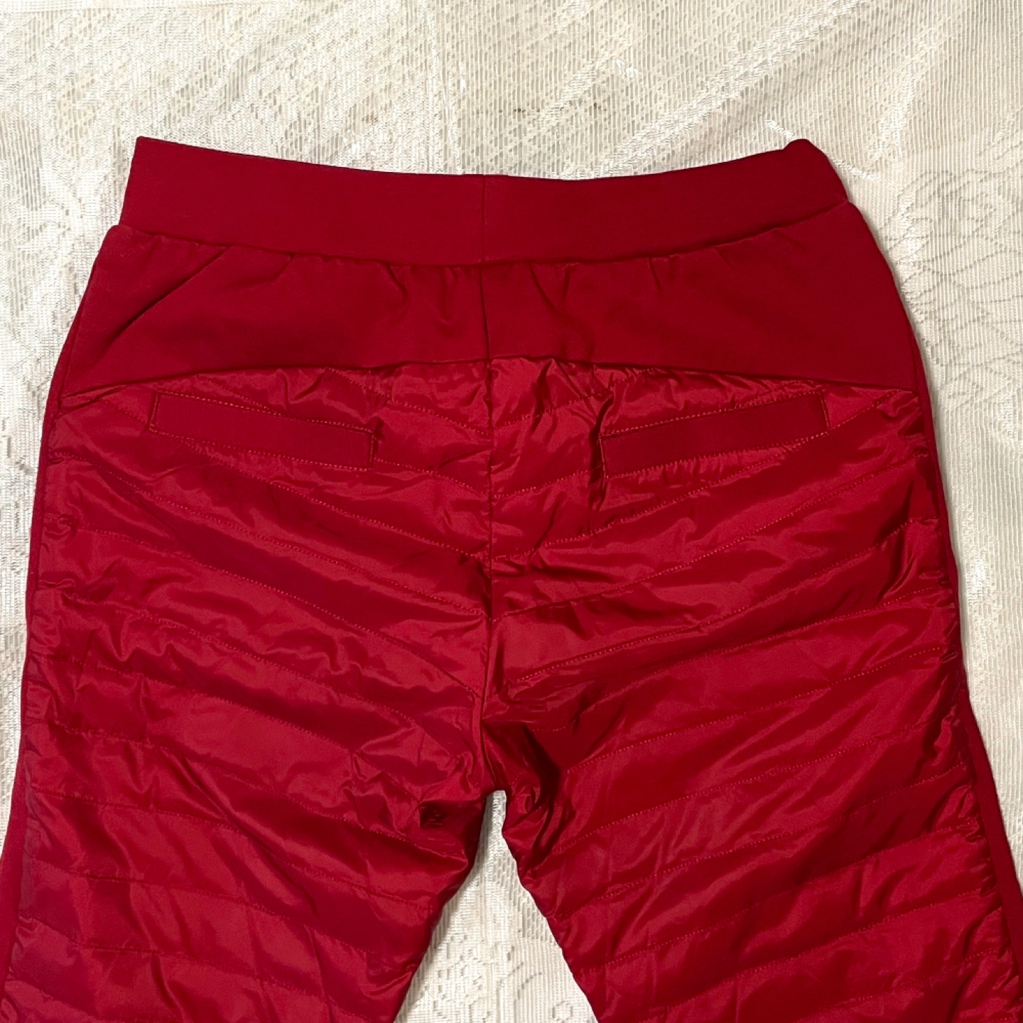 Women's lightweight down pants Burgundy red Elastic waistband Two deep side pockets Water resistant shell Filling: 90% down Warm and stylish Fit a size S/M or 6/8 Measured lying flat: Waist: 13”-16” stretchy Hip: 20-22”, minor elasticity Thigh: 11-12”, minor elasticity Front rise: 9.5” Back rise: 15” Inseam: 28.5” (perfect length for wearing boots in the winter) No flaws Decluttering. More under my listings