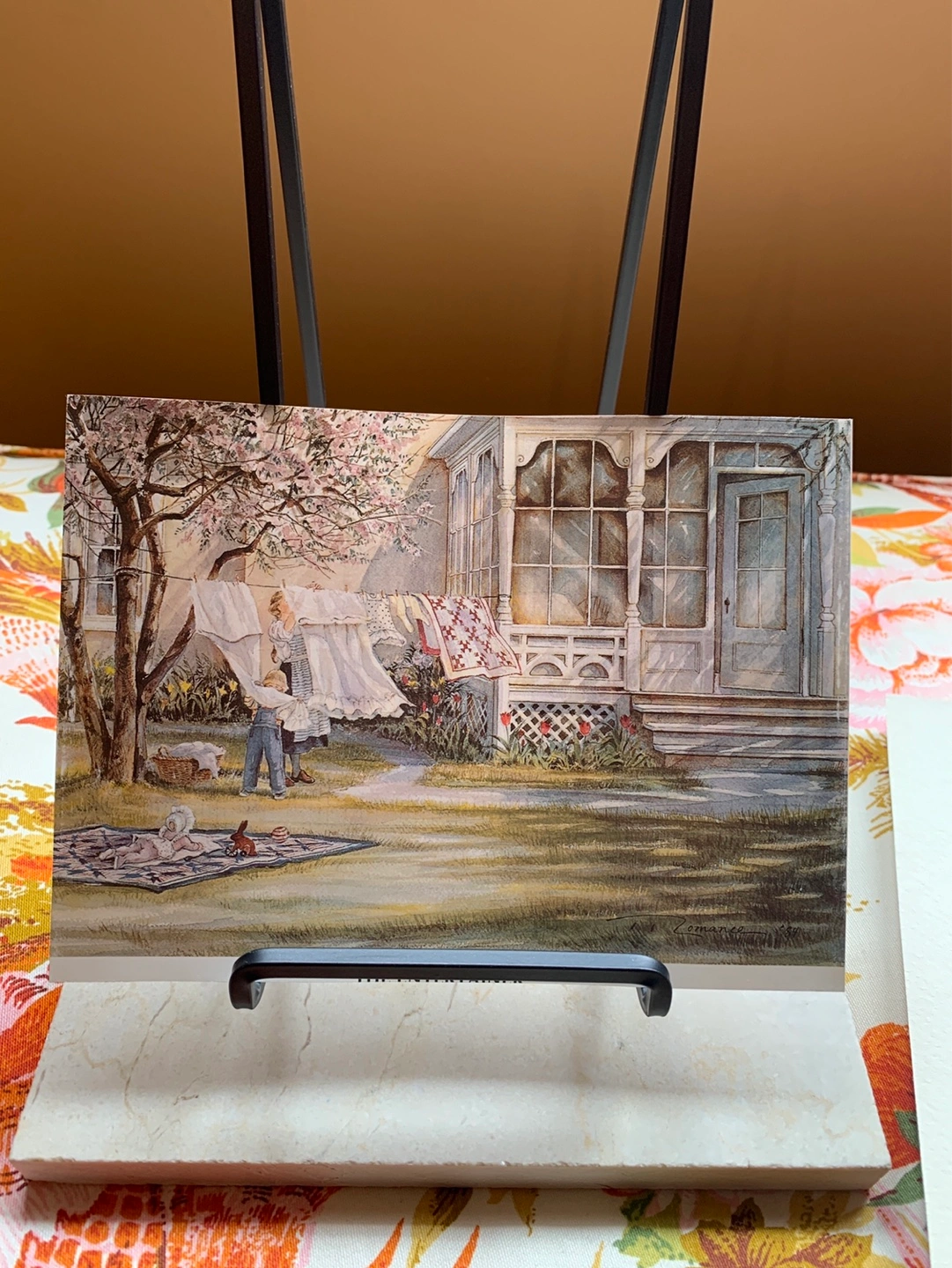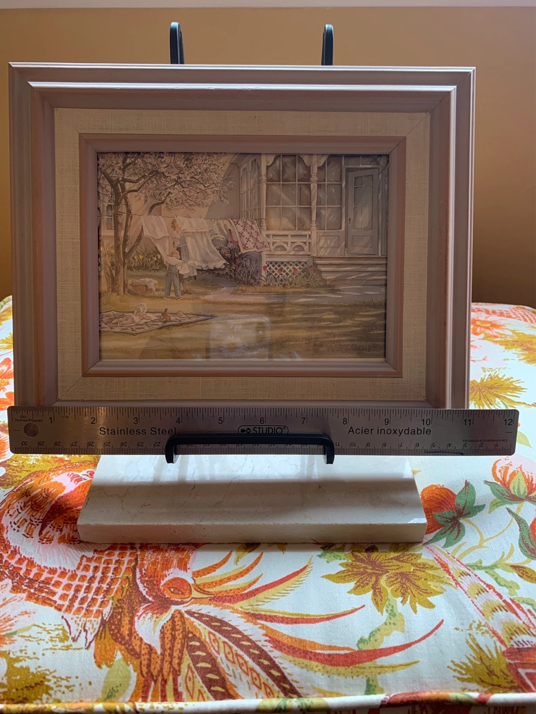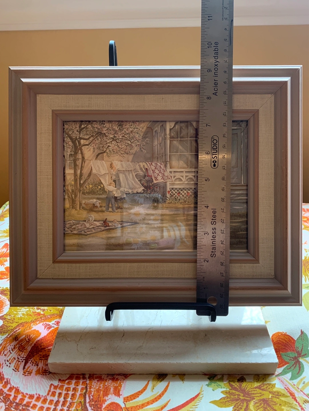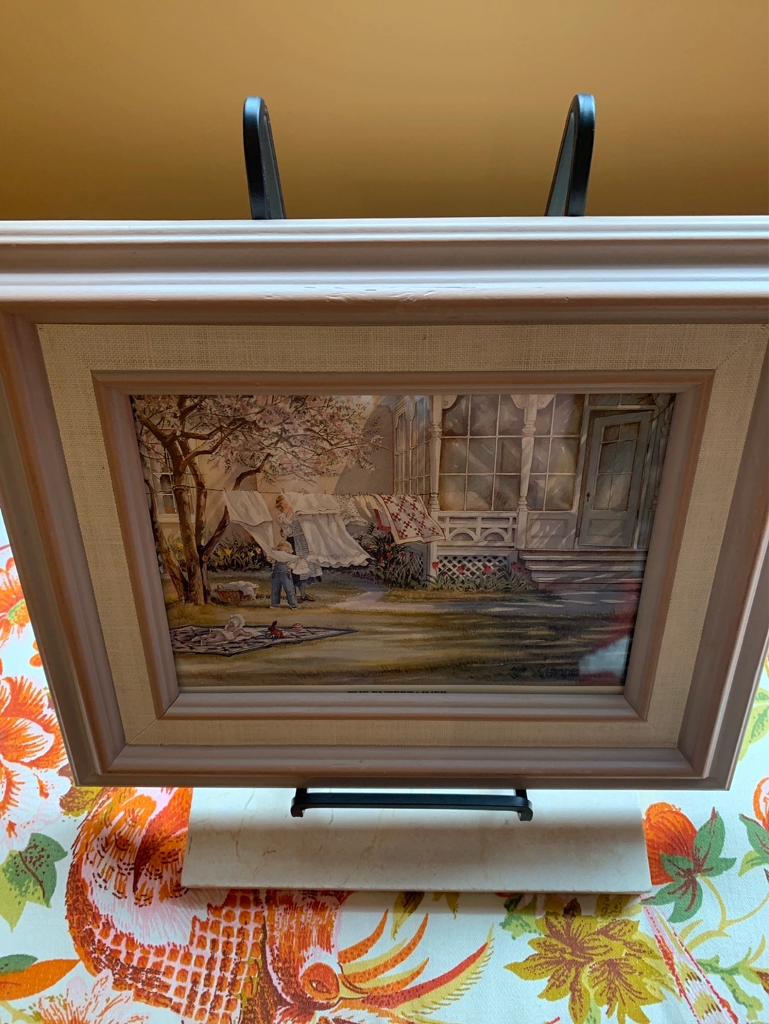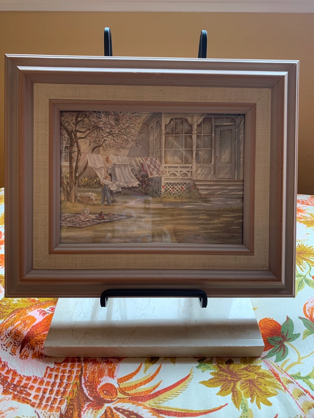Charming framed calendar print of a Trisha Romance print. On one side it depicts a family hanging laundry outside a house. Her original was called The Entertainer. On the other side there is a winter scene, titled Home Sweet Home, so you can change it for the seasons. This is not a real print but a dupe look. It is in a beautiful wooden frame which is a pinky tan. It is a whimsical and tranquil picture! Cash only please. Easel not included.