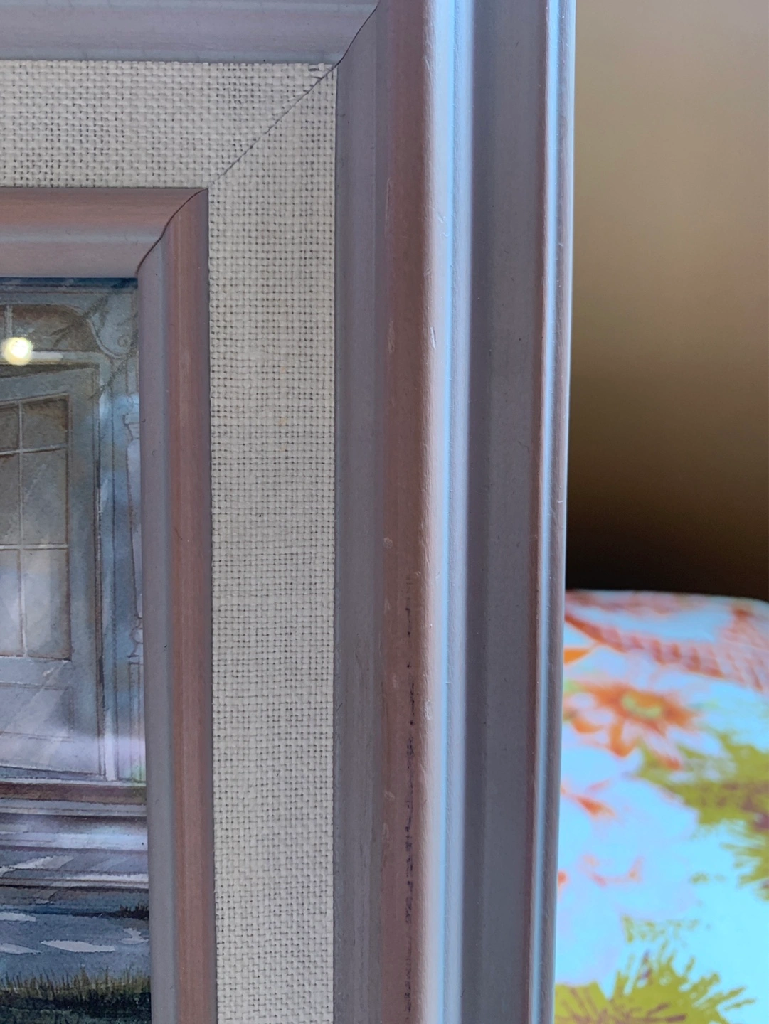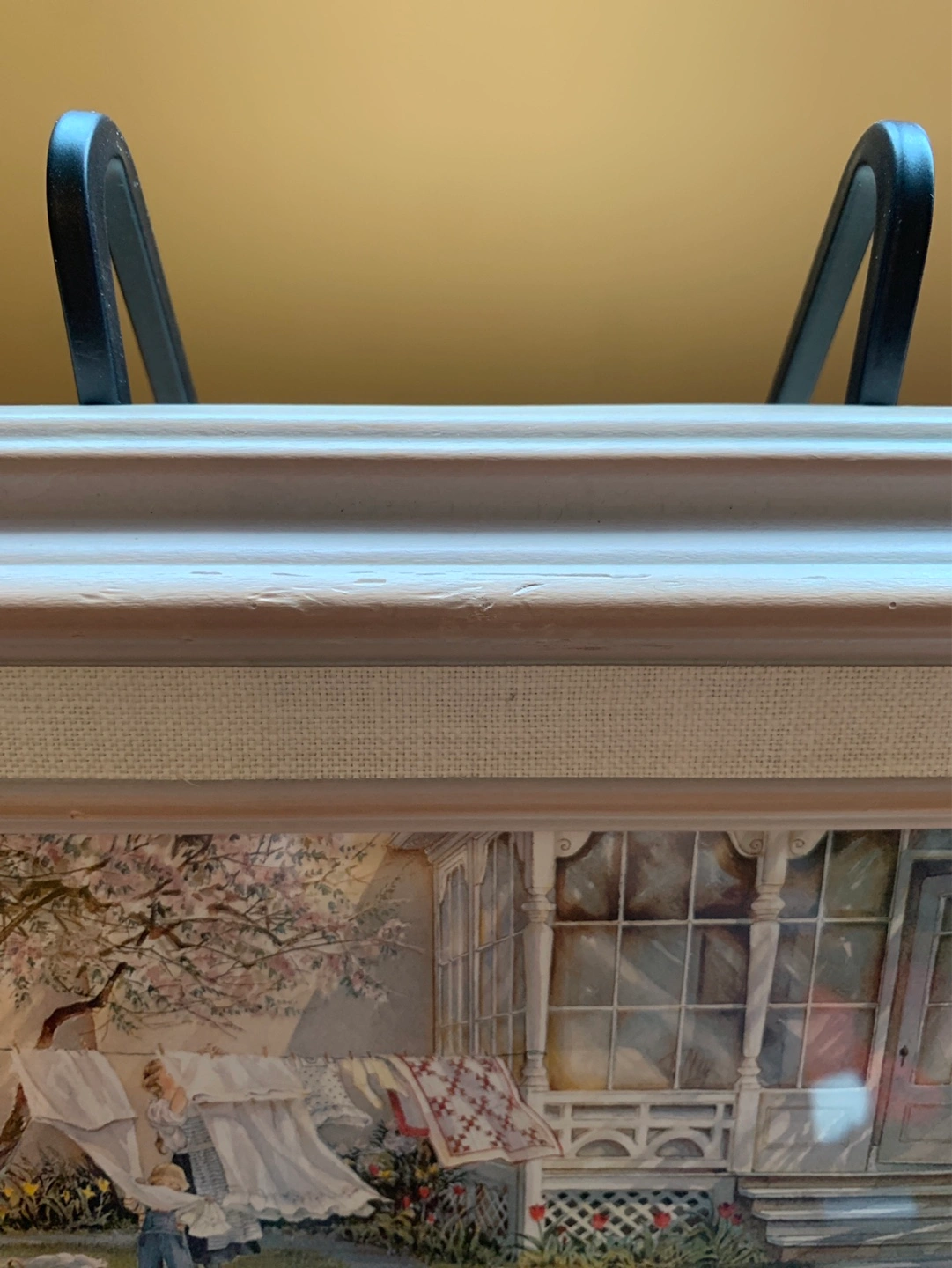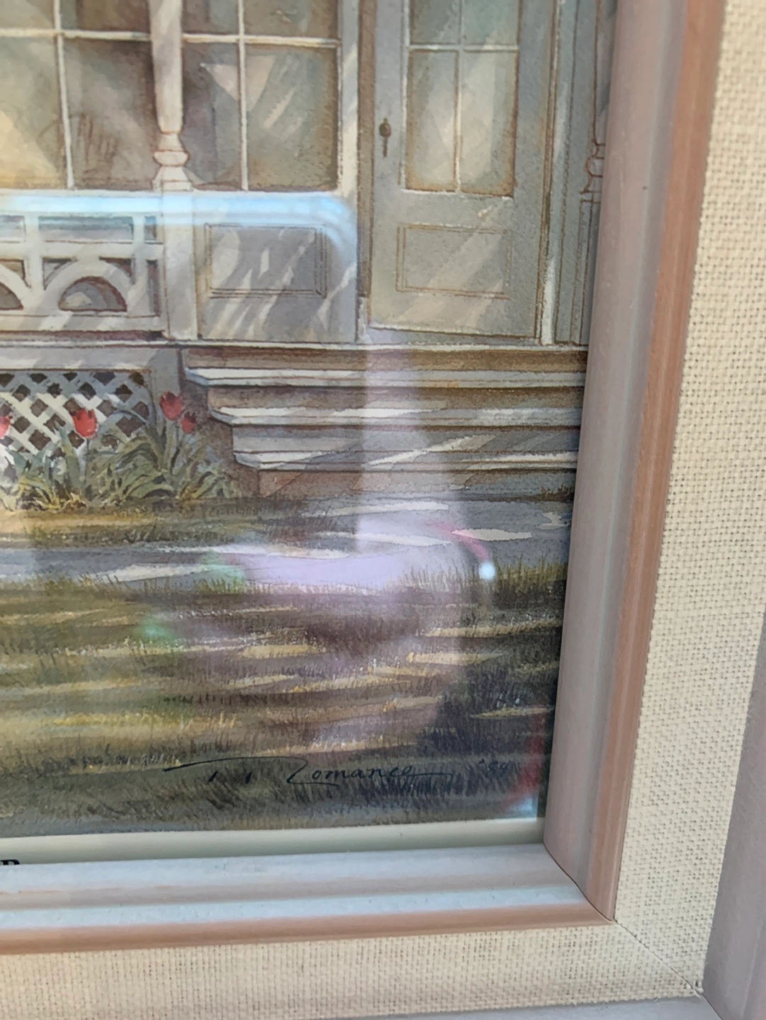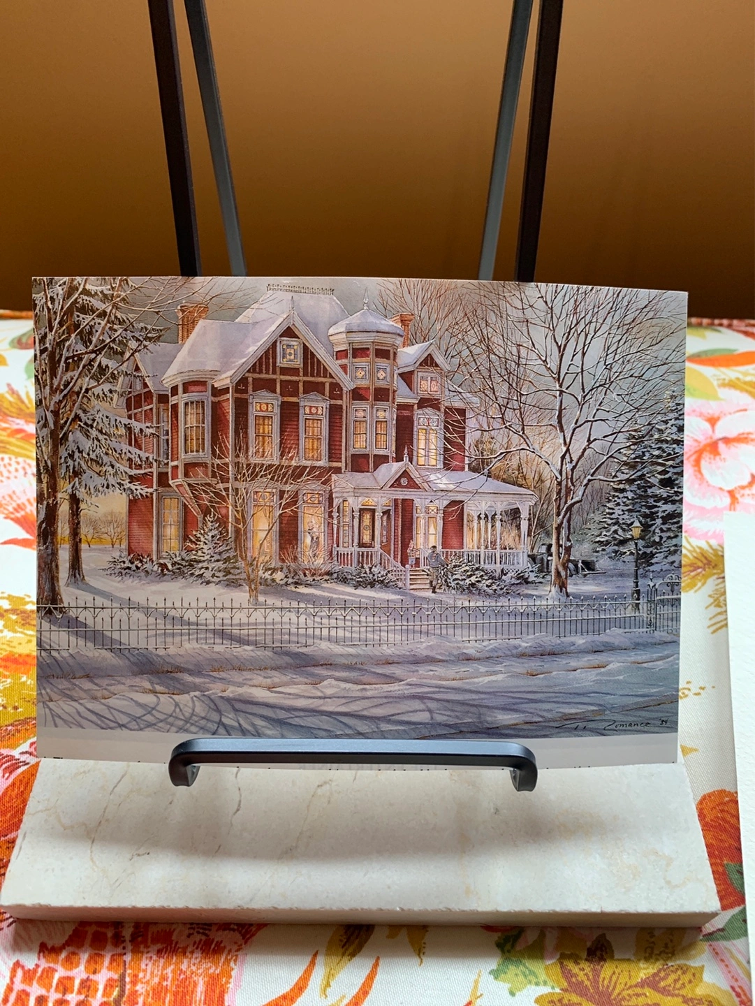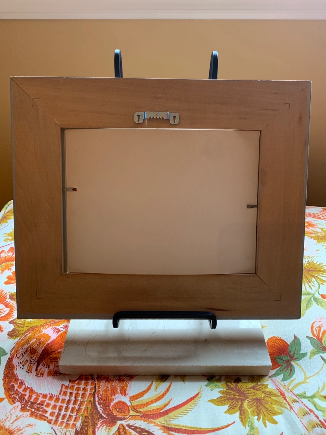 Charming framed calendar print of a Trisha Romance print. On one side it depicts a family hanging laundry outside a house. Her original was called The Entertainer. On the other side there is a winter scene, titled Home Sweet Home, so you can change it for the seasons. This is not a real print but a dupe look. It is in a beautiful wooden frame which is a pinky tan. It is a whimsical and tranquil picture! Cash only please. Easel not included.