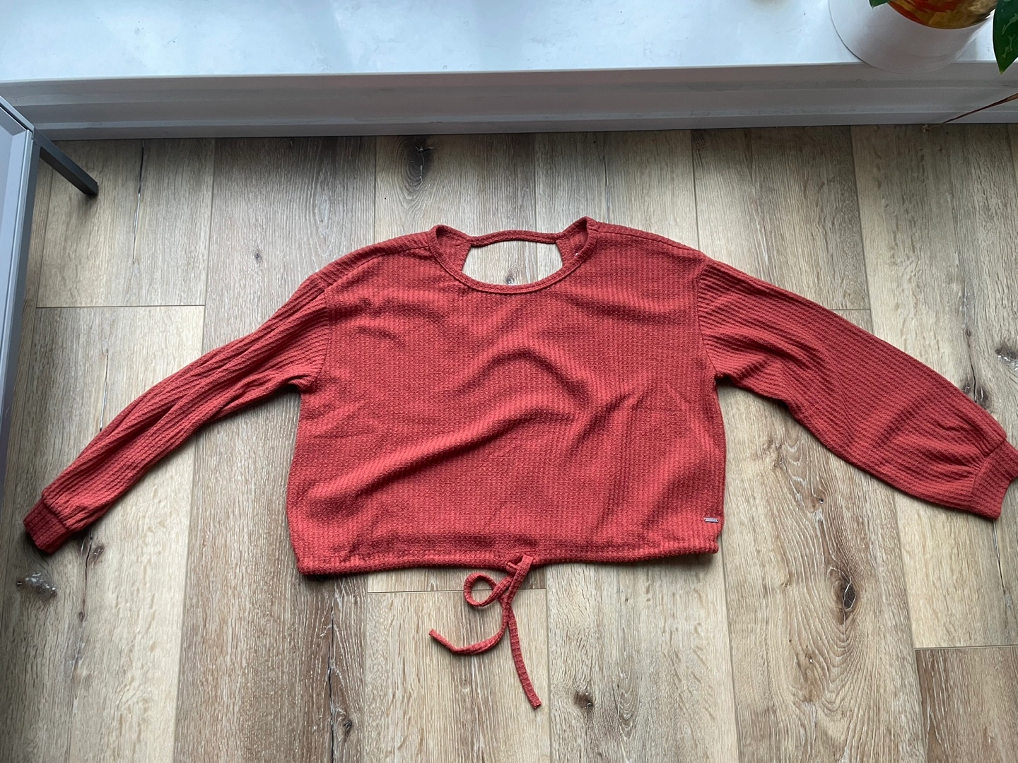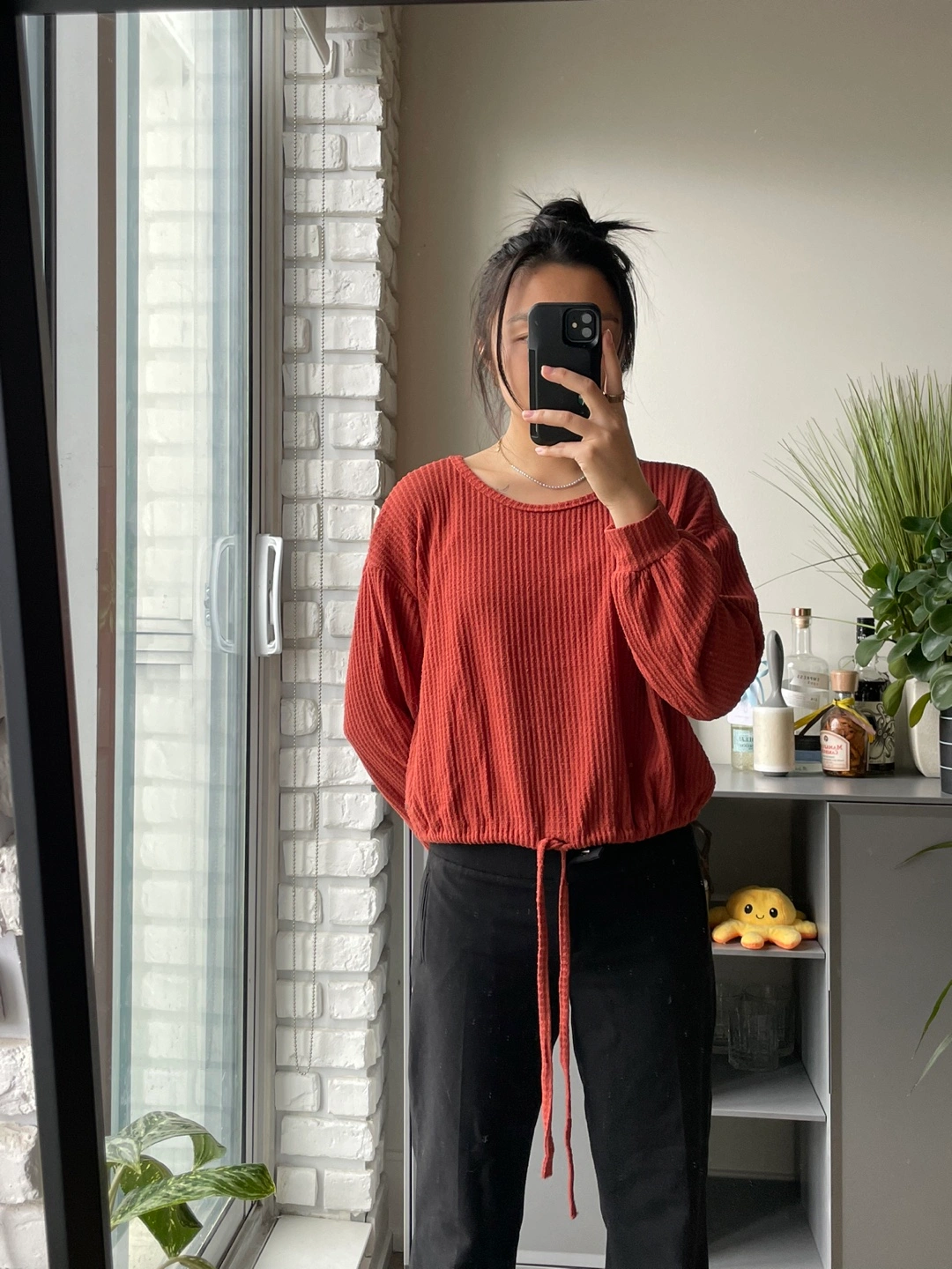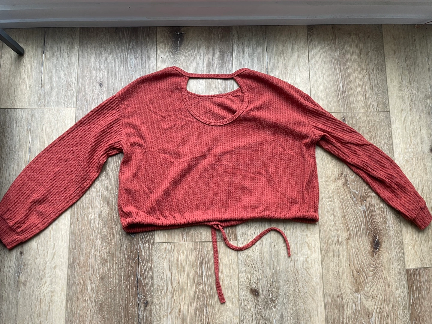 Women's size XS cropped waffle knit sweater. Burnt orange colour. Features a keyhole back and cinched waist with drawstrings. Long sleeves. Good condition.