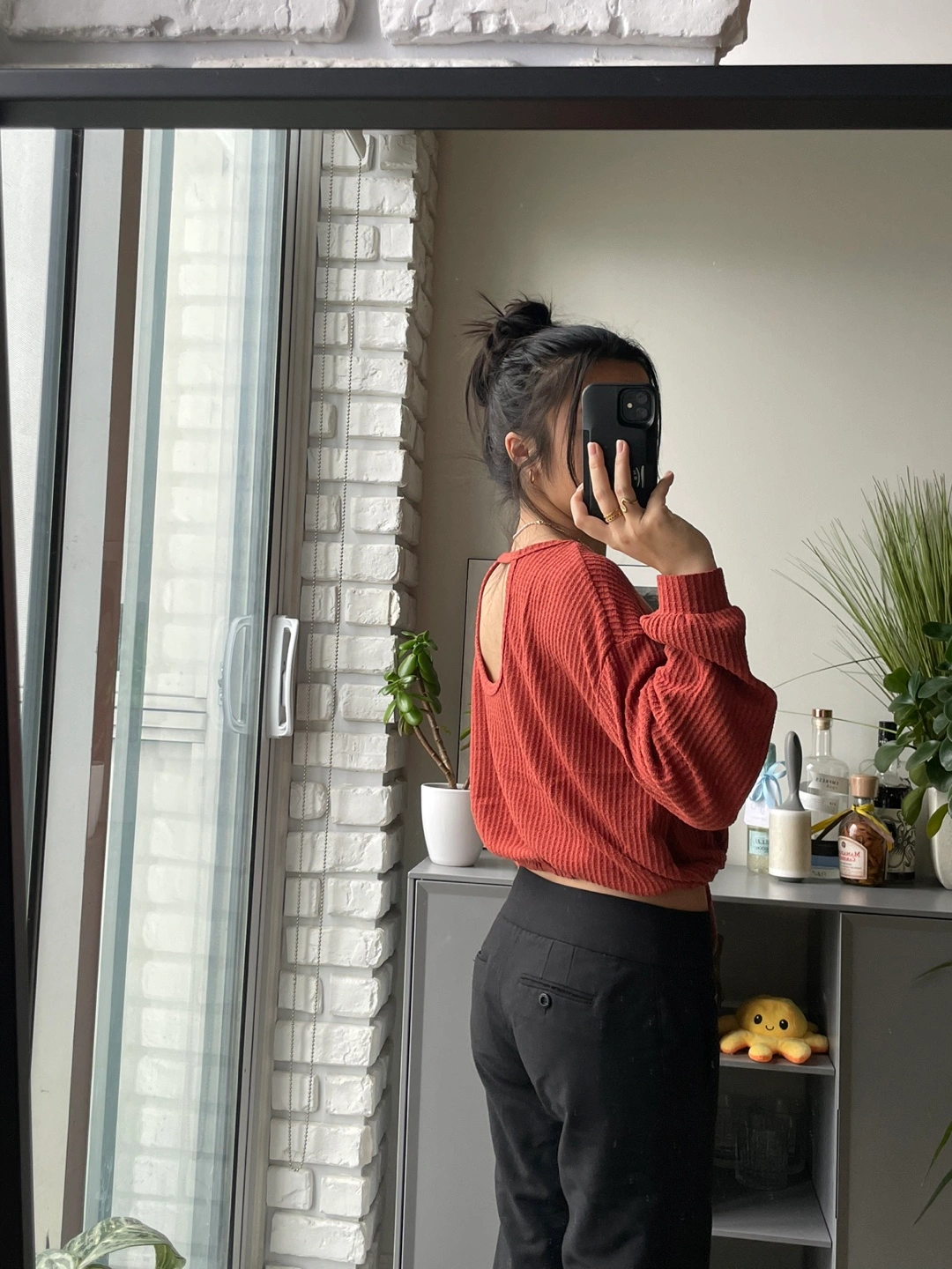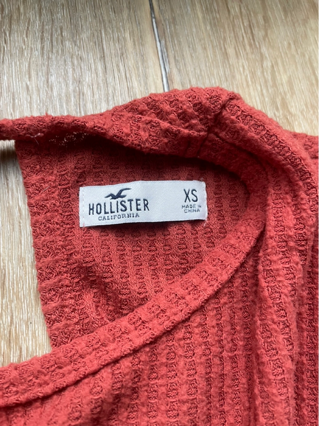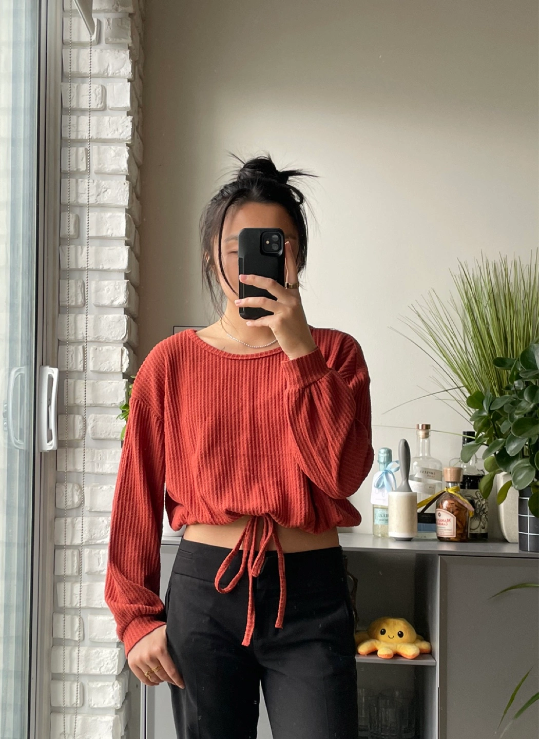 Women's size XS cropped waffle knit sweater. Burnt orange colour. Features a keyhole back and cinched waist with drawstrings. Long sleeves. Good condition.