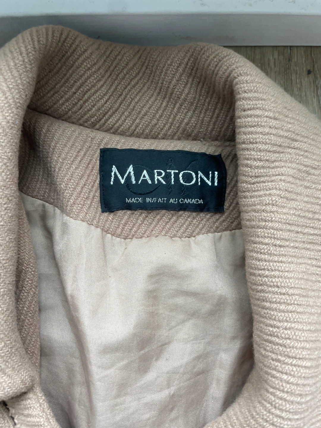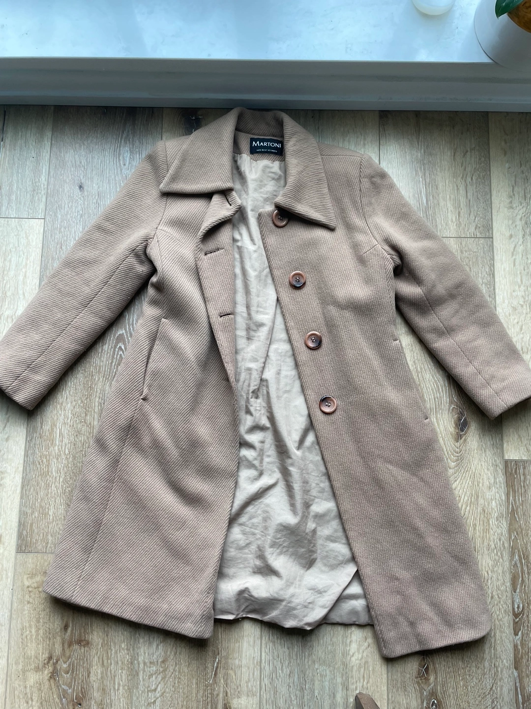 Beautiful light brown coat. Classic style, long sleeves, button closure, slightly padded shoulders. Made in Canada. Lambswool and cashmere blend. Excellent vintage condition. Brand: Martoni Size: S/M Colour: Light Brown/Beige Condition: Good Open to bundle offers, cash only