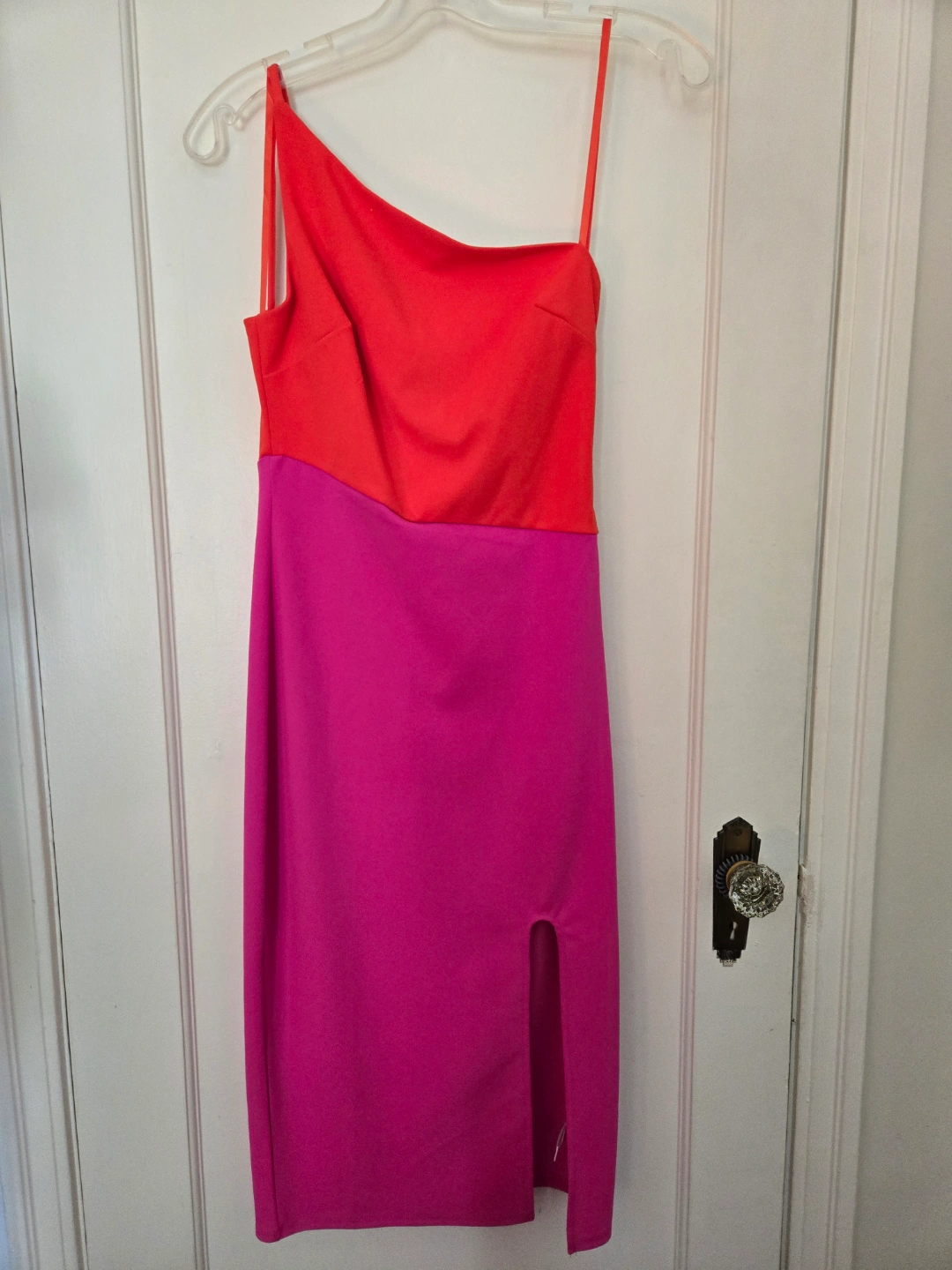 Stunning two-tone mini dress. Features a vibrant orange top and a hot pink bottom. One-shoulder design. Side slit. Great for a night out. Purchased for TS but decided to wear some different
