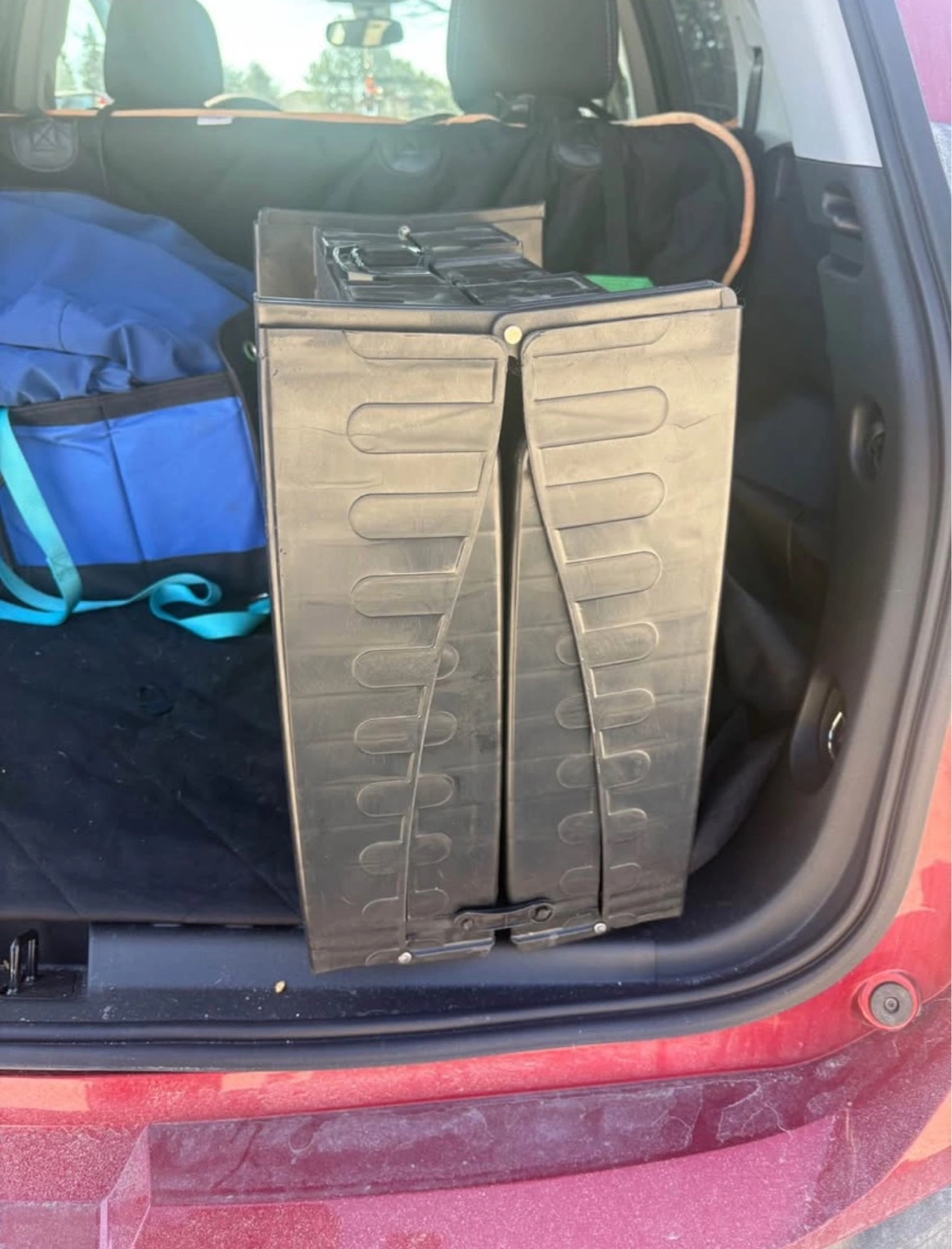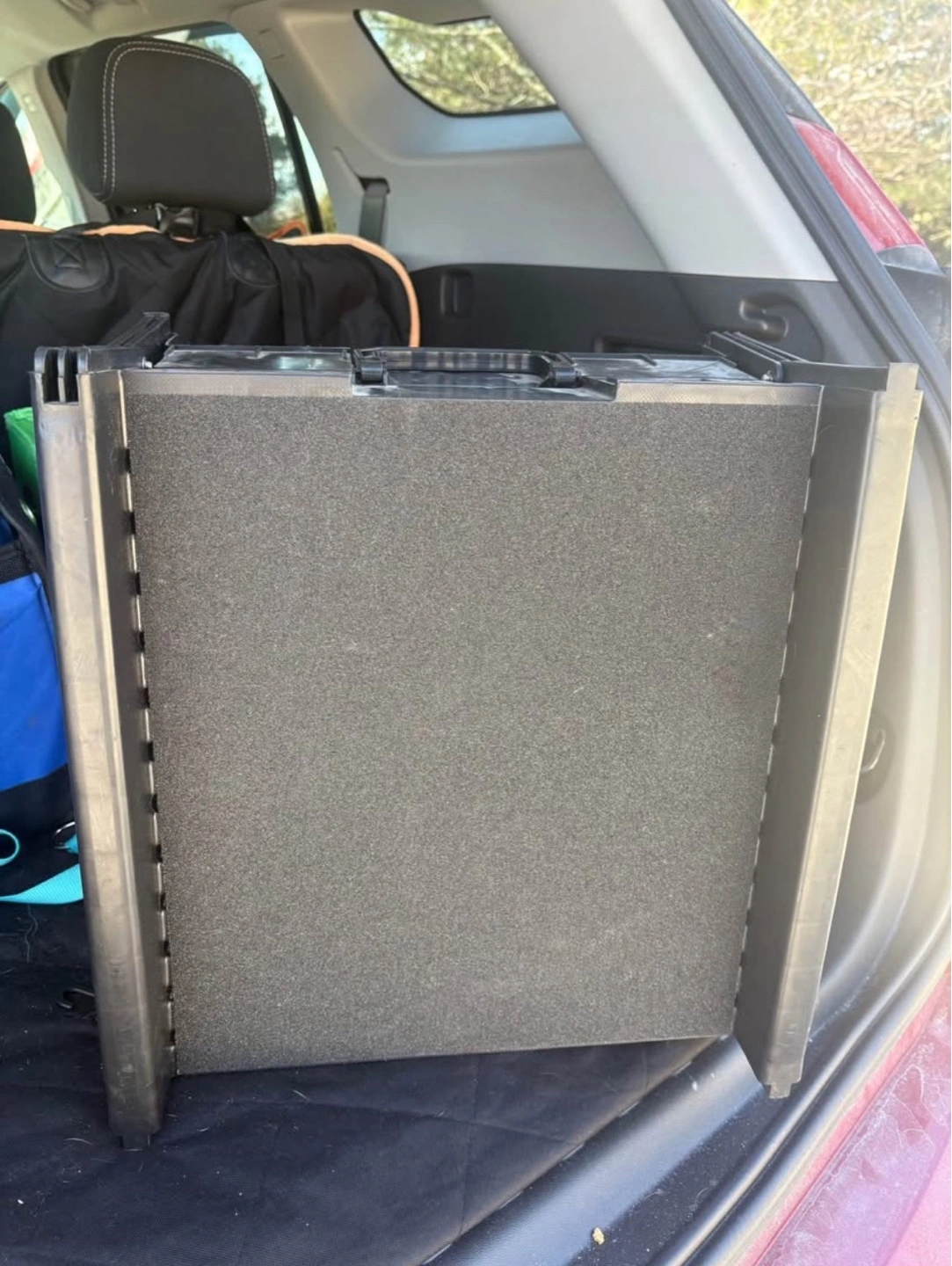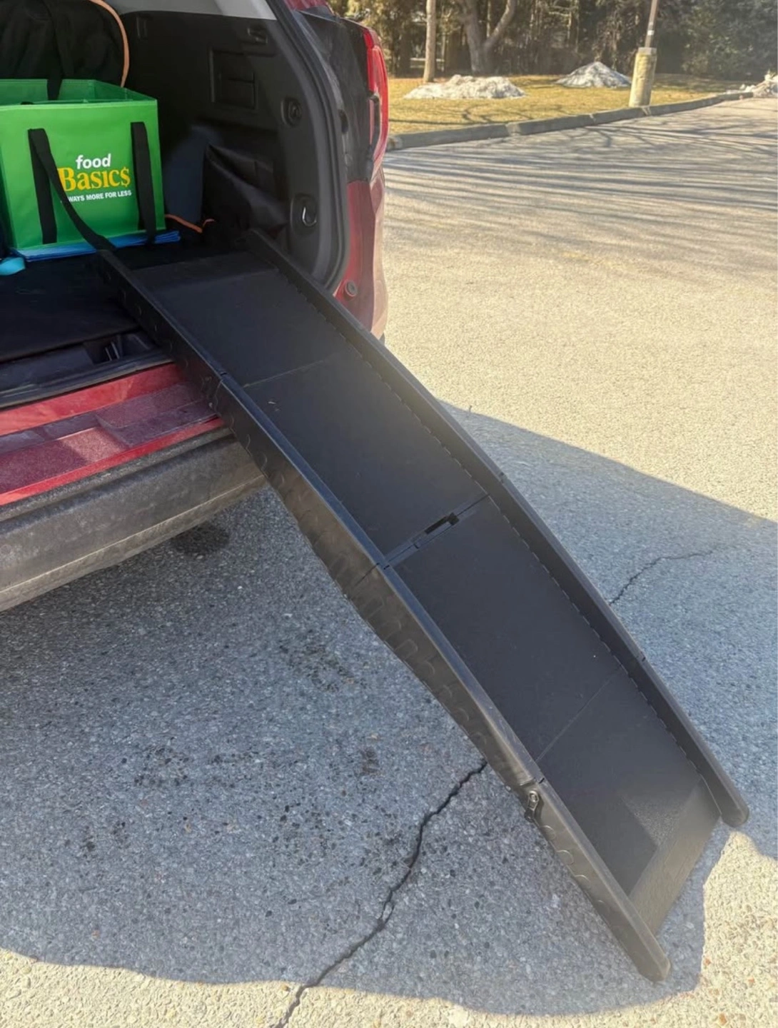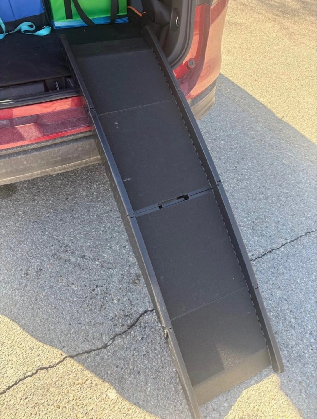 Black plastic pet ramp with nonslip grip. Folds for easy storage. Lightweight and portable. Ideal for helping pets in and out of vehicles.