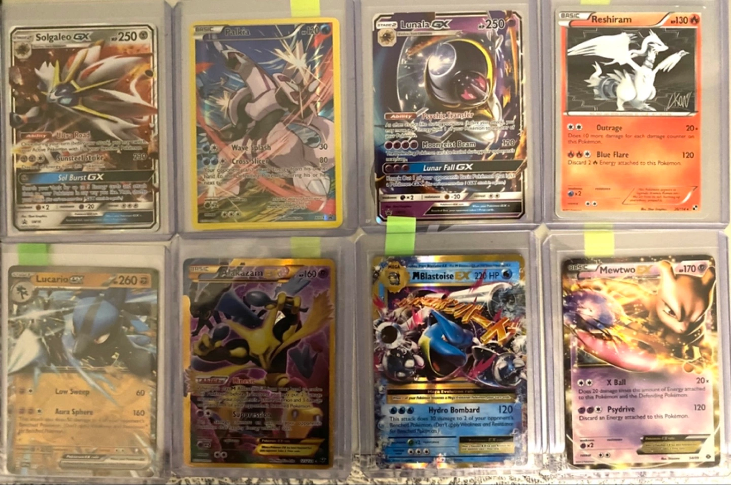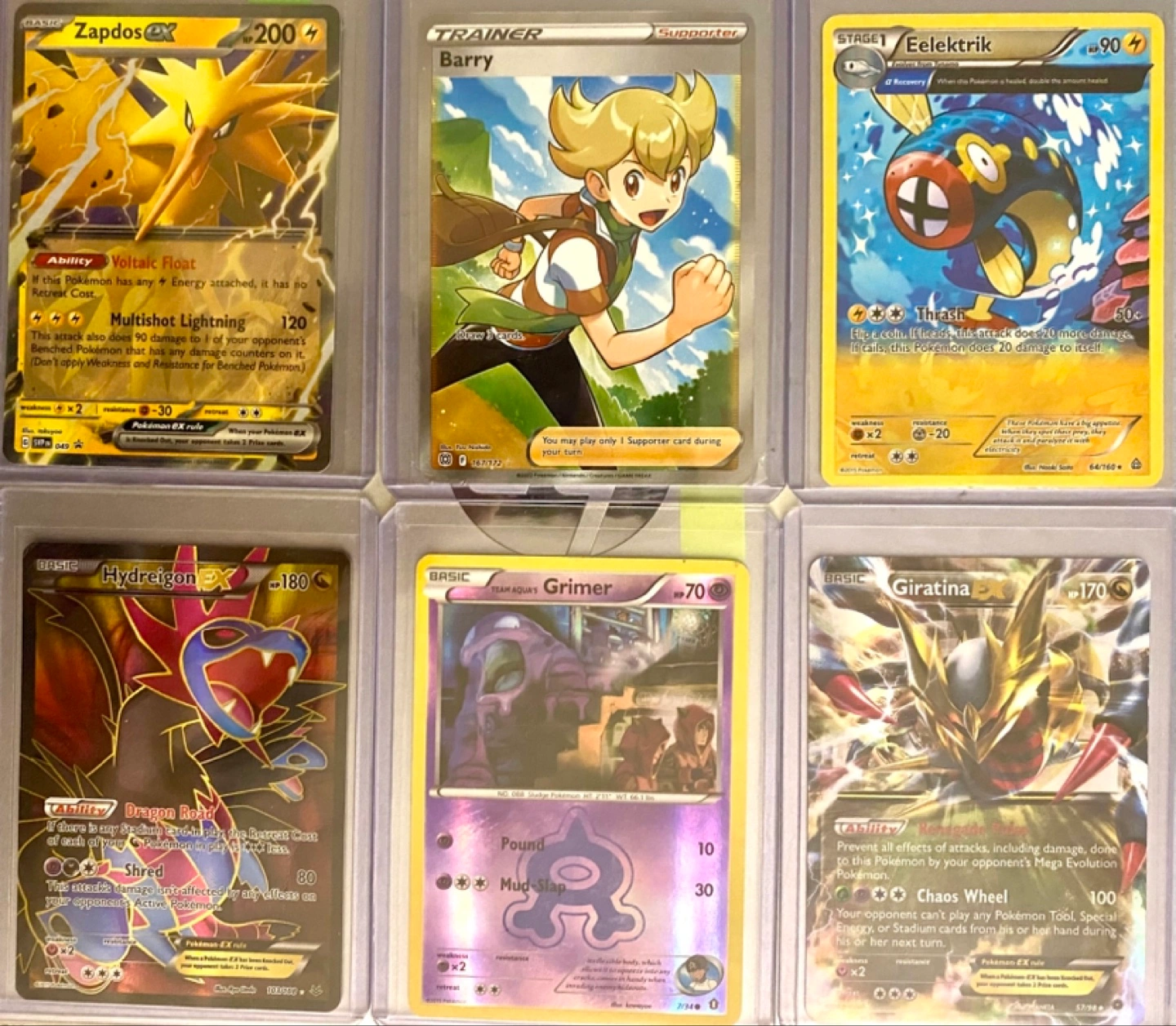 Collection of 18 Pokemon trading cards. Various cards included, some holo. Sleeved for protection. Great for collectors or players. Team rocket grimer sold Barry sold Giratina ex sold Charizard holo sold Solgaleo sold Lucario sold Zapdos sold Primal groudon sold