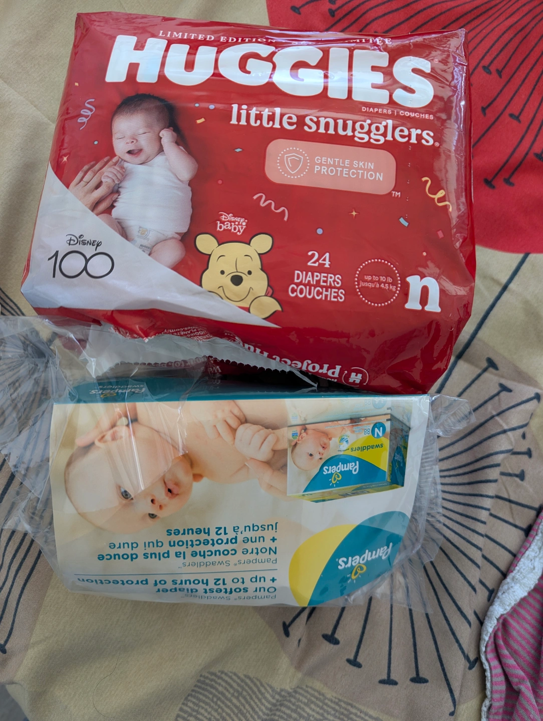 Bundle of baby diapers. Includes one package of Huggies Little Snugglers size N Disney Winnie the Pooh edition and one package of Pampers Swaddlers size N. Both packages are new opened by kid