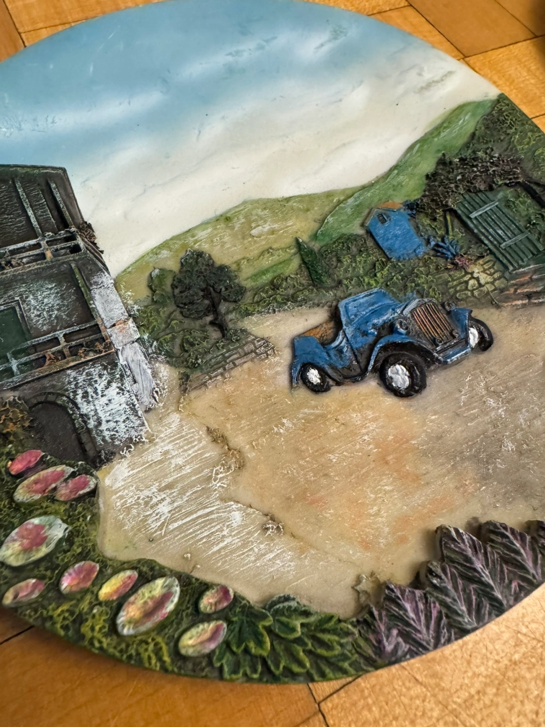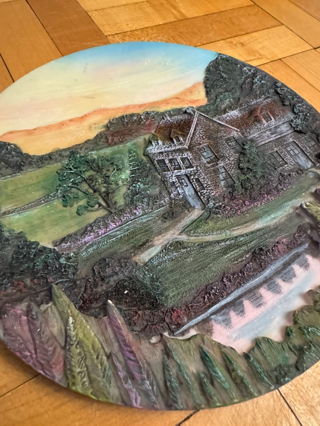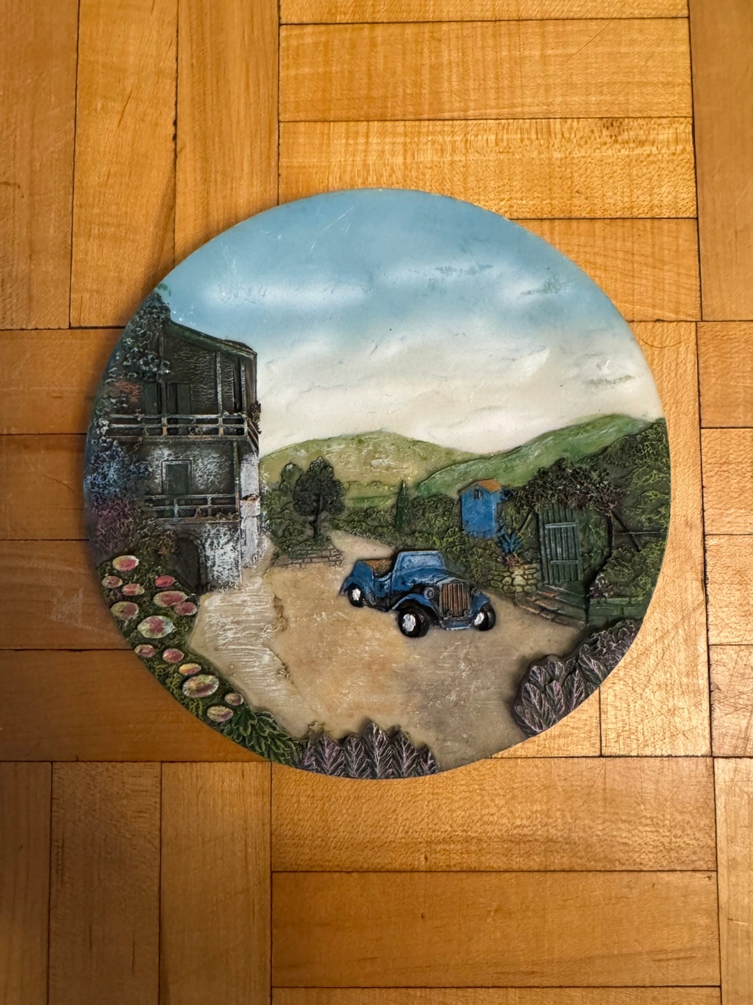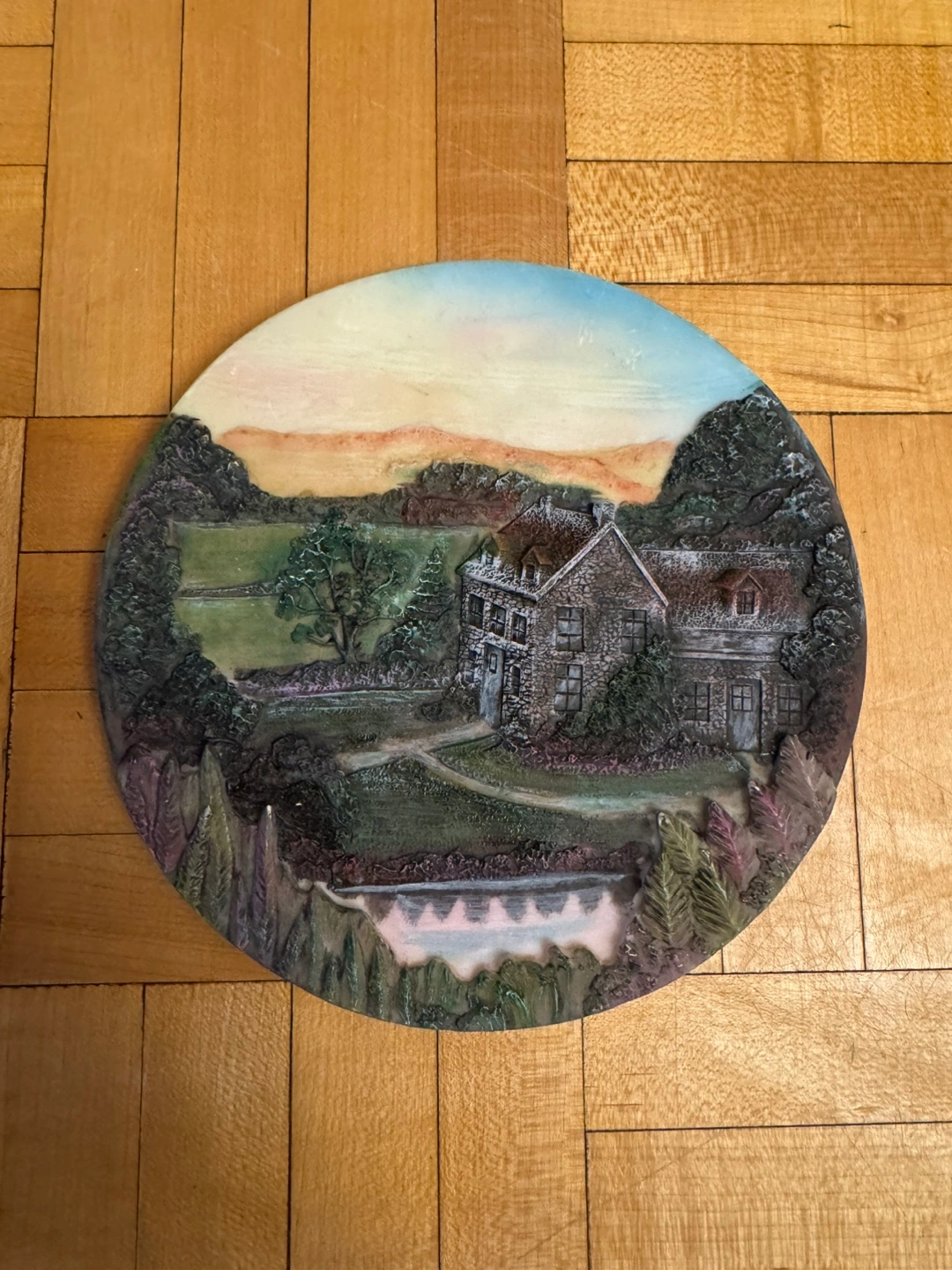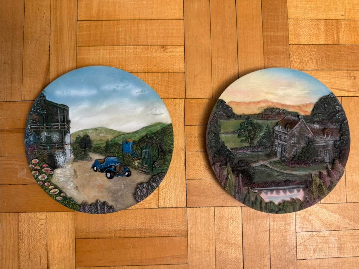 Pair of decorative plaques. Scenic countryside and village settings. Three-dimensional raised details. Adds character to any room. 6” diameter $15.00 each or Both for $25.00