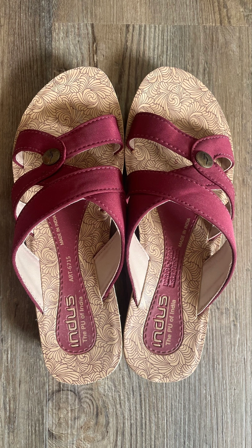 Pair of burgundy women's sandals. Wedge heel. Cross strap design. Size 5. Made in India. Sandals are very lightweight UK Size 5 Canadian Size 7. In the pic, you can see UK/ India size 5. Cash only