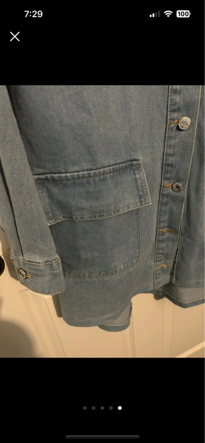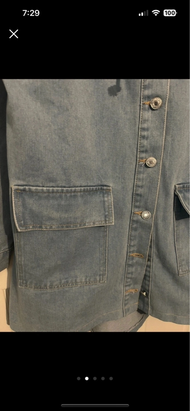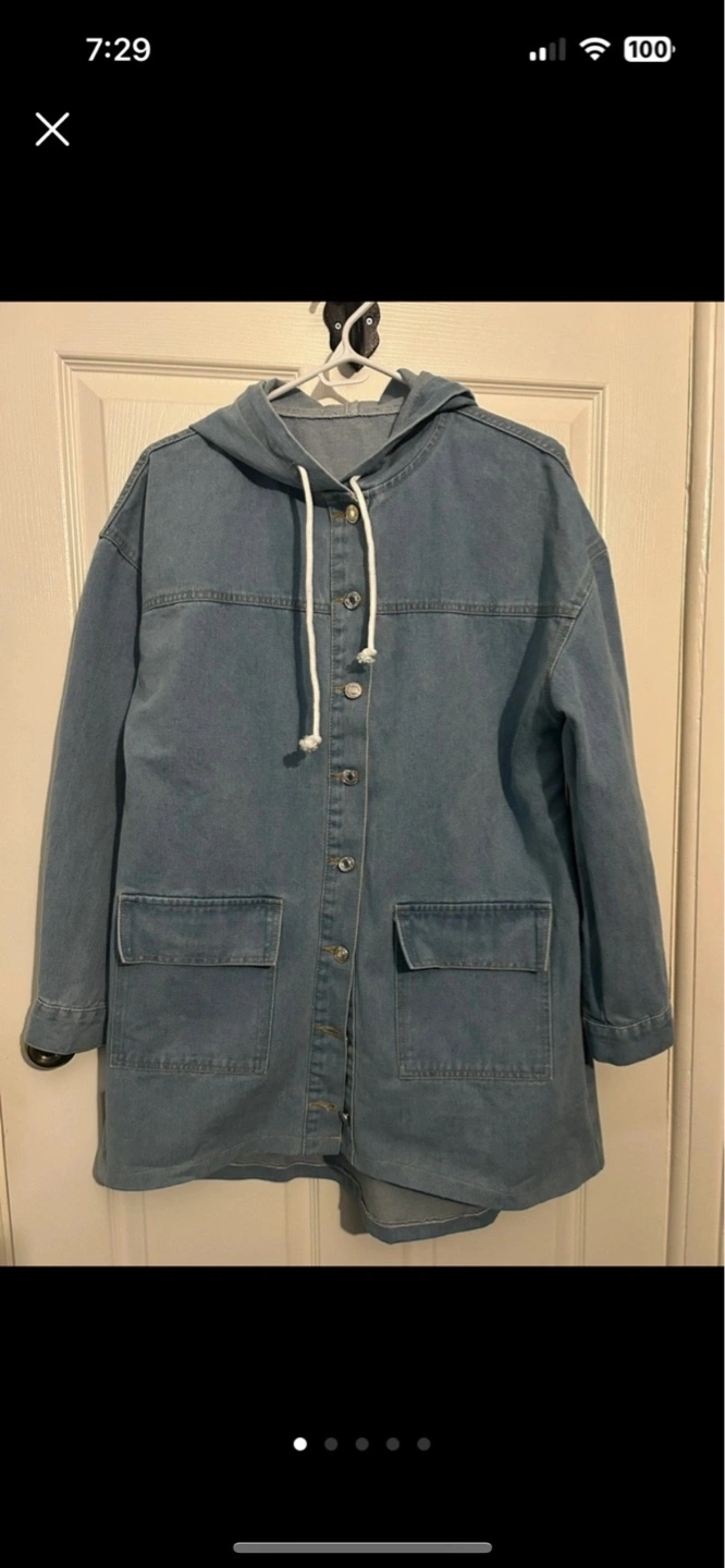 Light wash denim jacket. Features a drawstring hood and button closure. Two front pockets. Long sleeves. Relaxed fit.