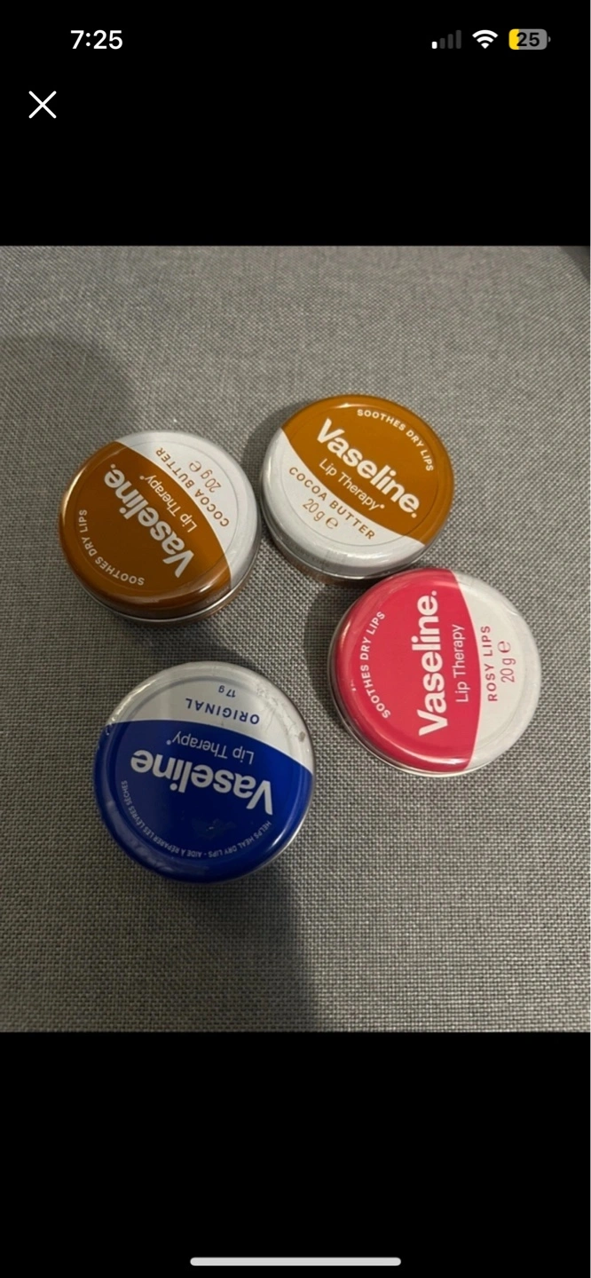 Four Vaseline Lip Therapy tins. Flavours include Cocoa Butter, Original, and Rosy Lips. Each tin is 20g except for the Original, which is 7g. 4$ each