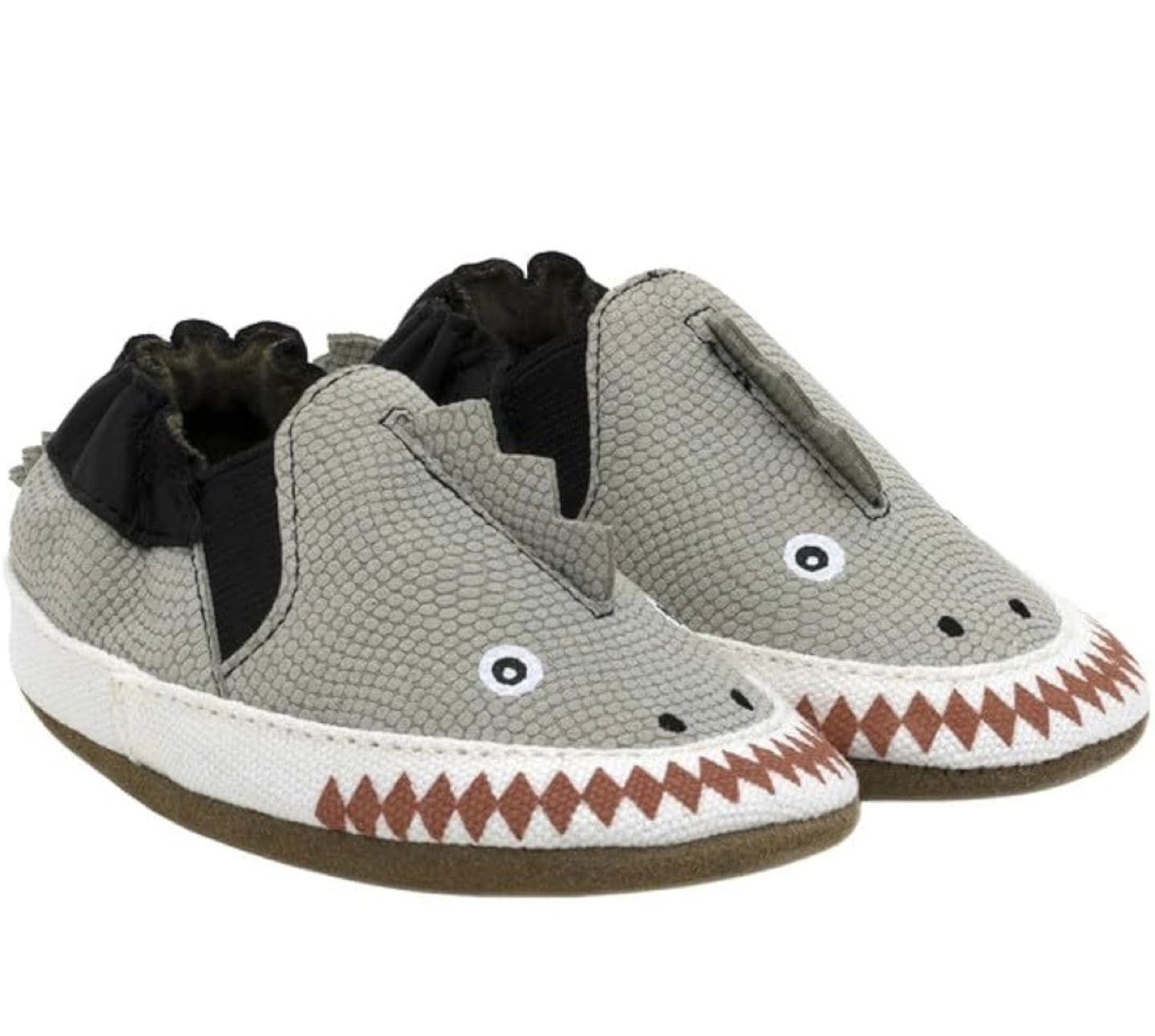 Adorable Robeez Soft Soles baby shoes. Grey shark design. Slip-on style. Soft soles. Great for crawling and first steps. Size 6-12 months.