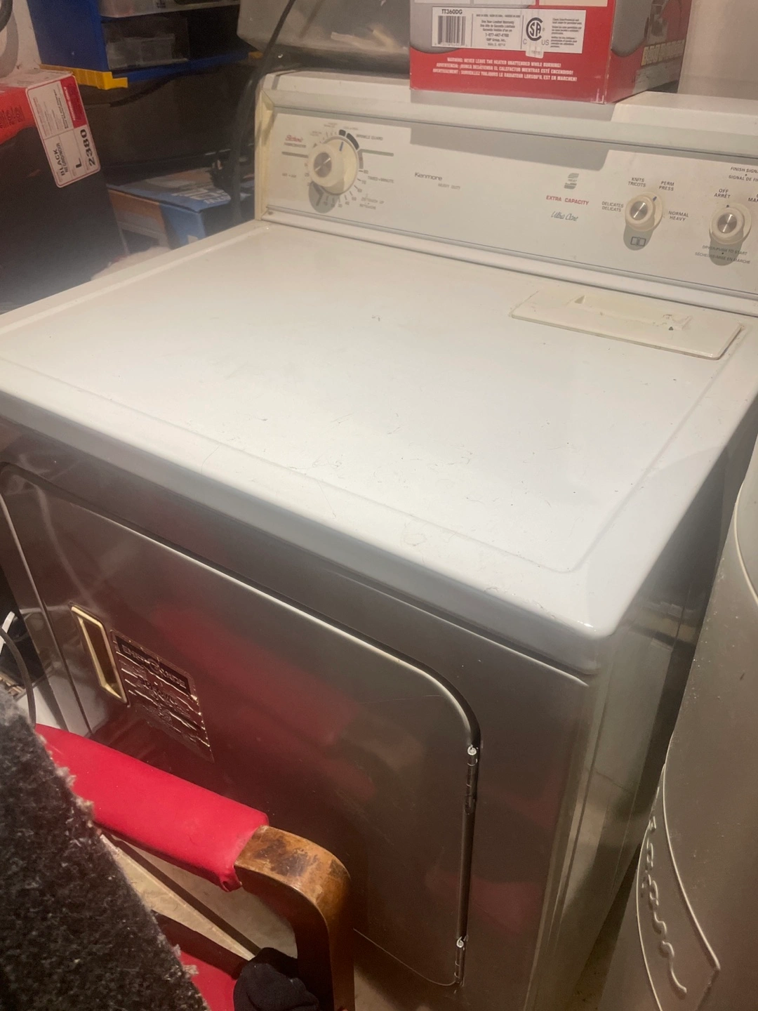Used Kenmore dryer, extra capacity. White top, metallic grey front. Features various drying cycles. Dryer’s been sitting for about 10 years