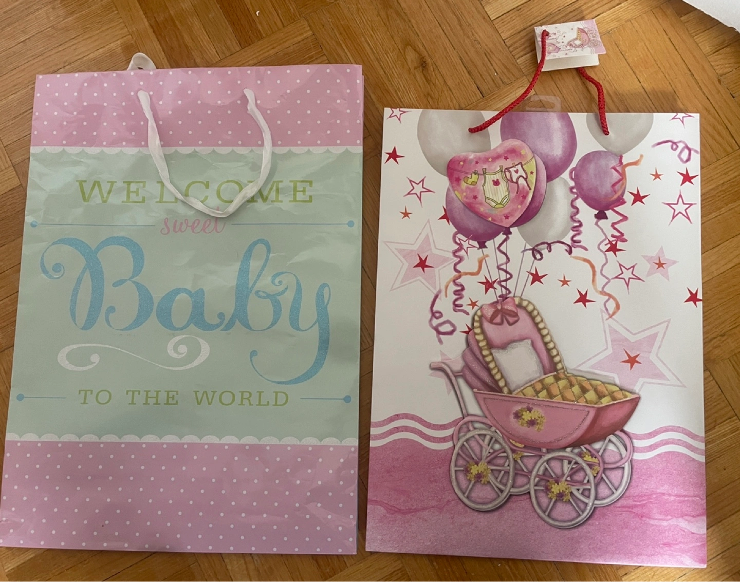Set of two large gift bags. Pink and white design. One in good condition and features 'Welcome sweet Baby to the world'. The other shows a pink baby carriage and balloons and has an empty gift tag and is in like new condition.