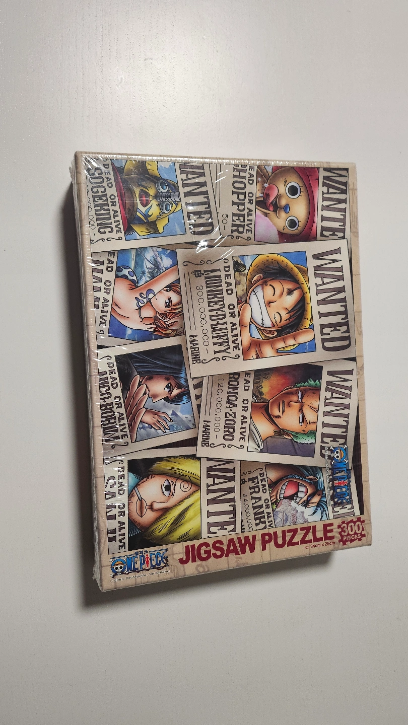 300-piece jigsaw puzzle. Features wanted posters of One Piece characters. Measures 34cm x 25cm.