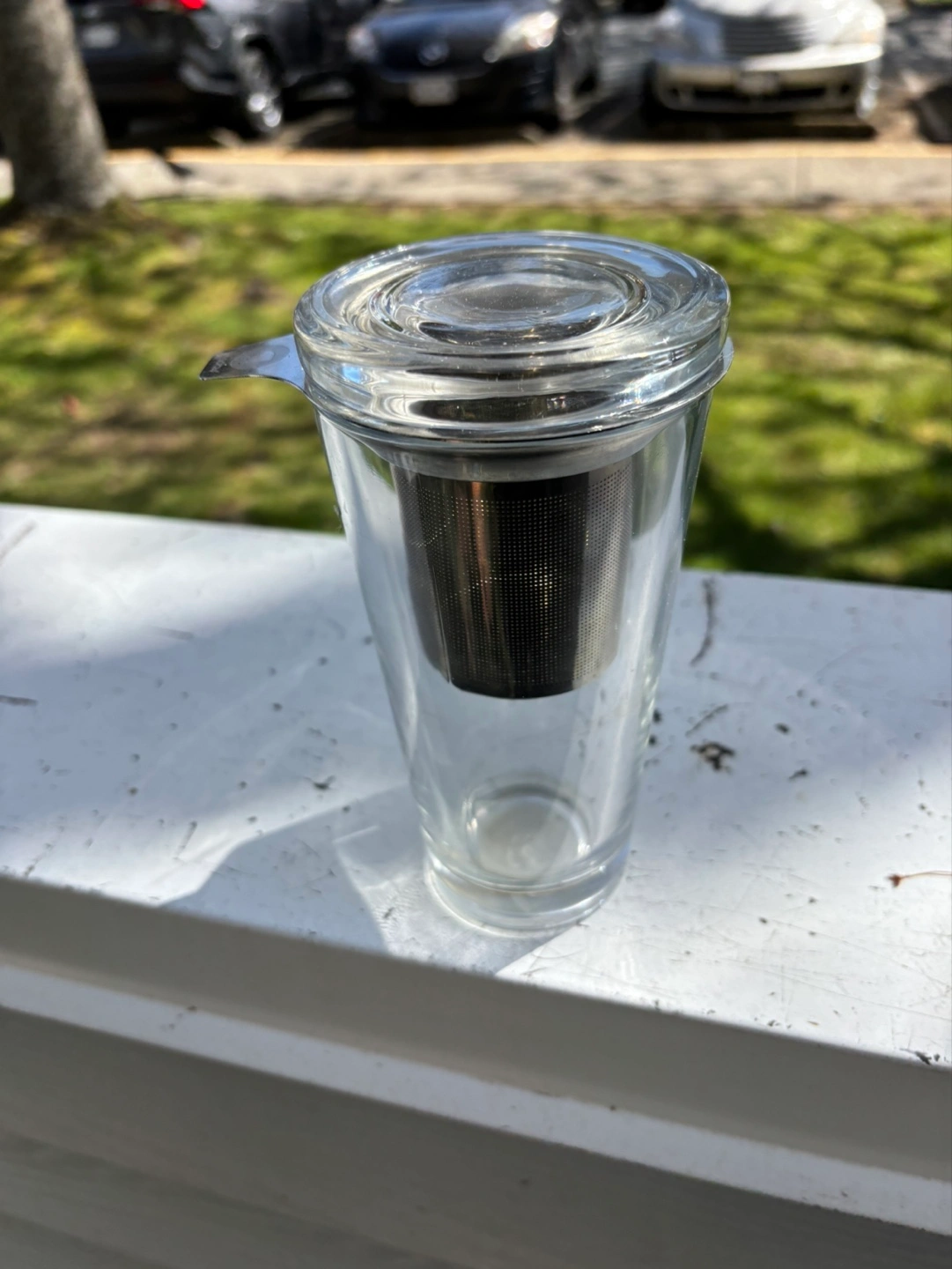 Clear glass tea infuser. Includes a stainless steel filter and glass lid with a small handle. Perfect for brewing loose leaf tea. Its brand new Pick it up near Richmond Centre