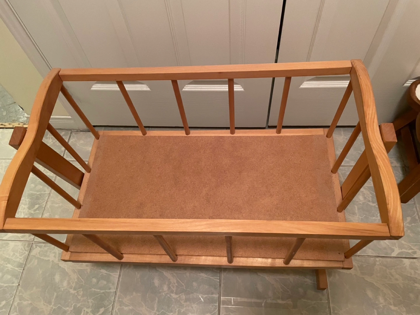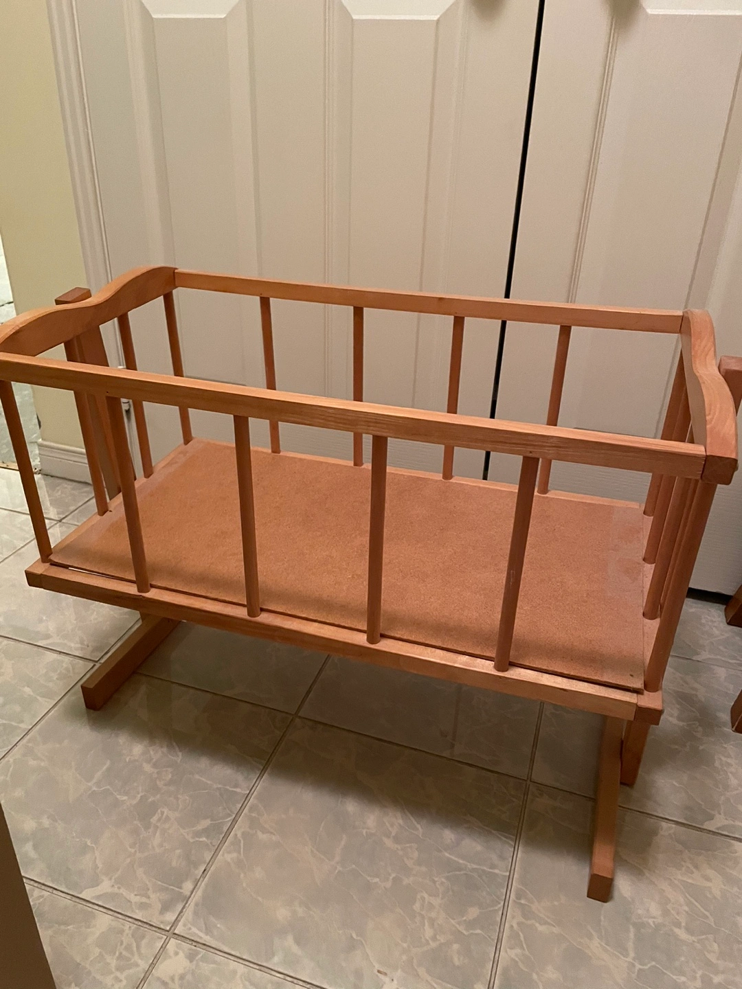 Adorable wooden baby cradle. Light coloured wood. Great for pretend play with dolls.