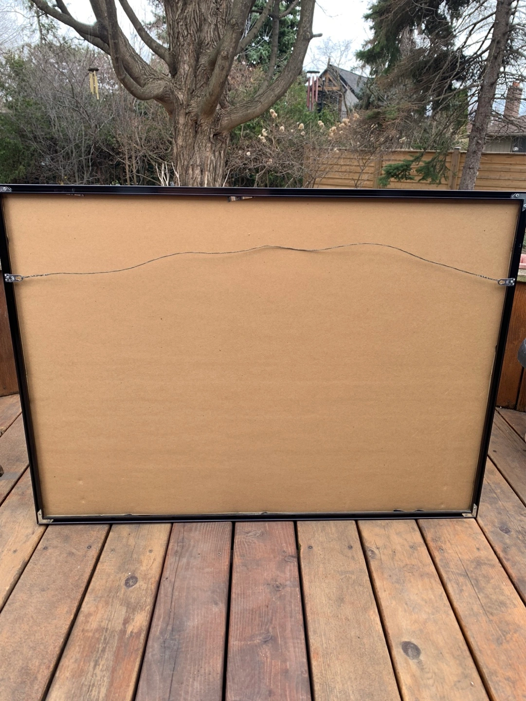 Large gorgeous framed watercolour print featuring pink poppies and purple foliage. Artist is Henry Howells who liked to show abstract florals in his work. It shows some texture throughout the picture. It has a dark green mat and a black metal frame that is ready to hang with a wire on the back. It is signed and dated '90. Measures 29” tall and 40” wide. Would look great over a couch or a buffet! Can deliver in the GTA for $7 extra. Cash only please.