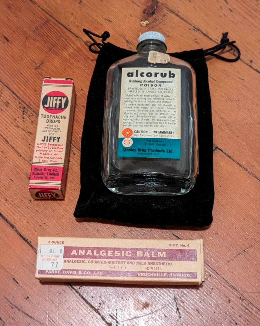 Vintage collection items. Jiffy toothpaste drops in original box with still some left over Analgesic balm in original packaging with more than half a tube. Left. Alcorub rubbing alcohol compound in glass jar, with a quarter of original liquid left. Pick up in the West End of Vancouver