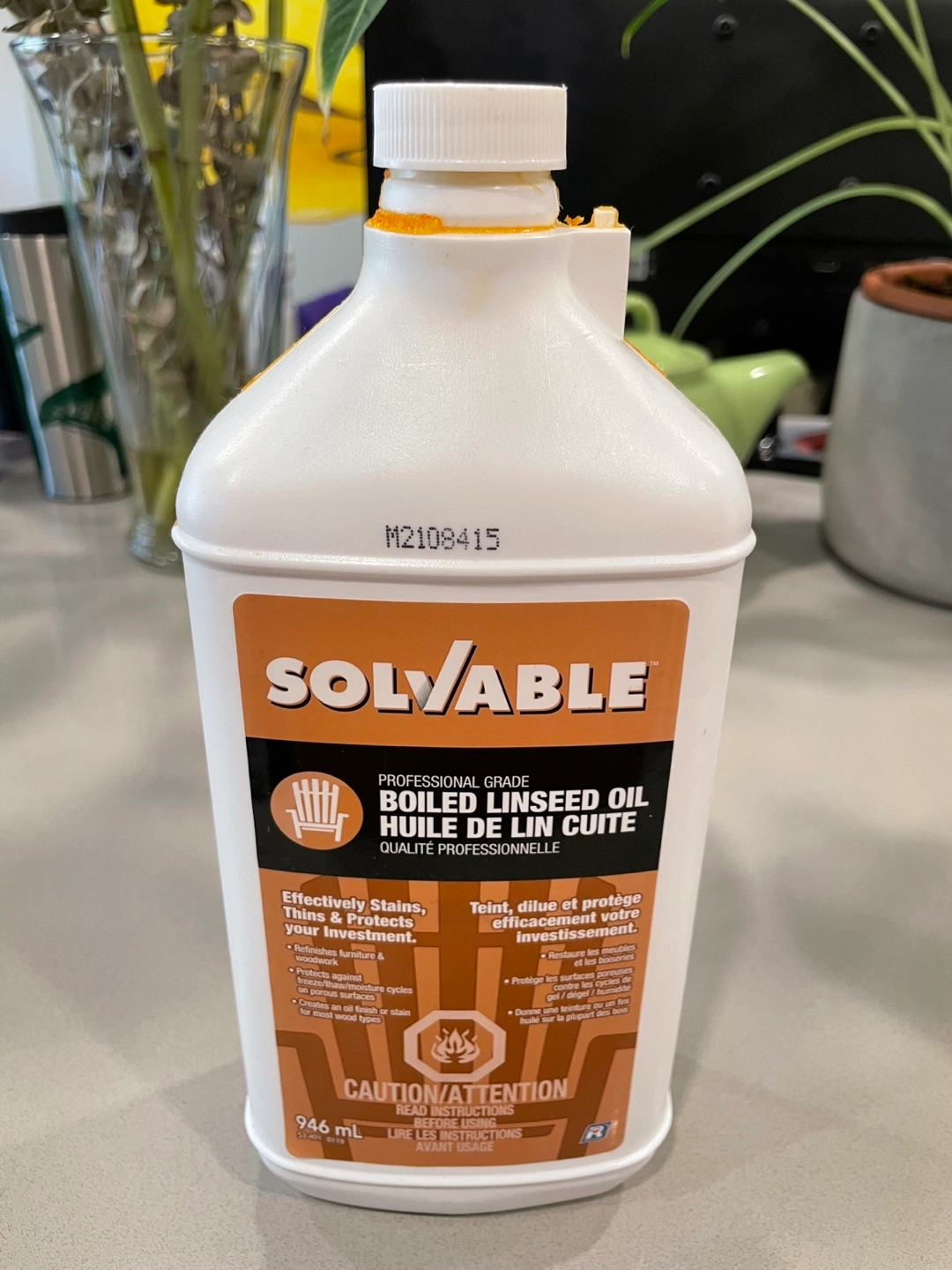 Professional grade boiled linseed oil. 946 ml bottle. Used once, almost full (about where my finger is) $17.89 + tax at Canadian Tire
