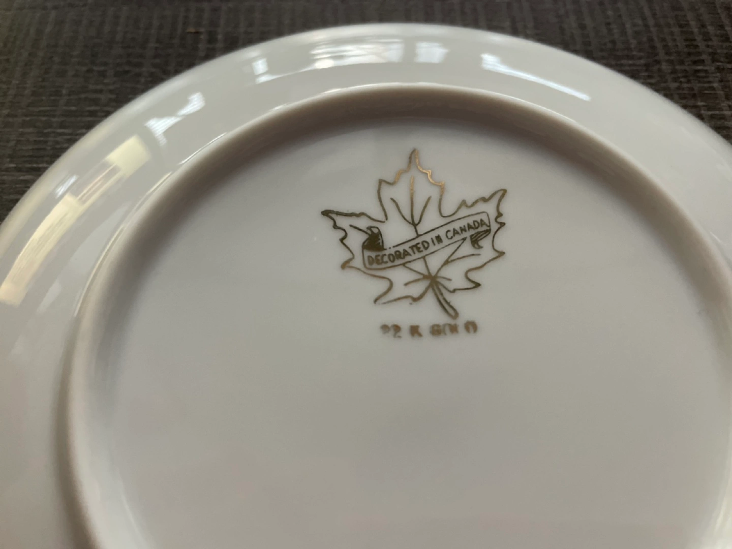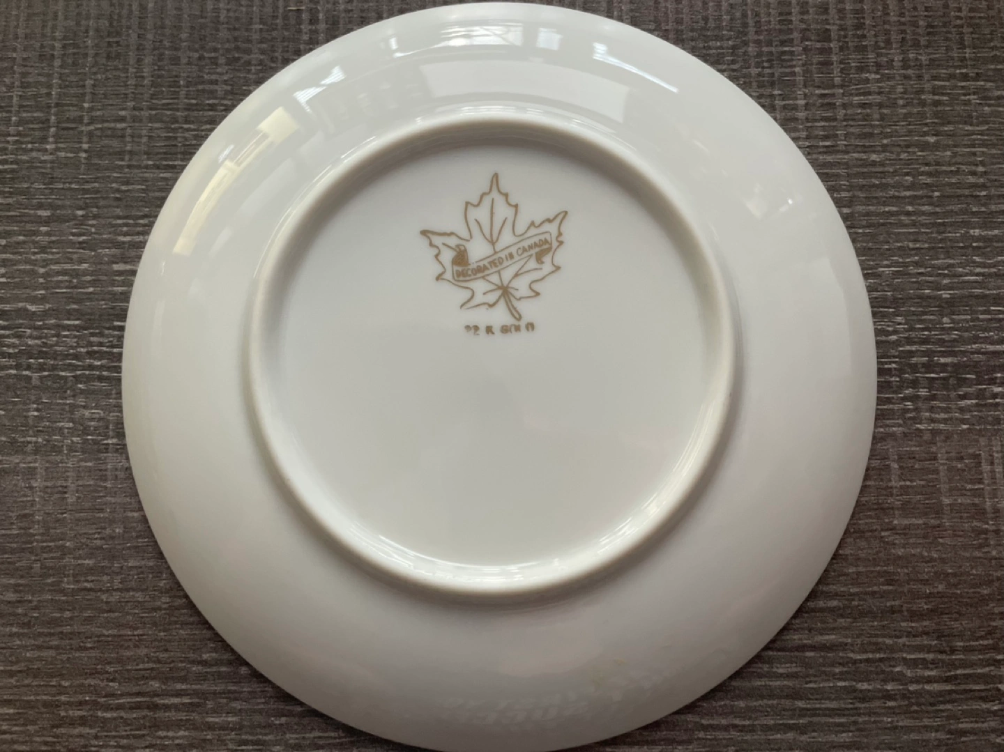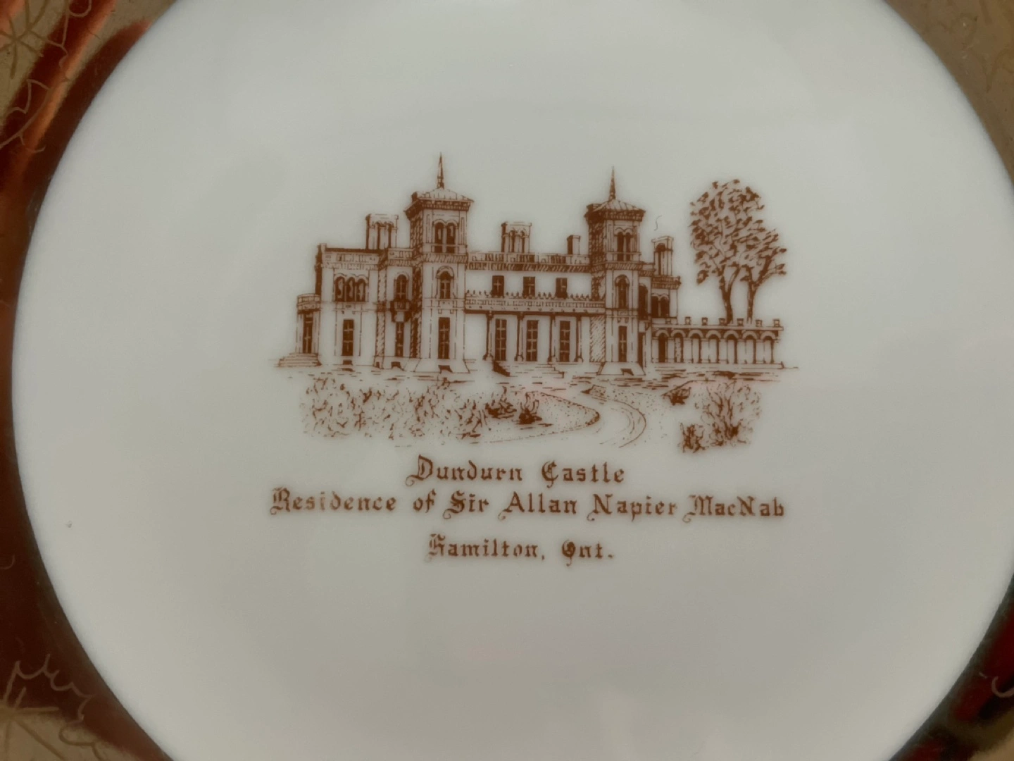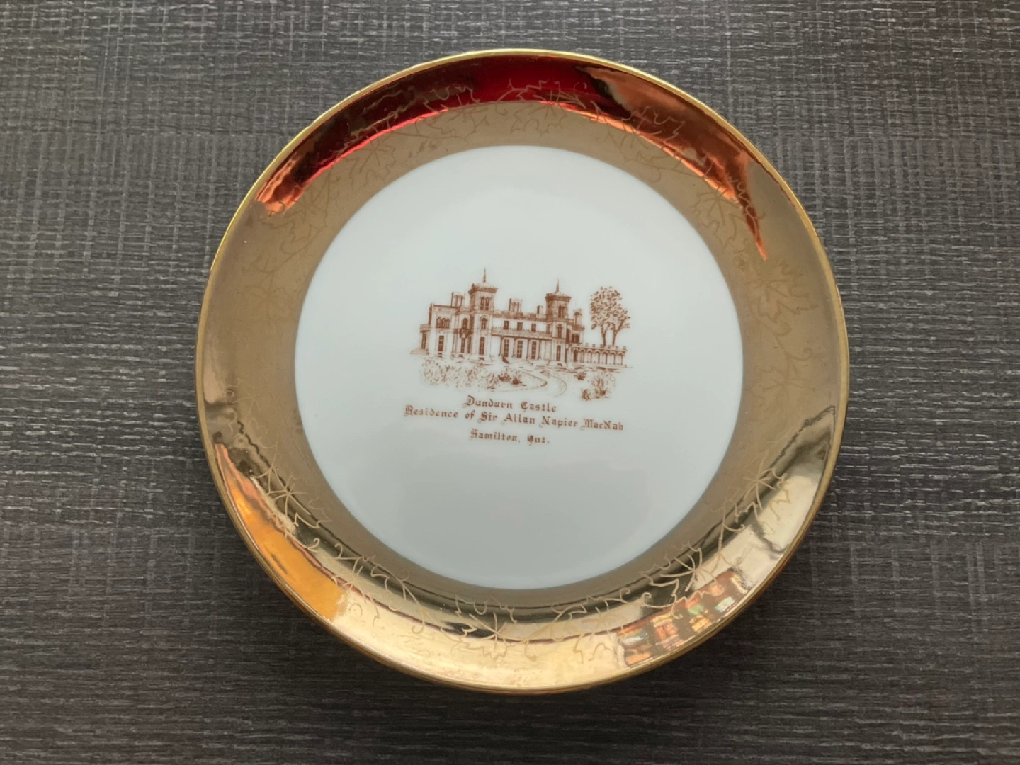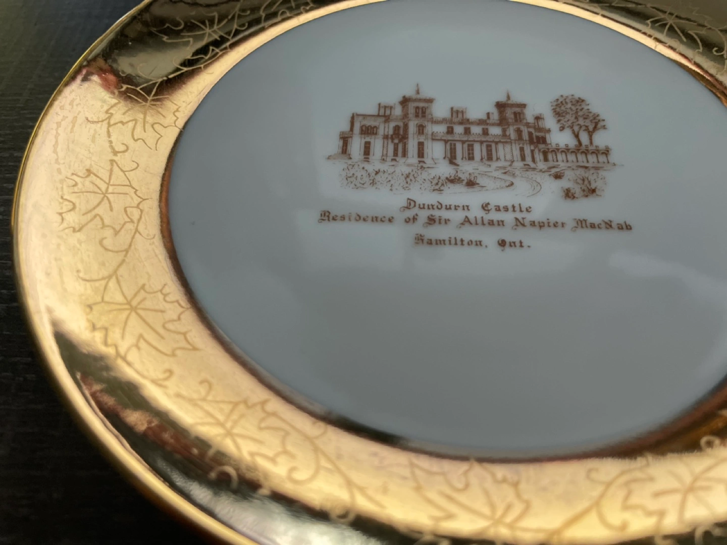 Collectible souvenir plate. Features an image of Dundurn Castle, the residence of Sir Allan Napier MacNab in Hamilton, Ontario. Gold-trimmed edges. Decorated in Canada, with 22k gold. Door pick up only.