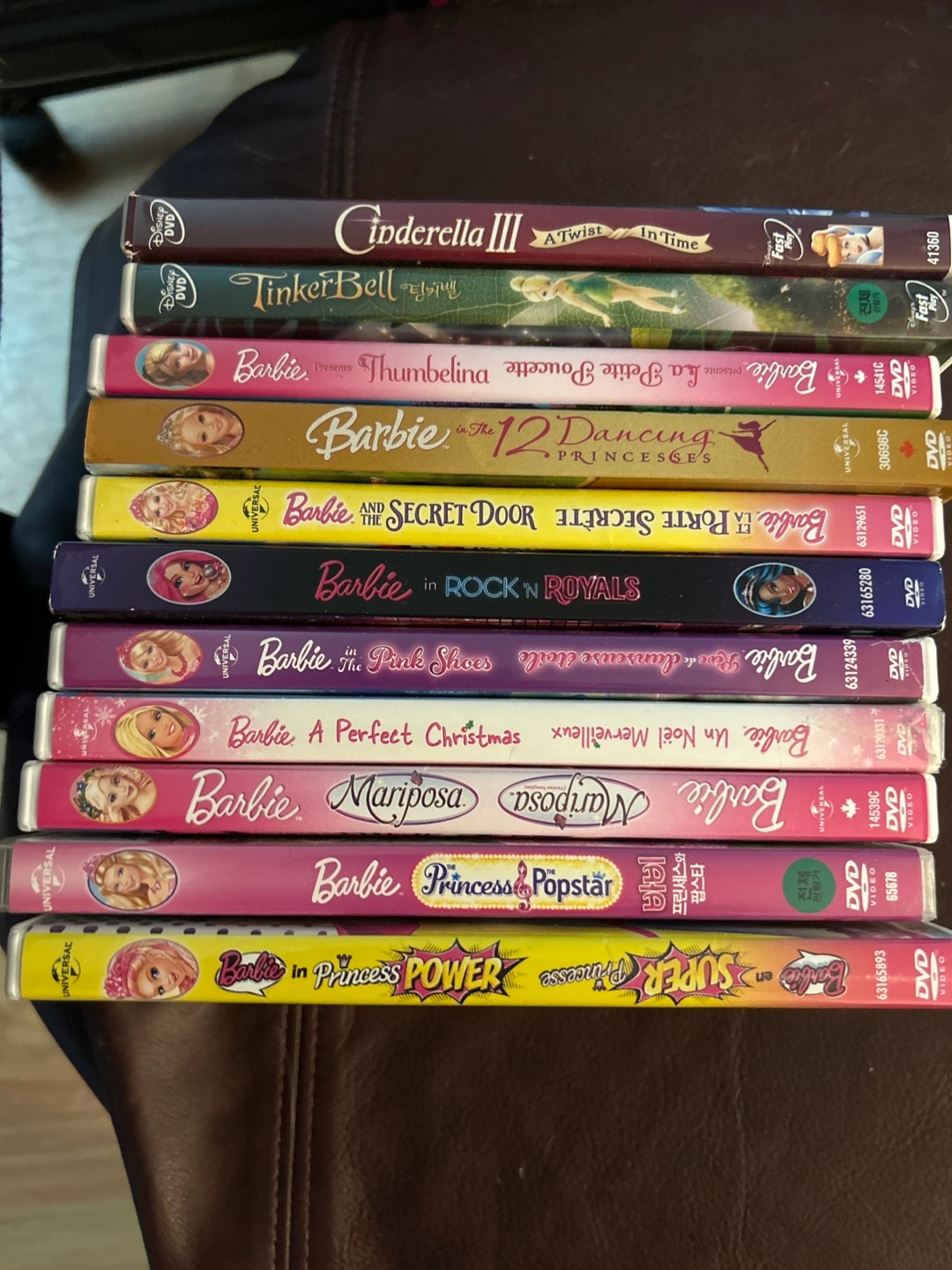 Collection of 11 +DVDs. Includes various Barbie movies and Disney films like Cinderella III and Tinkerbell. Great for kids.