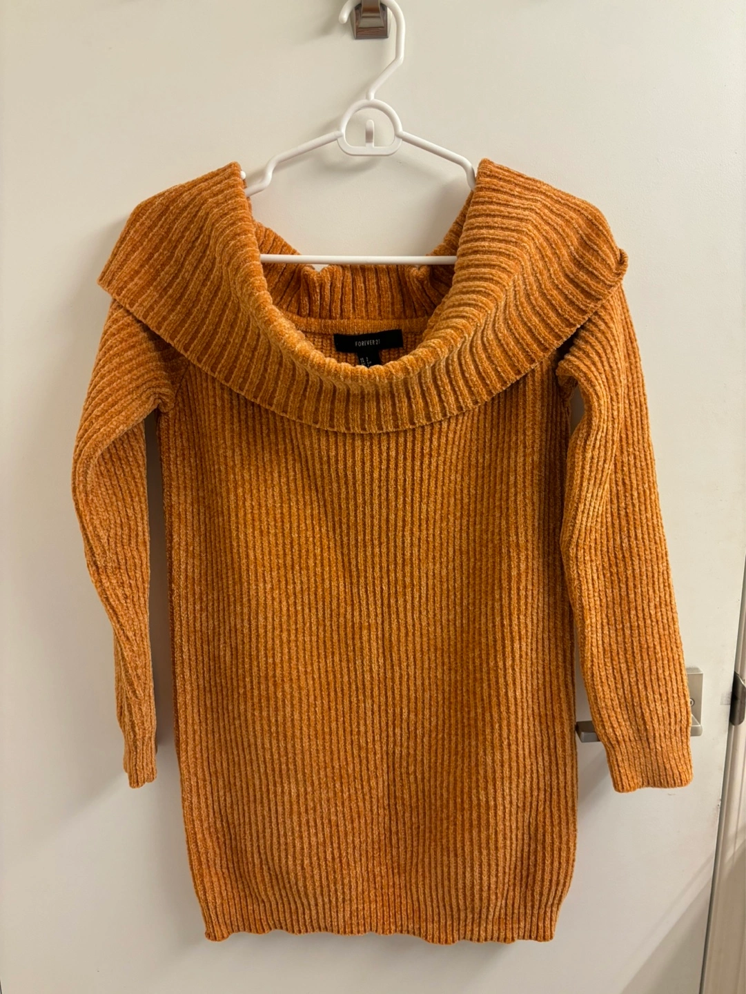Cozy off-the-shoulder sweater. Size Small but fits like a medium. Mustard yellow colour. Long sleeves. Ribbed knit. Relaxed fit.