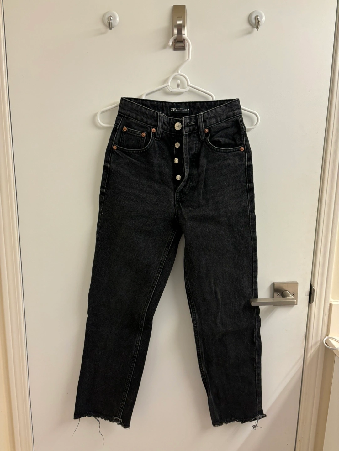Dark wash straight leg jeans. High-waisted. Button fly. Raw hem.