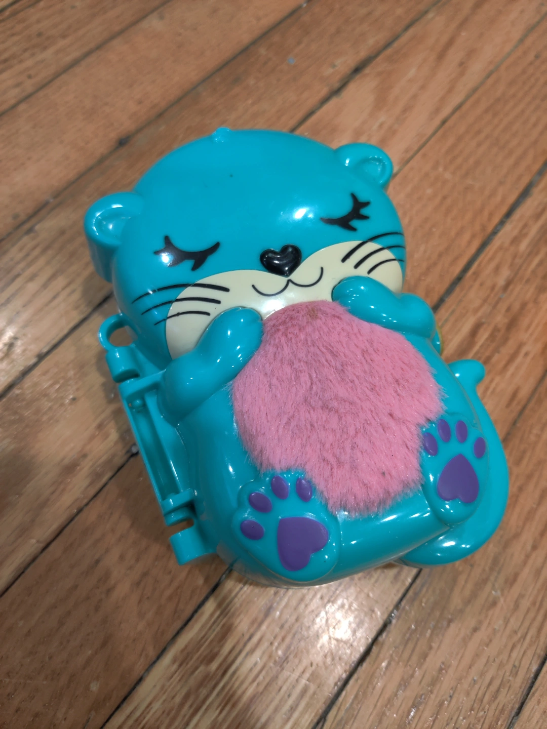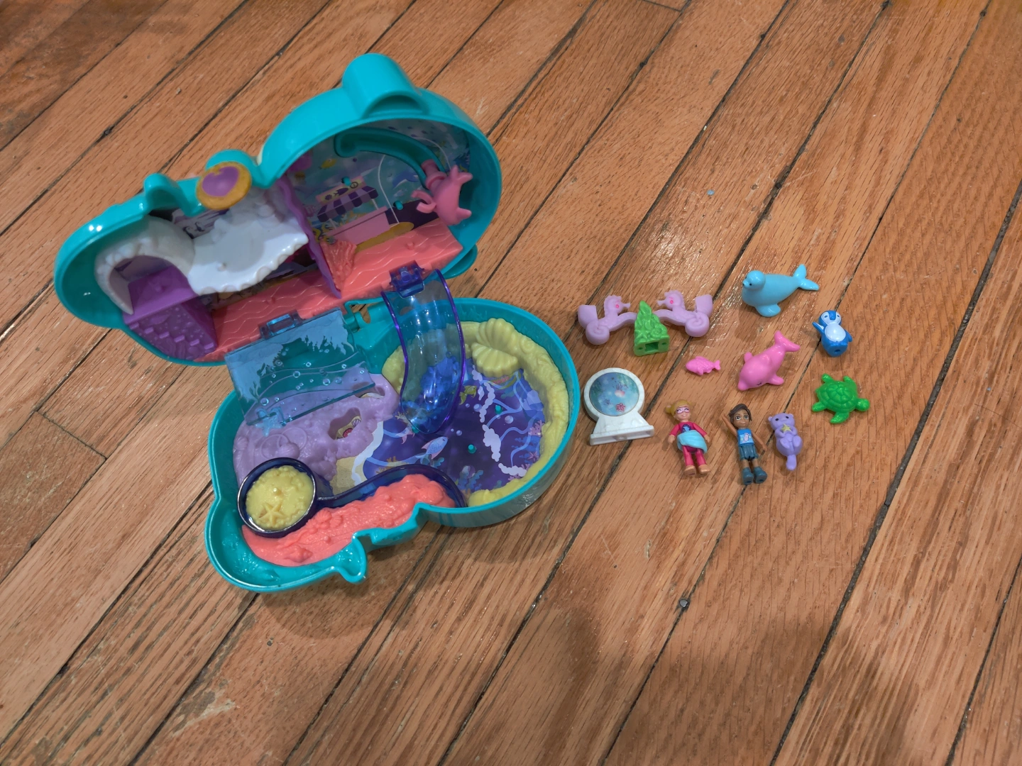cute aquarium-themed Polly Pocket set, with, miraculously, all the little people, sea creatures and accessories still intact! -Polly -Polly's friend, we'll call them "Taylor" -teeter totter -ferris wheel -x2 pink dolphin -otter -penguin -sea lion -sea turtle -sea horse -crab -polly's little beach wrap