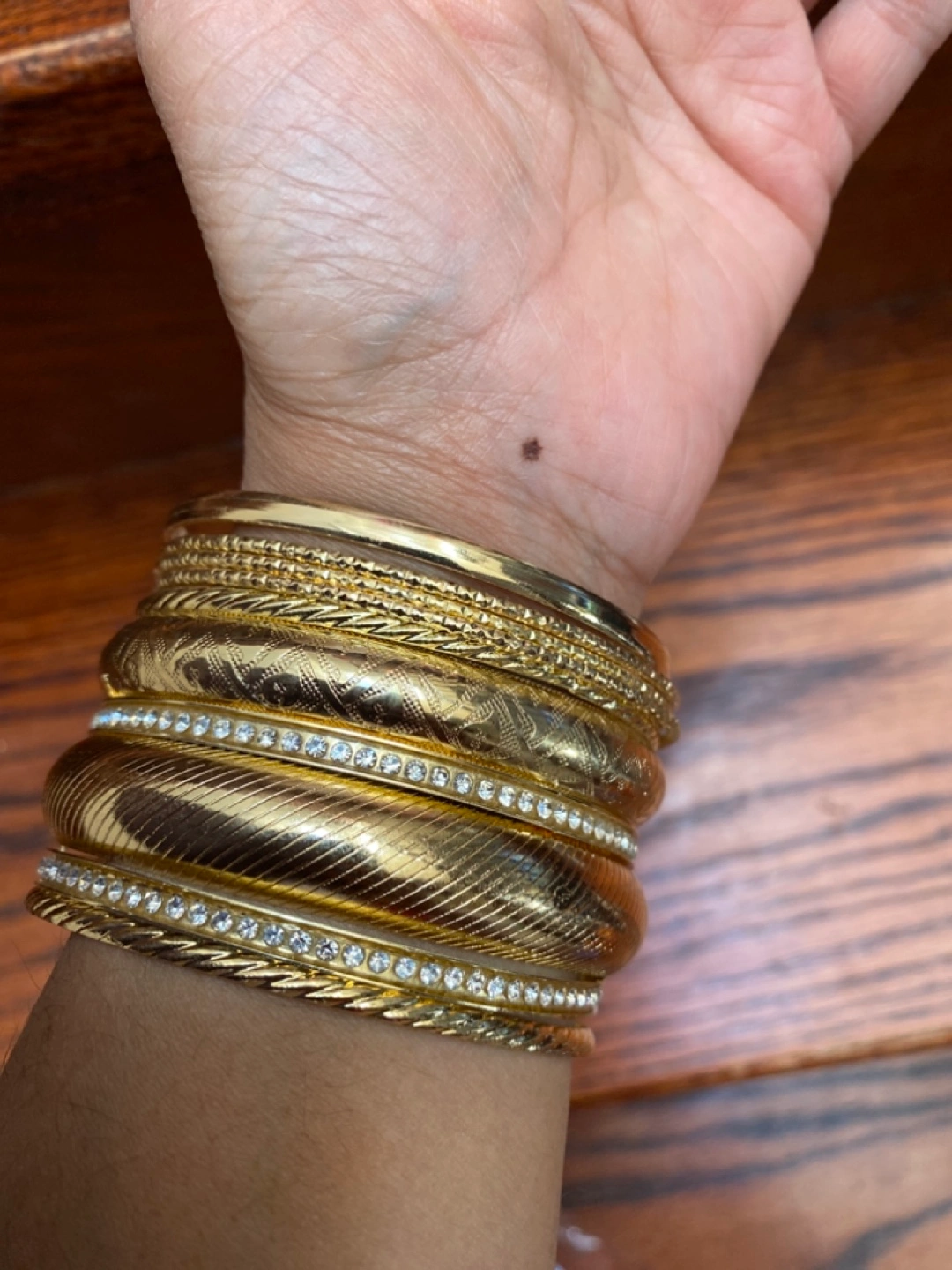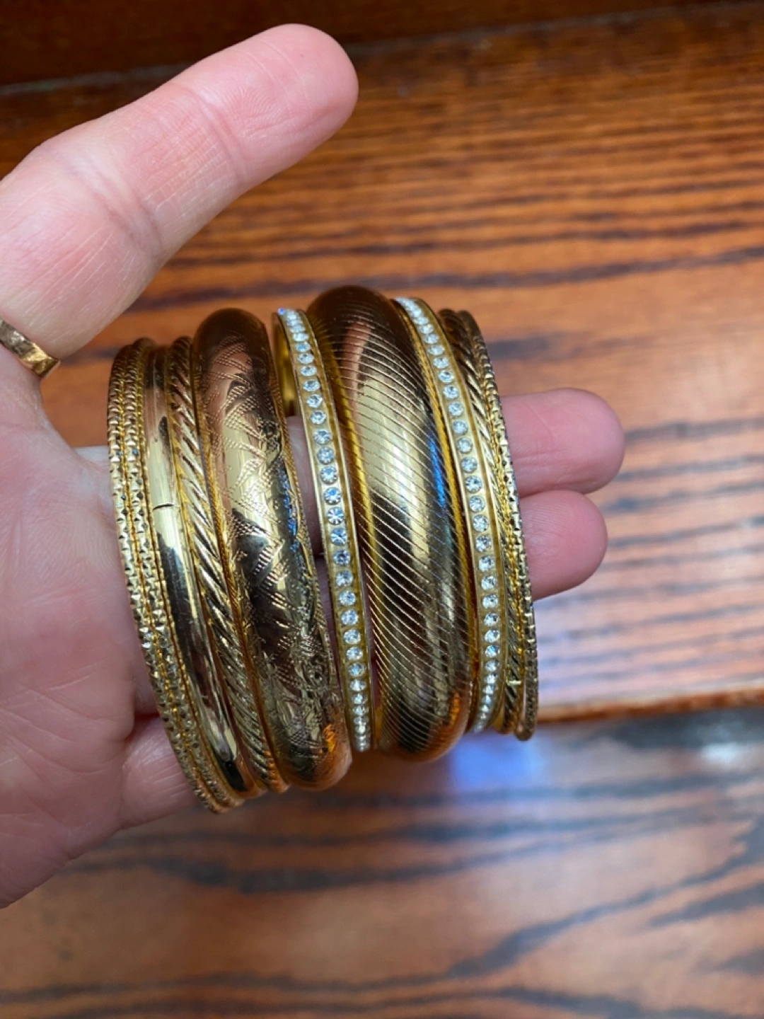 Eight gold bangles. Various designs. Some feature rhinestones. Great for layering. Cash only