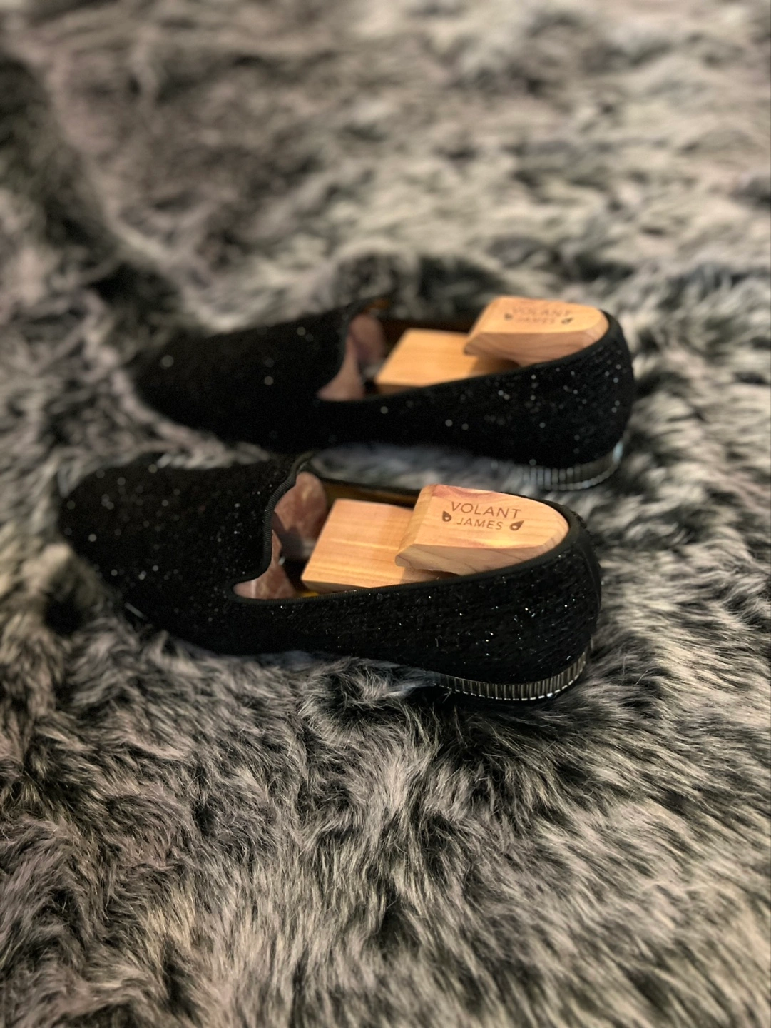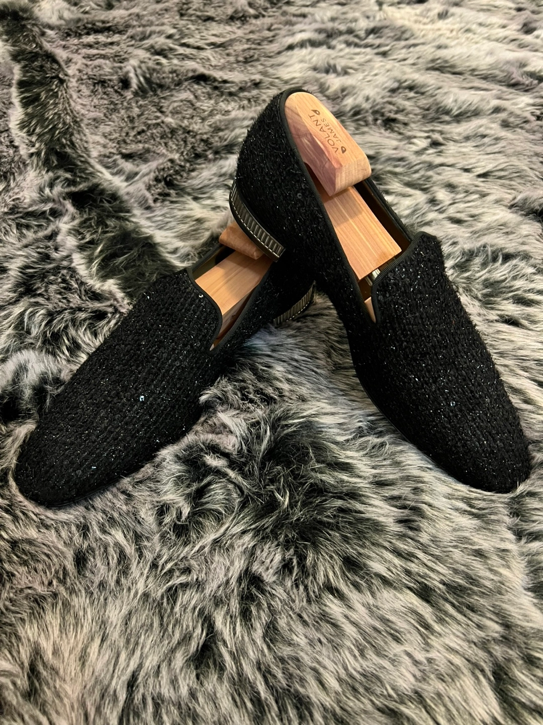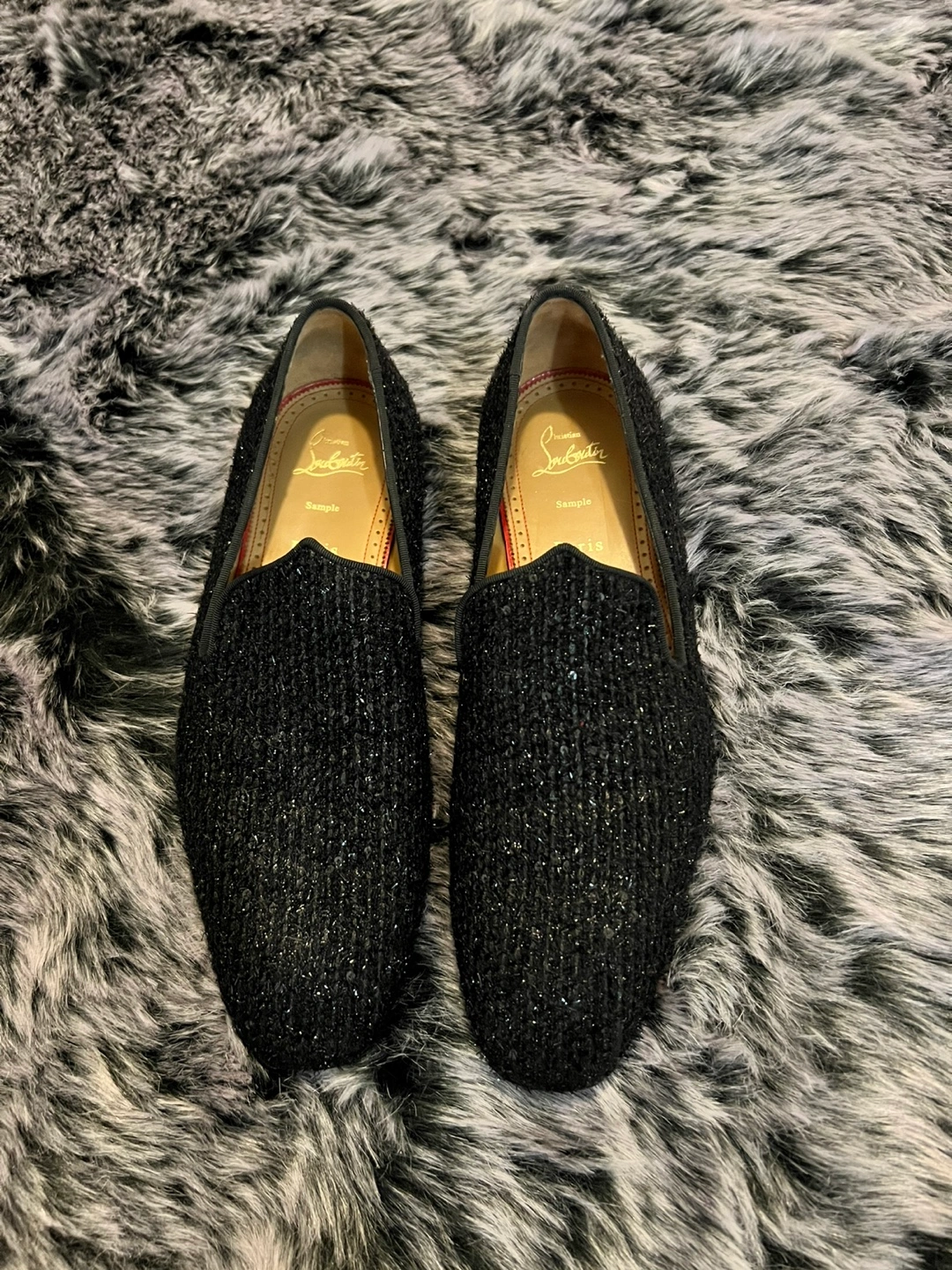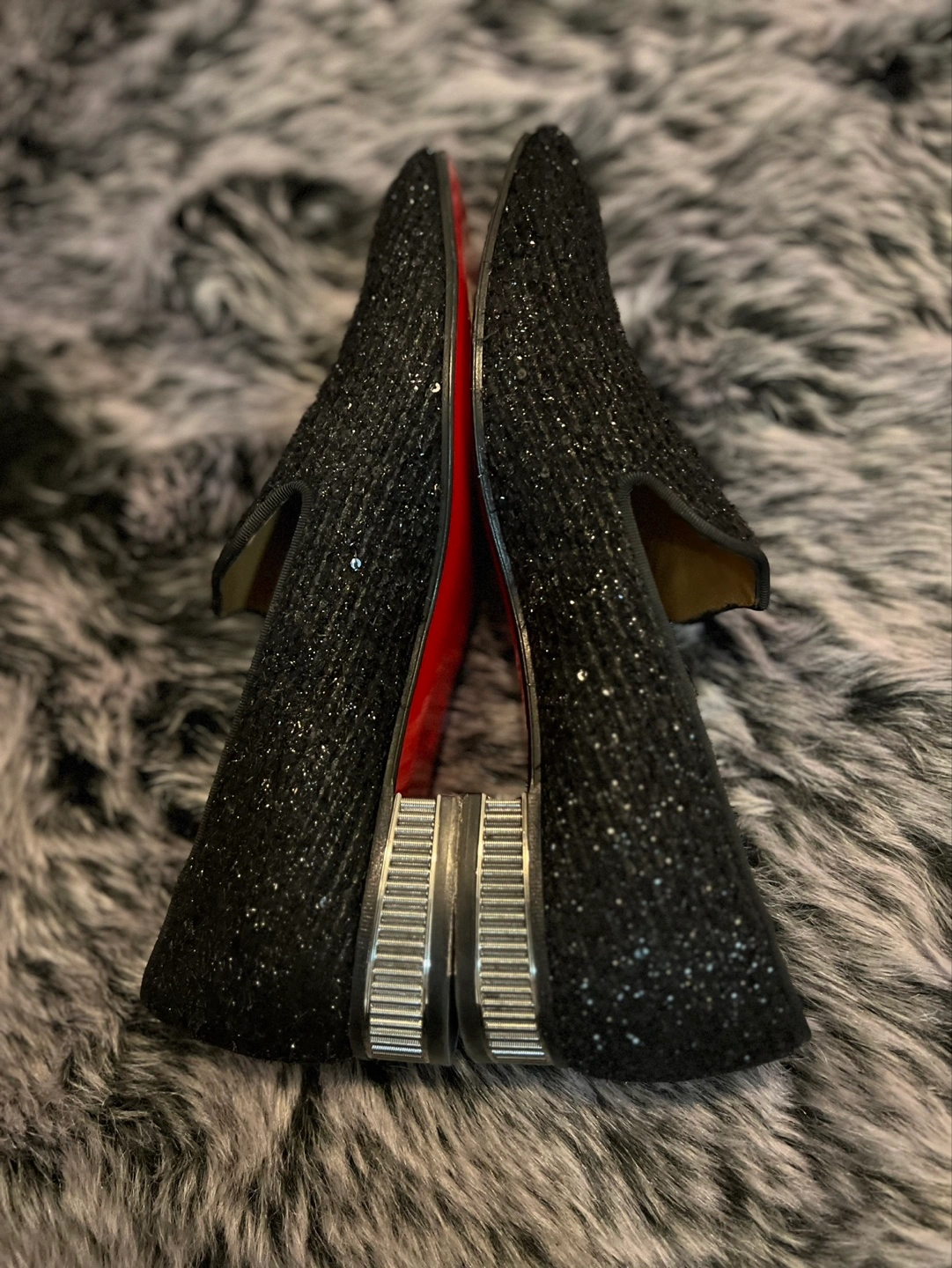 Authentic Christian Louboutin Pair of black sparkly loafers. Silver-toned heel detail. Sample store piece in excellent condition. Over $1200 retail price. Serious buyers only. Price is firm.
