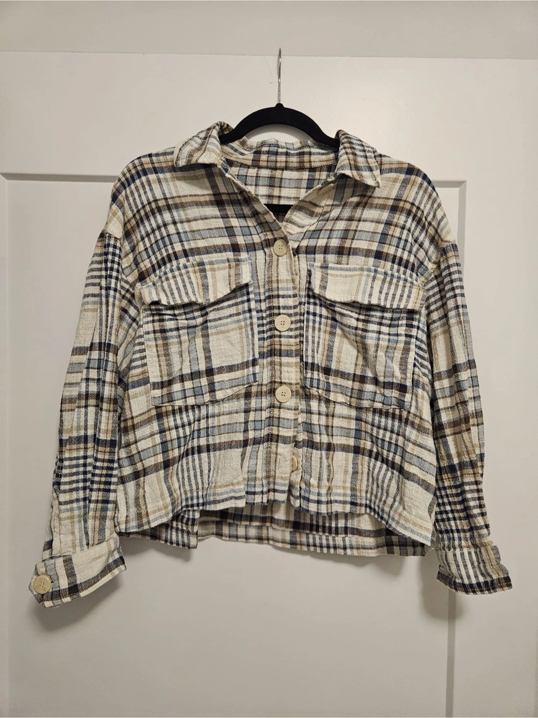 Women's cropped button-up shirt. Features a plaid pattern in beige, blue, and brown. Long sleeves and two chest pockets. Relaxed fit.