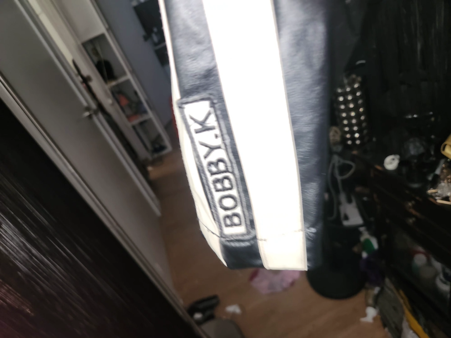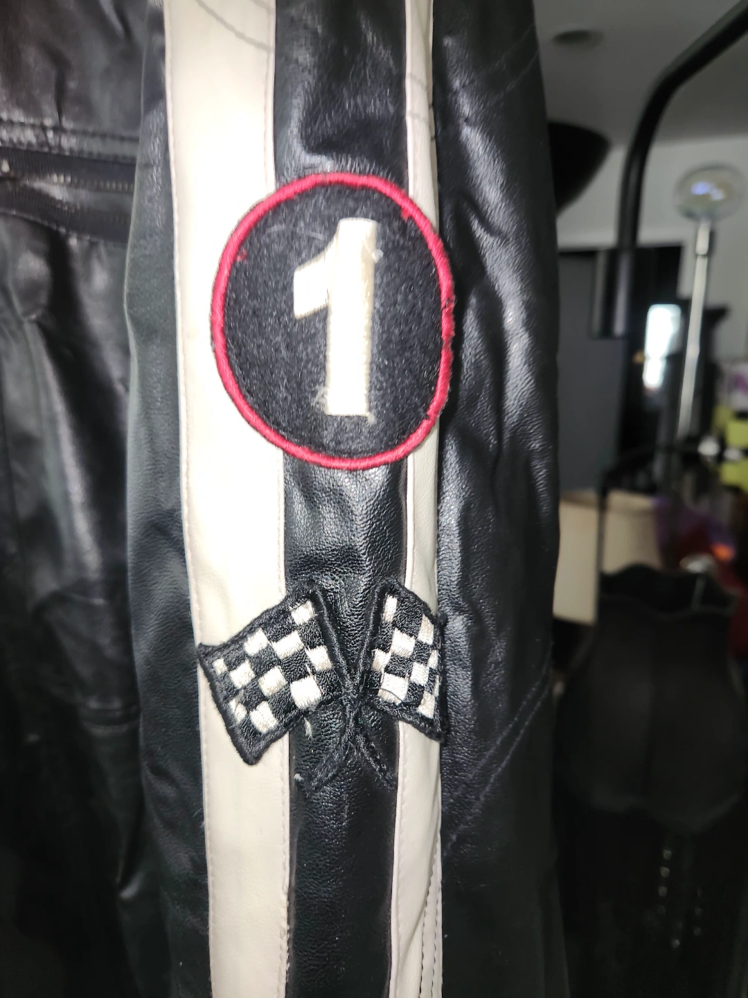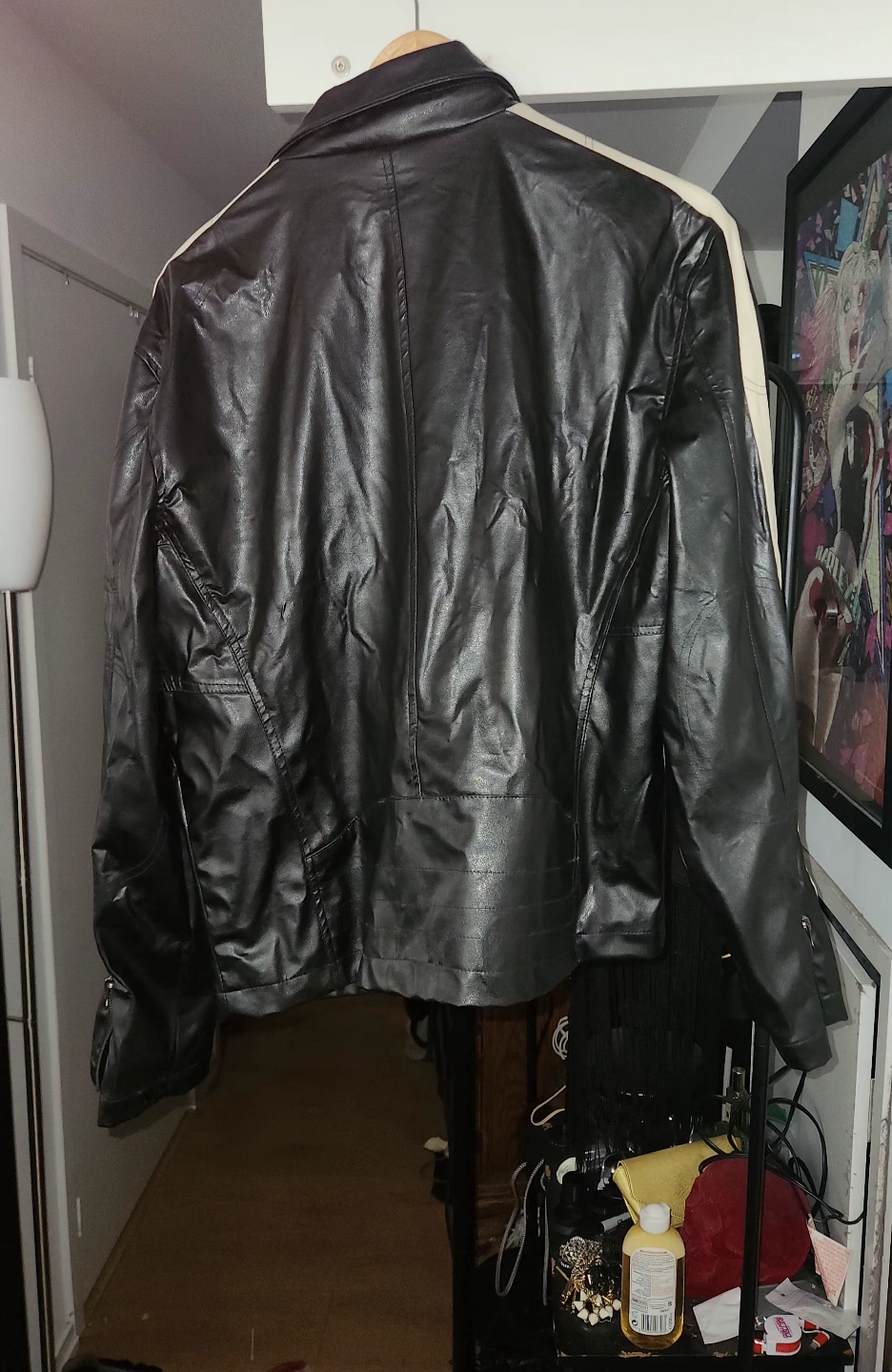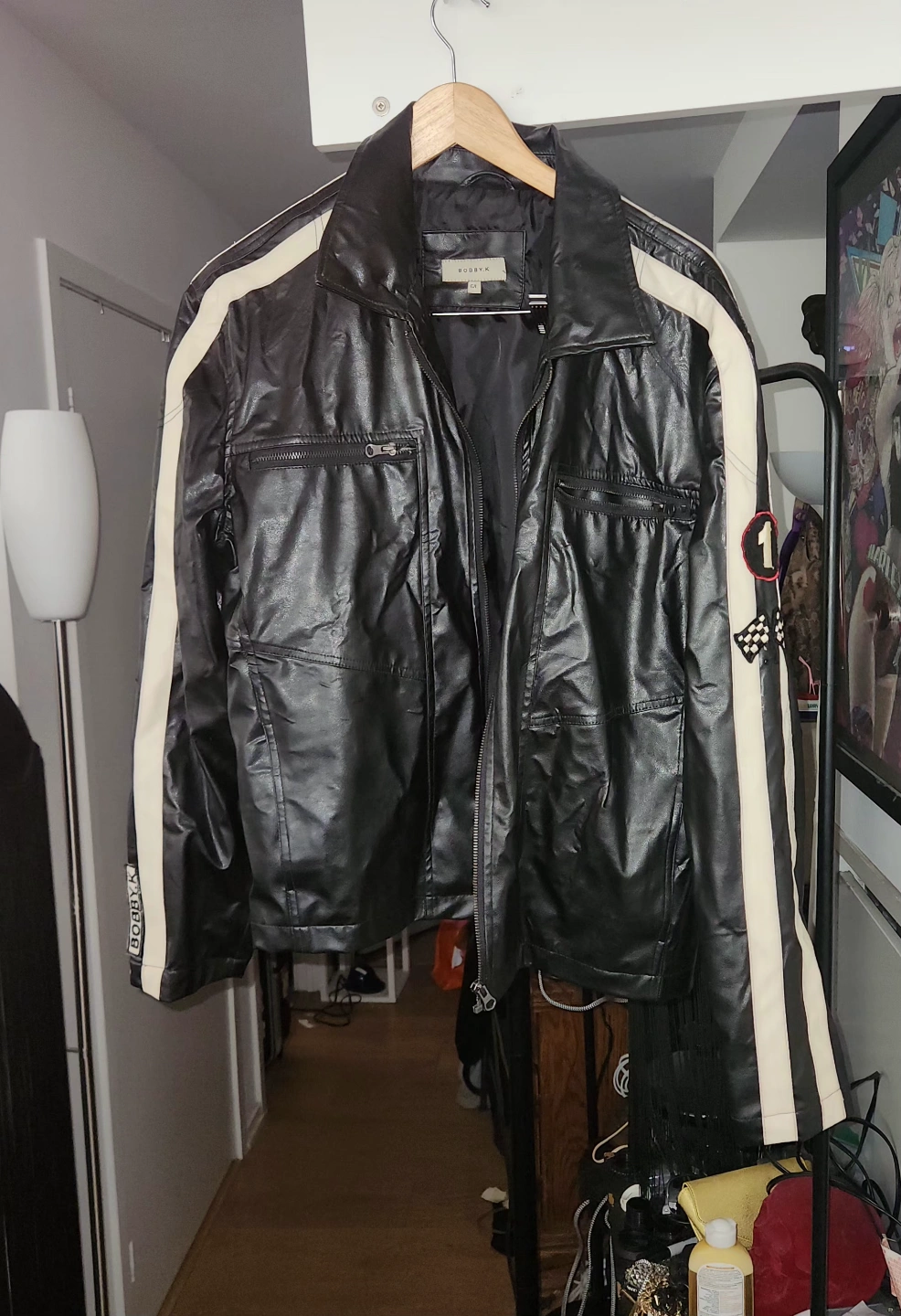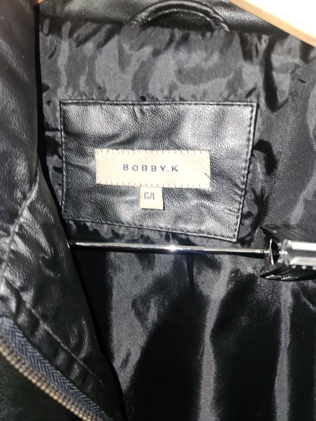 Bobby K Black leather racing jacket. Features racing stripes and patches. Size large. Zipper closure. Like New condition. * Cash Only * * No E-transfers * * Pickup Only * * Serious Offers Only *