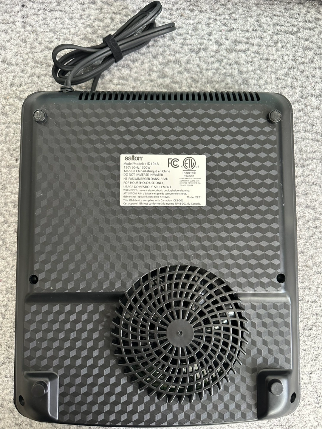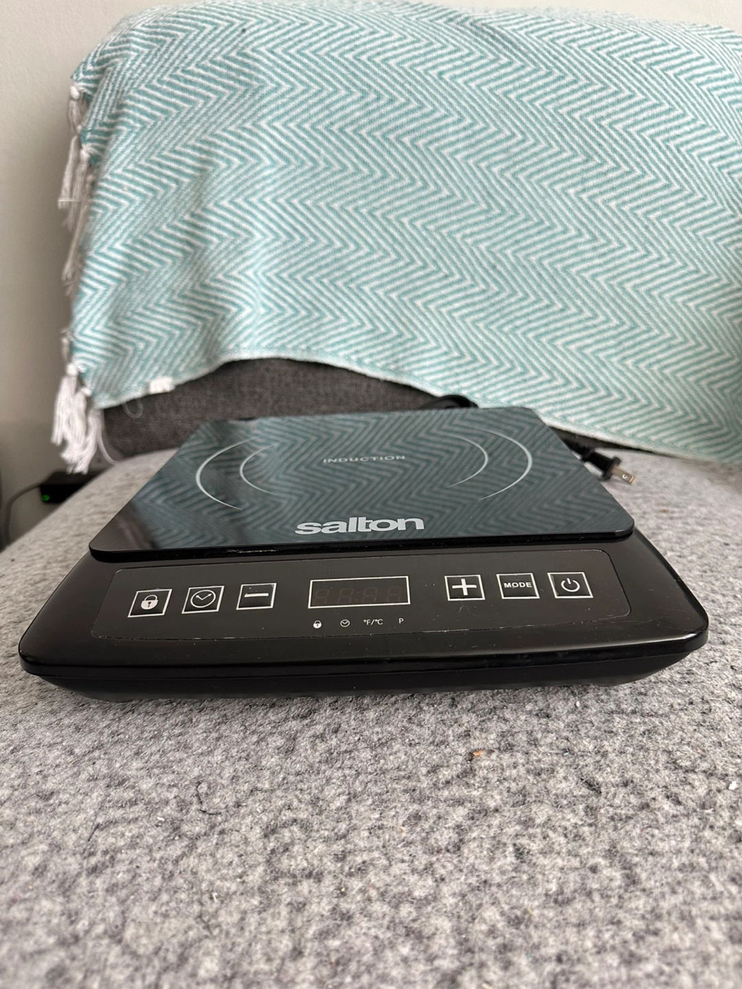 Single burner induction cooktop. Black colour. Features digital controls, timer function, temperature settings in Celsius and Fahrenheit. Power cord included.