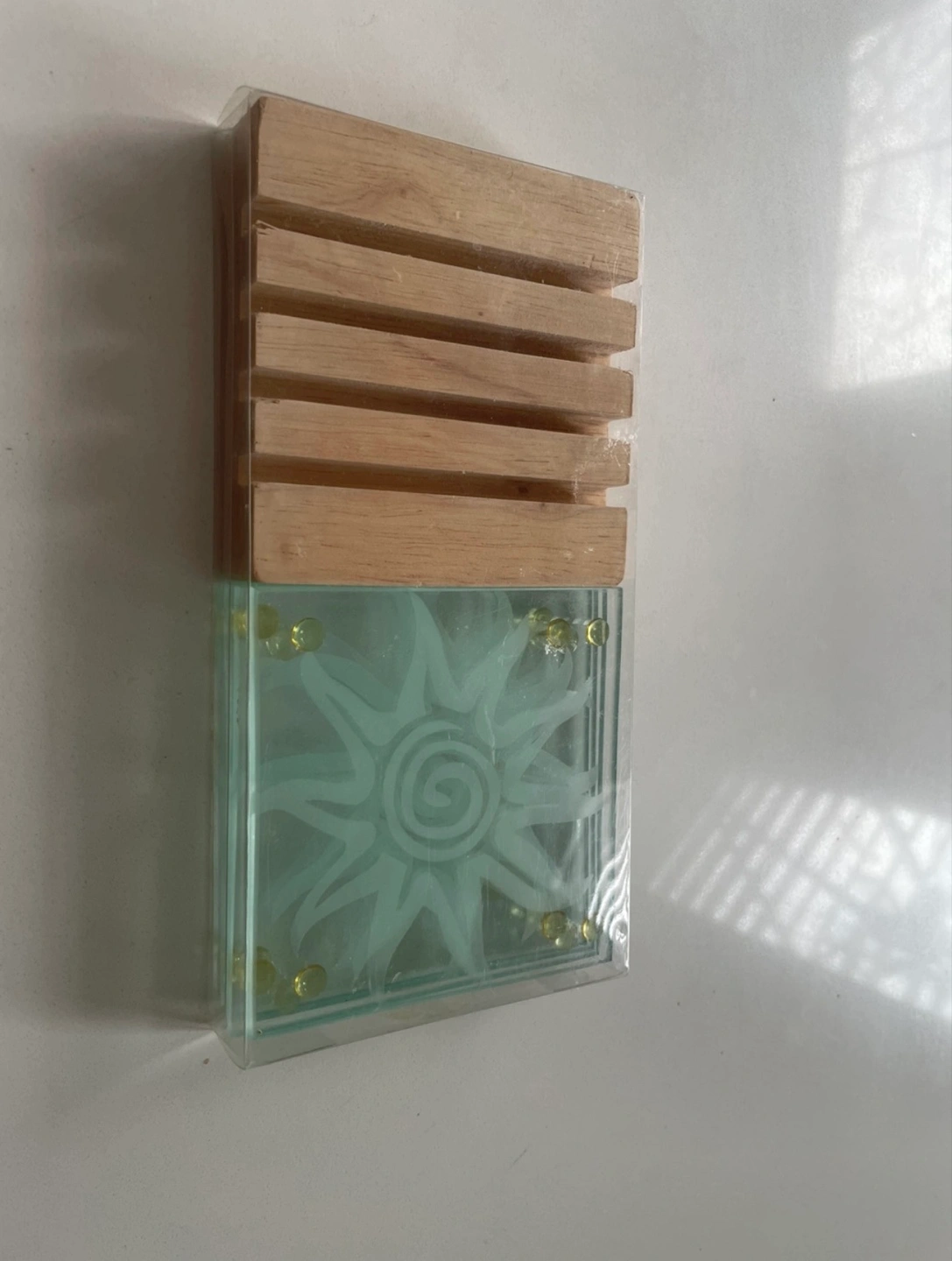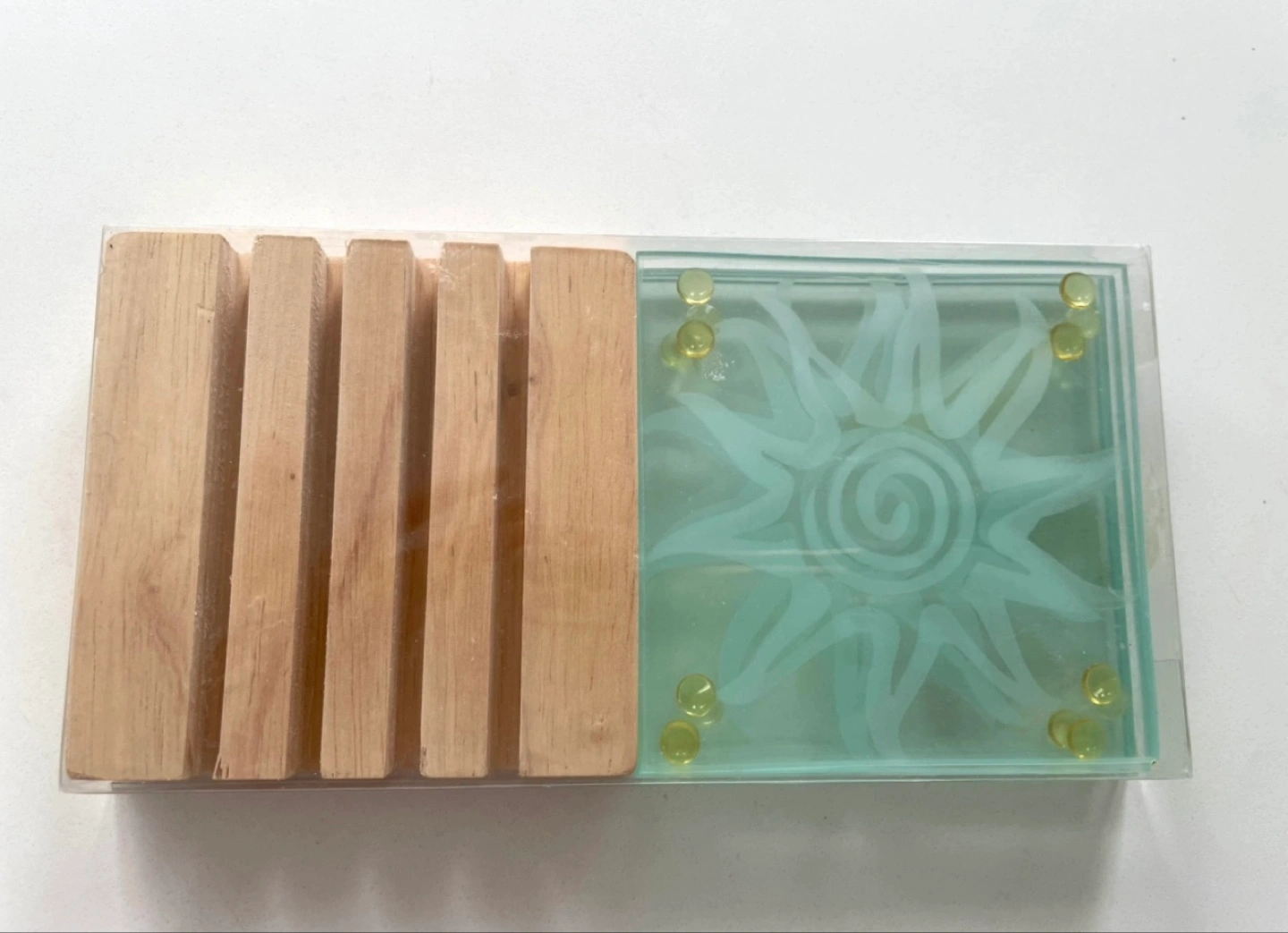 Set of four glass coasters. Features a sun design. Wooden holder included. New, in packaging.