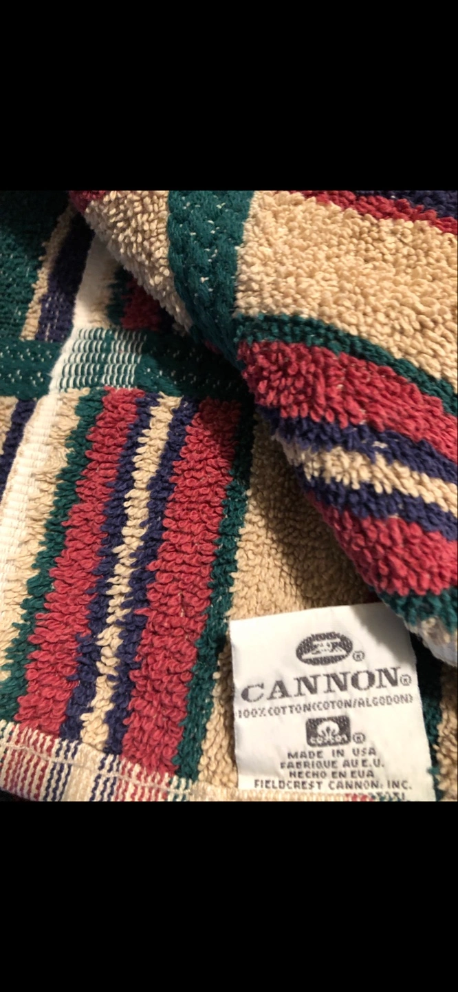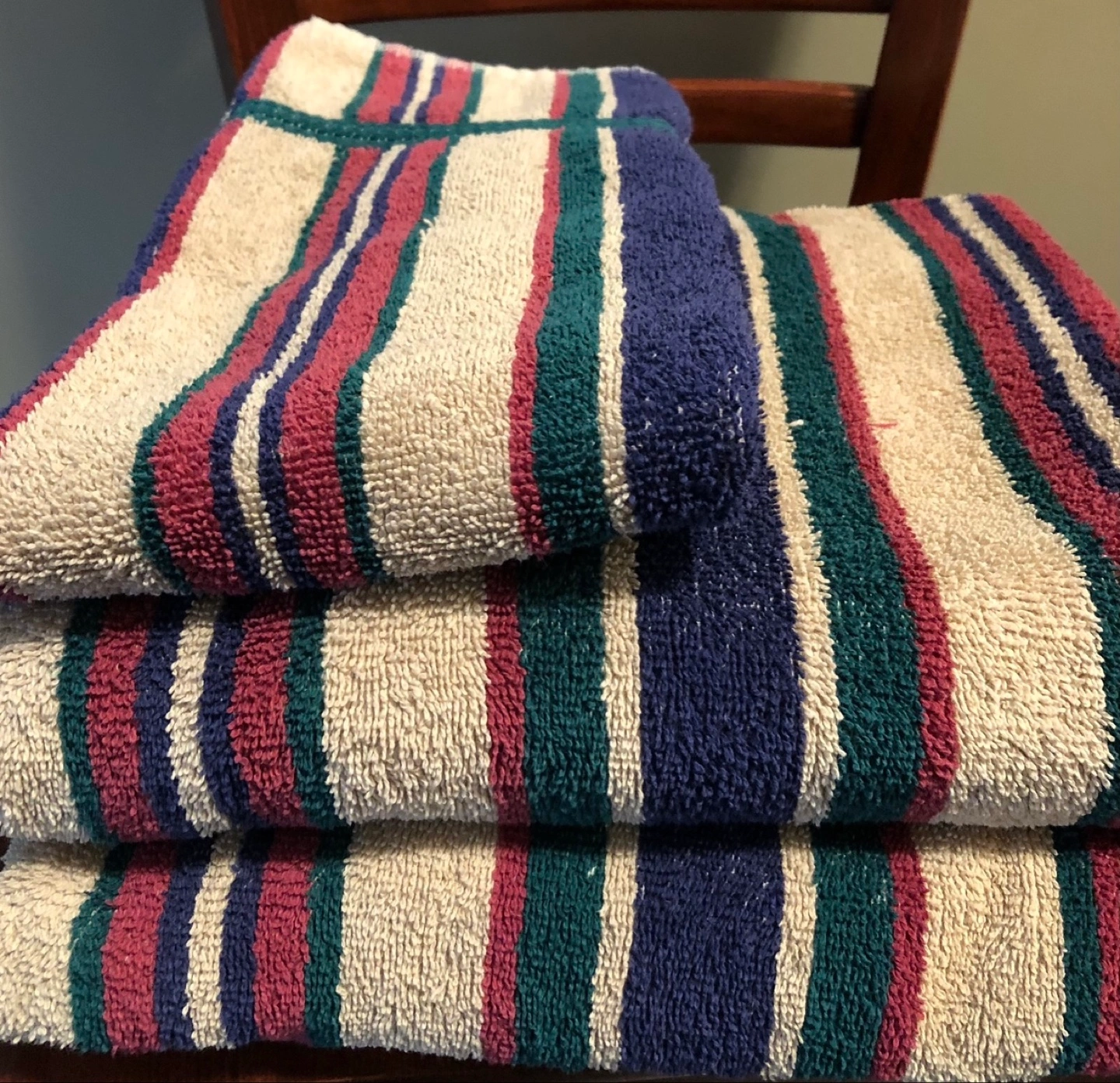 Three striped bath towels. Multicoloured stripes, beige, burgundy, dark green and navy. 100% cotton.