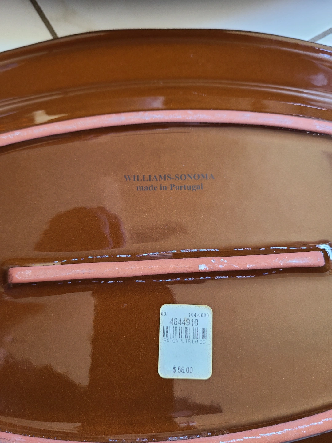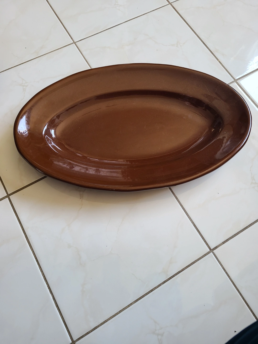 Large brown oval platter. Made in Portugal. Great for serving appetizers or other dishes. 2 available. No cracks or chips. Price is per unit. Thanks.