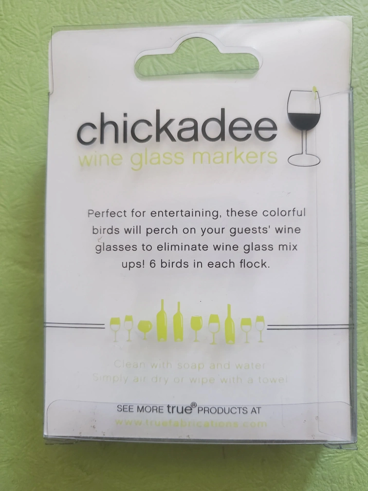 Colorful bird-shaped wine glass markers. Perfect for parties. Eliminate wine glass mix-ups. Six markers per package. Clean with soap and water, air dry or wipe with a towel.