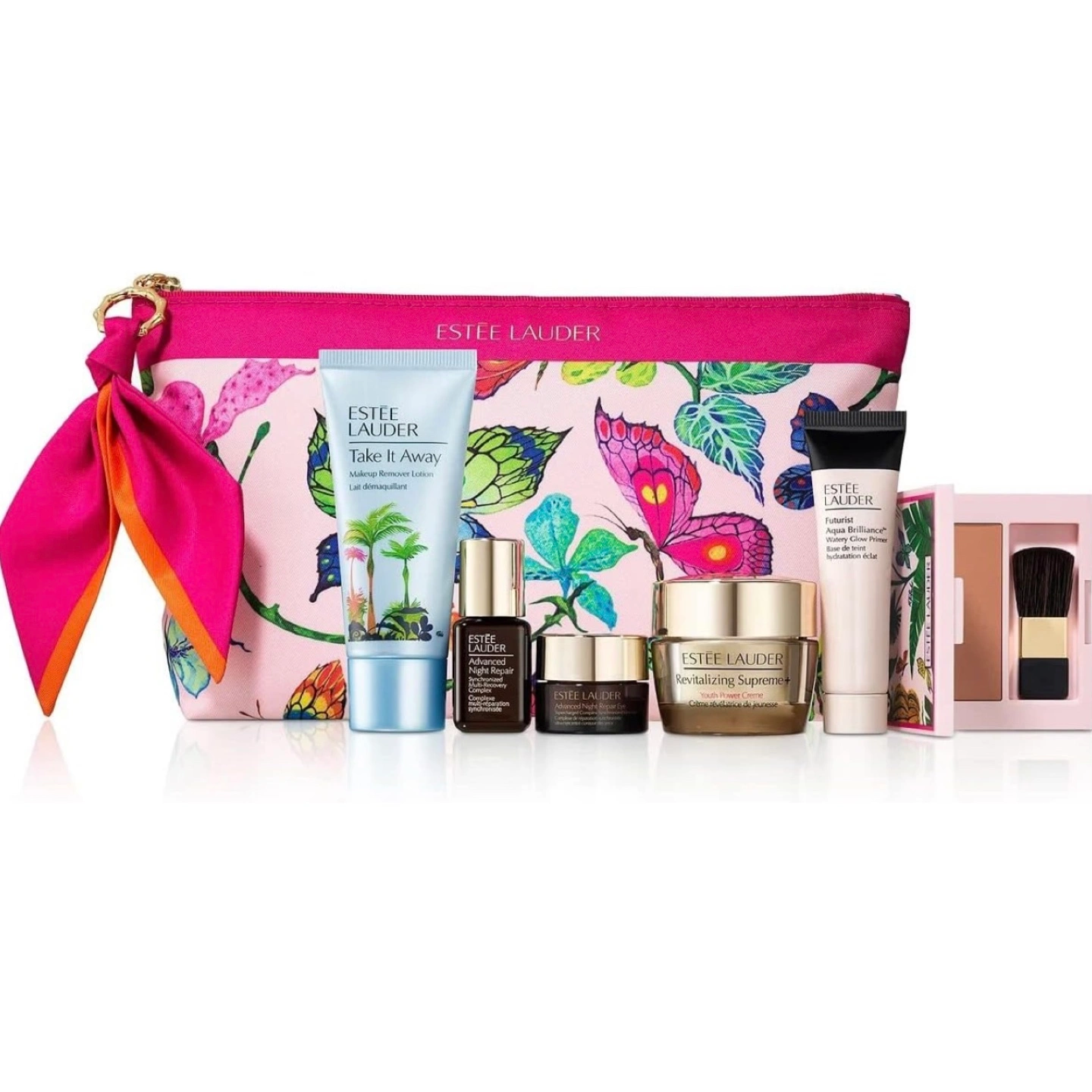 Beautiful Estée Lauder gift set. Includes various skincare products and a vibrant butterfly-print cosmetic bag. Perfect for travel or personal use. Samples and travel sizes included. * Revitalizing Supreme+ Youth Power Creme 0.5OZ / 15ml * Take It Away Makeup remover lotion * Advanced Night Repair Eye Supercharged Complex & Advanced Night Repair Synchronized Multi-Recovery Complex Synchronized Recovery - 0.17OZ/ 5ml * Futurist Aqua Brilliance Watery Glow Primer - 0.5 Oz/ 15ml * Bronze Goddess Powder Bronzer in 02 Medium